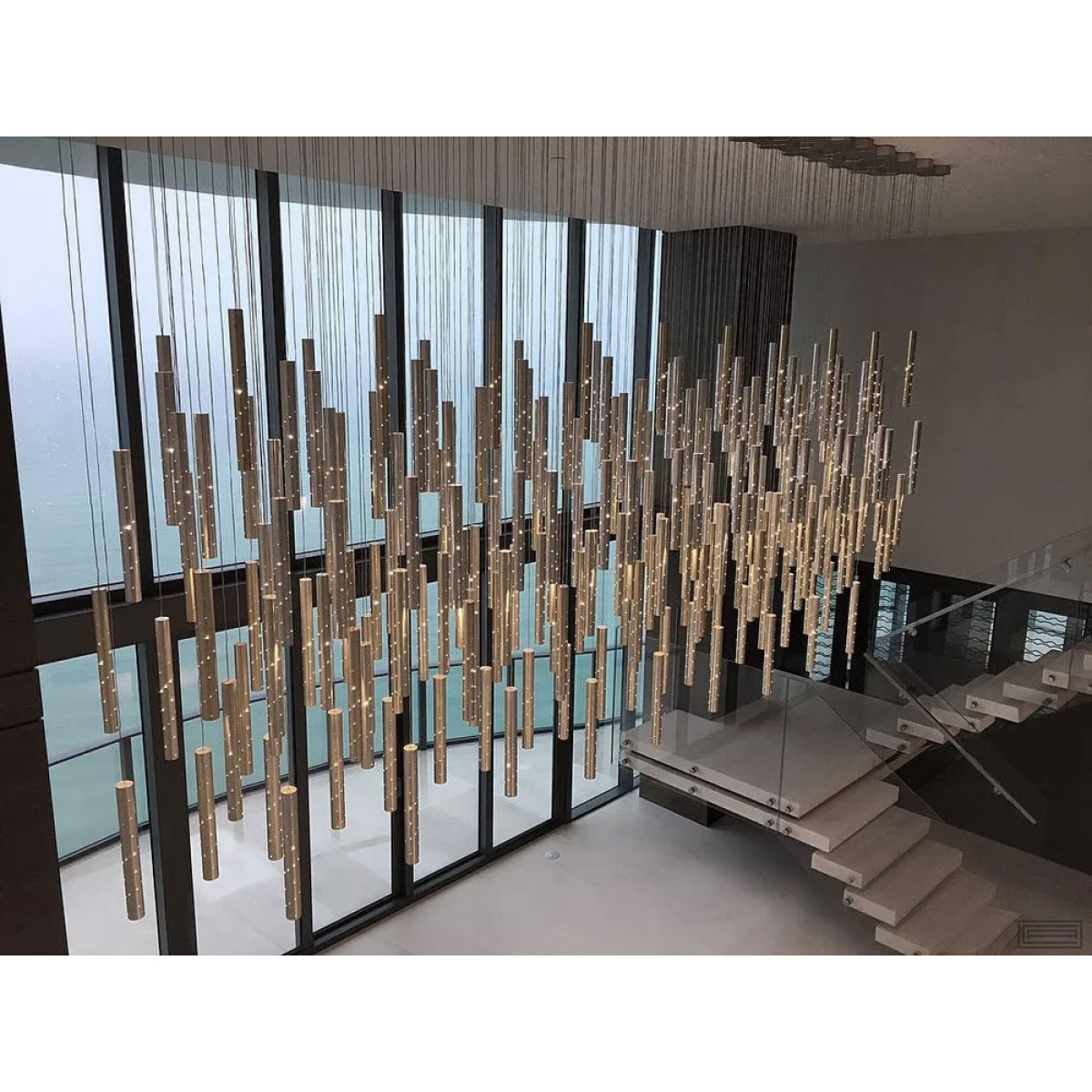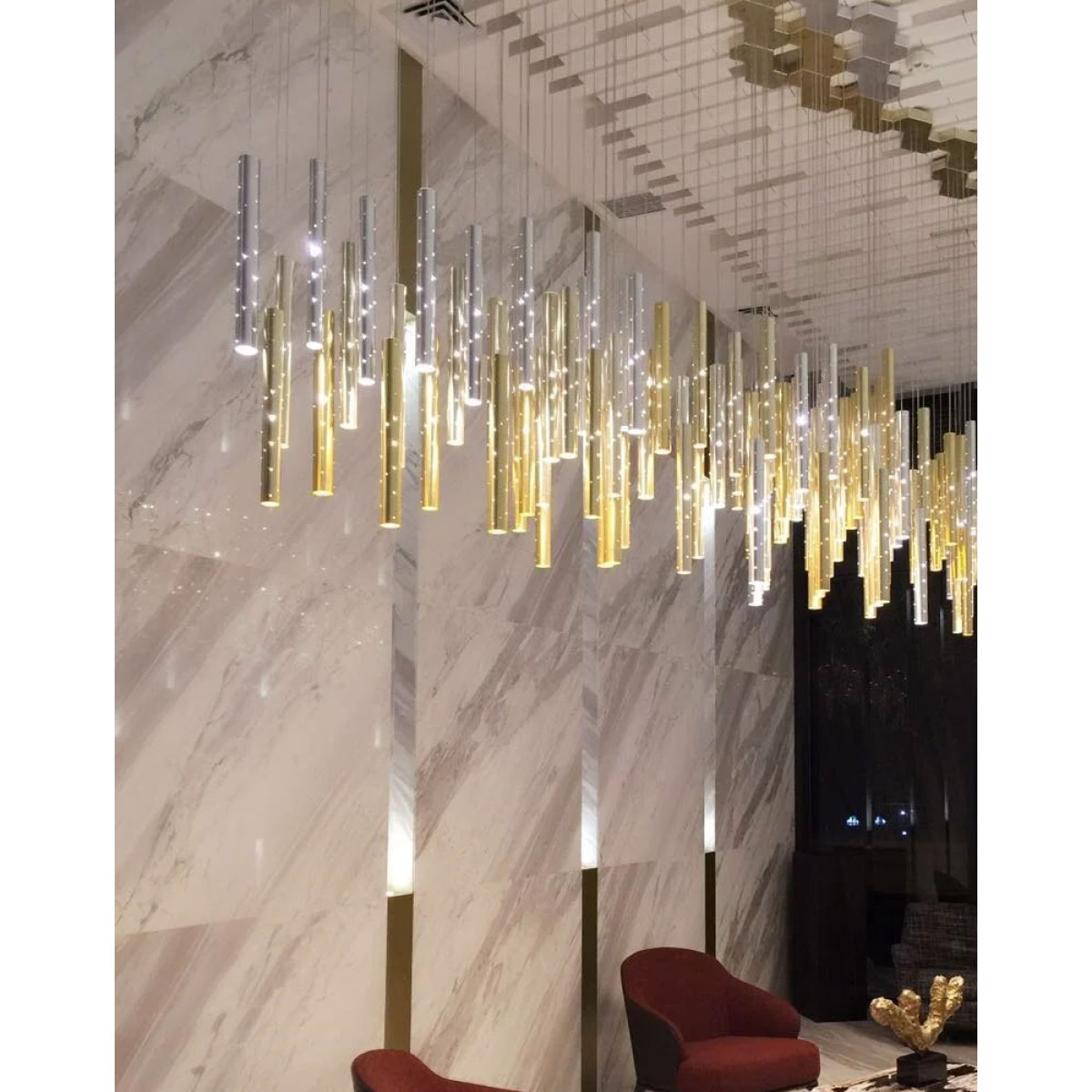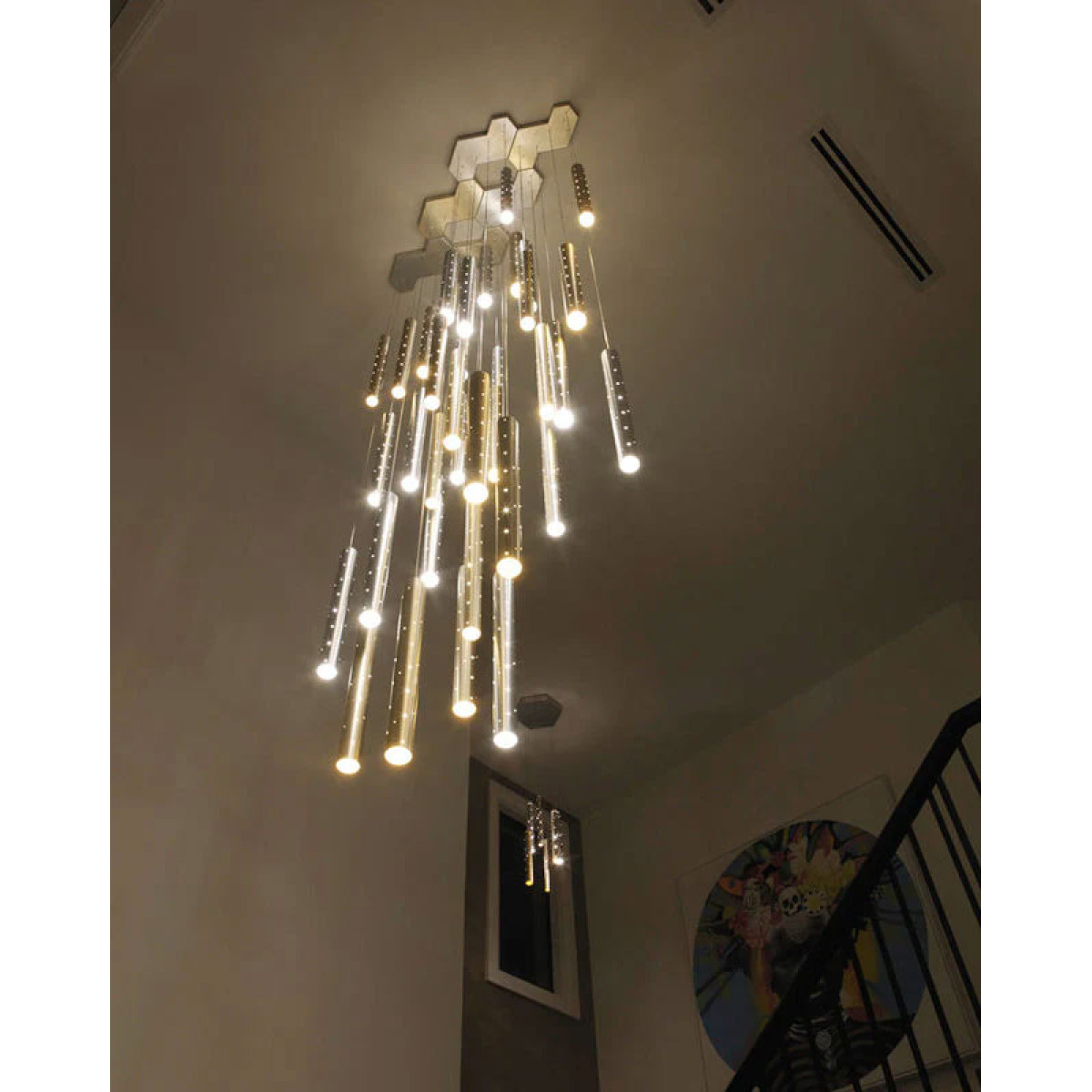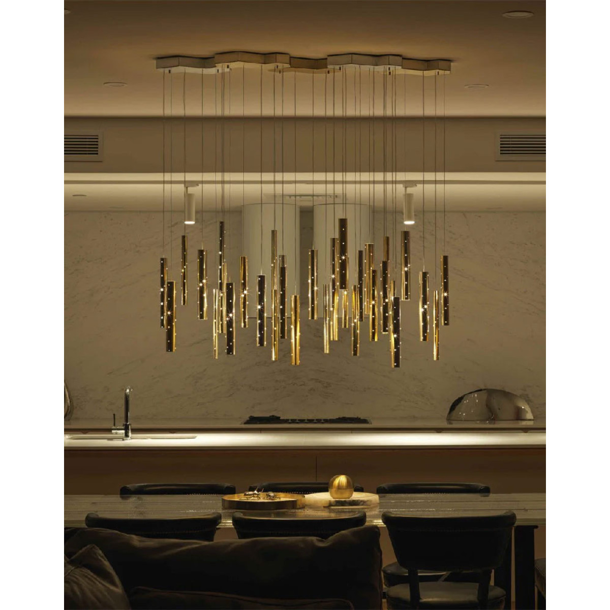 The concept behind Rain is illuminating: a multi-sensory experience of sight and sound that invites touch and interaction. Rain captures the shimmery sparkle of raindrops frozen in descent and voices a whimsy chime of flutes. Individual drops are visually quite subtle, but gain tremendous strength when multiplied and clustered in large groups. It is a playful piece with the sleekness of a design classic that is suitable for residential and commercial use. We often speak of designs having an organic profile or a naturalistic silhouette, but it’s rare to come across a piece that captures the multi-sensorial experience of outdoor phenomena. In this regard, Rain chandelier is the exception to the norm. The piece combines the musicality of the hanging chime, the illuminating allure of filtered light, and the tactile appeal of polished metal. Rain is essentially a pendant lamp constructed of suspended metallic cylinders lit from within. The tubes are punctuated and punctured with dozens of smallish holes, thus providing a multi-directional outlet for a profusion of luminescence. At face value, lighting can work to highlight and enhance beautiful architecture and bring an interior (or exterior) into fully realized aesthetic glory. On the flip side, poor lighting can mean that even an incredibly designed home can seem mediocre at best. The effect of scattered light is in the realm of the familiar disco ball, though Rain’s distribution of these thousand points is vertically oriented and thus manifestly unique. Indeed, the light released from Rain doesn’t so much dance about the walls as remain still in the perpetuity of an implied descent, very like a light mist amid parting clouds when the emergent rays elucidate the mysteries of a single drop.