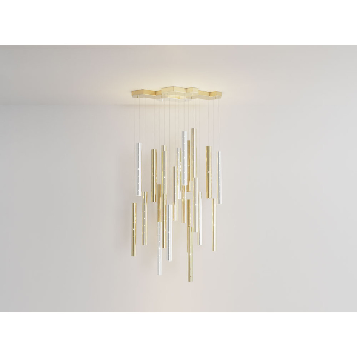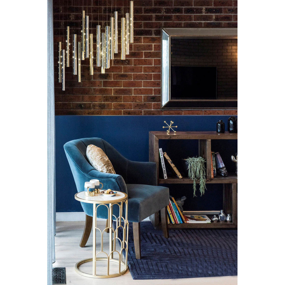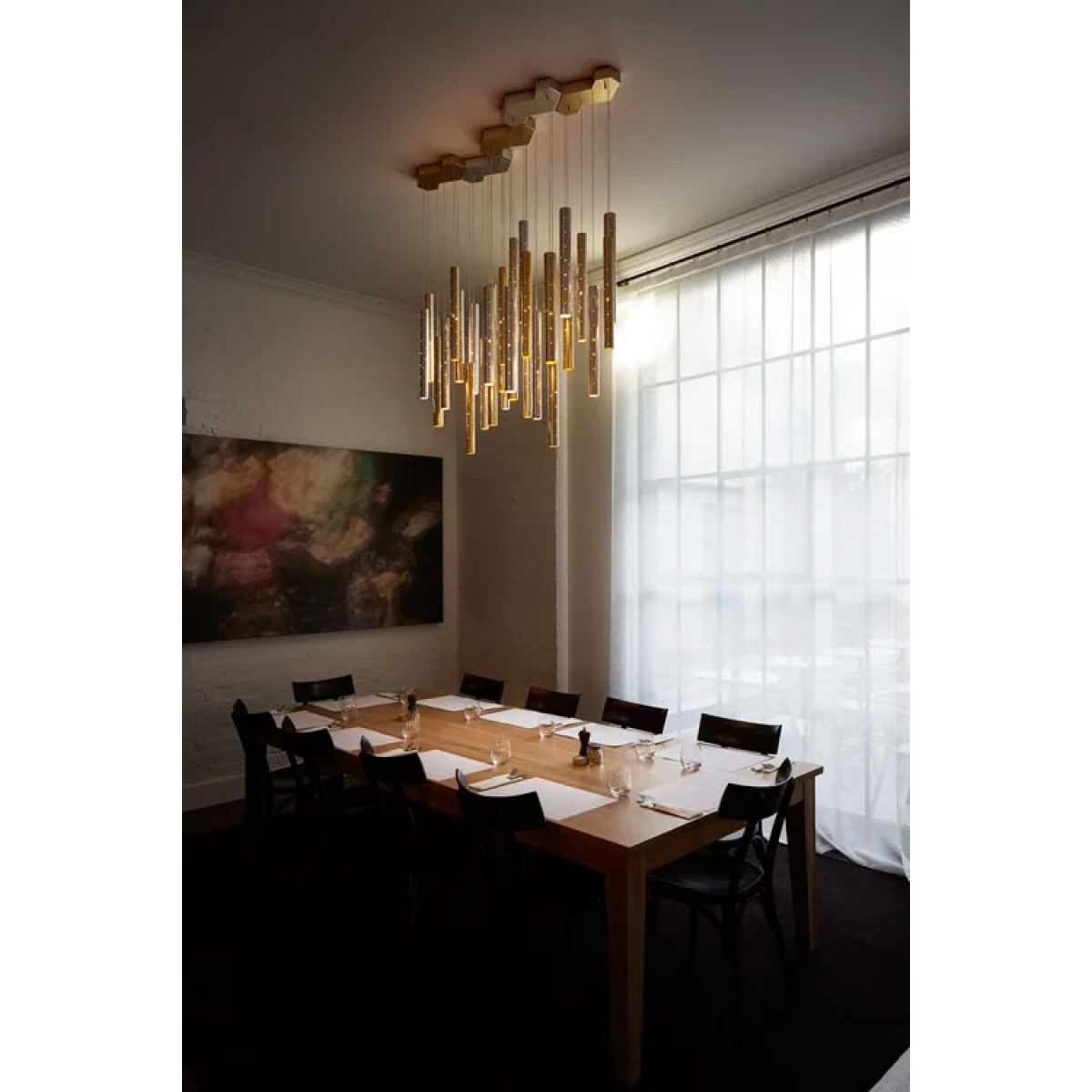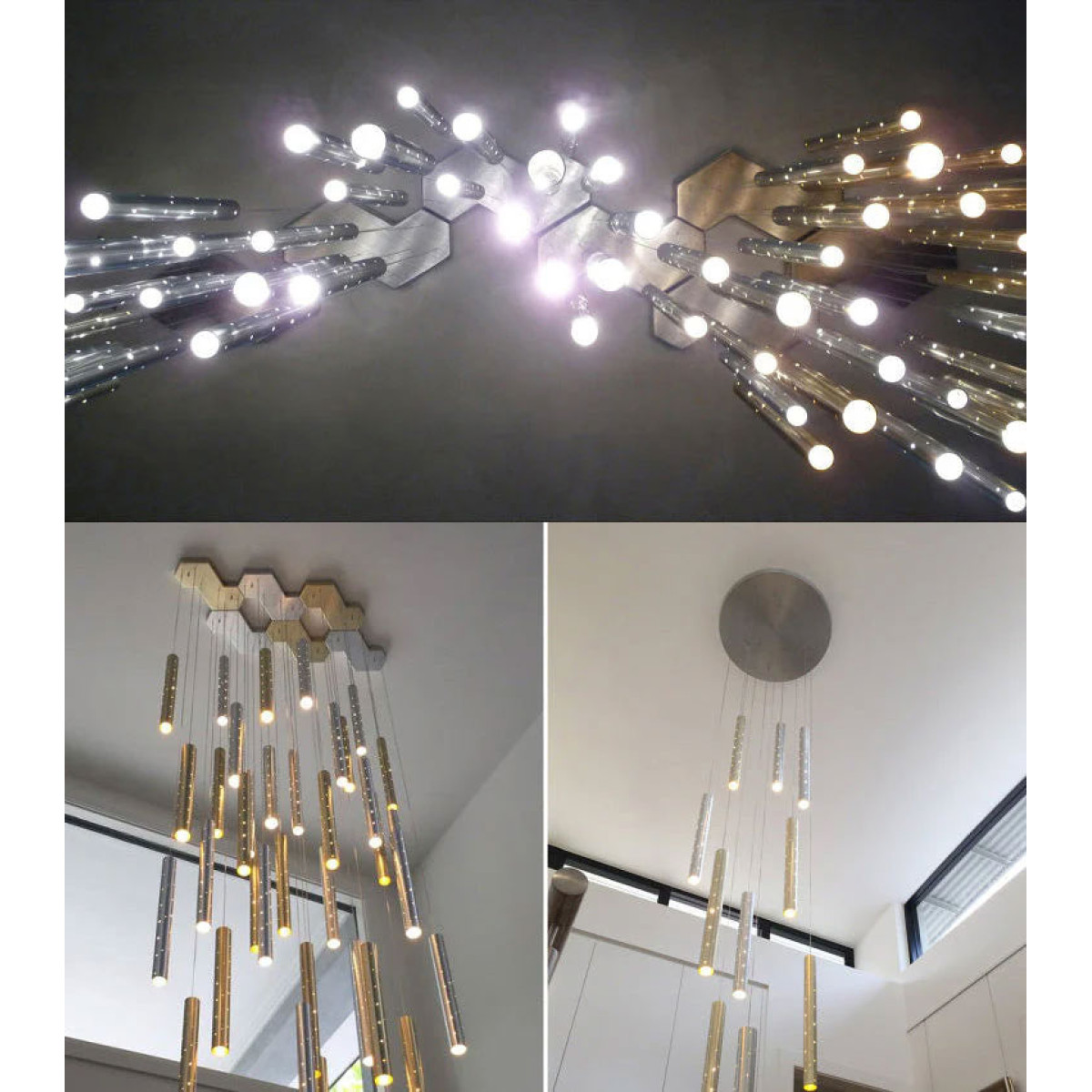 The concept behind Rain is illuminating: a multi-sensory experience of sight and sound that invites touch and interaction. Rain captures the shimmery sparkle of raindrops frozen in descent and voices a whimsy chime of flutes. Individual drops are visually quite subtle, but gain tremendous strength when multiplied and clustered in large groups. It is a playful piece with the sleekness of a design classic that is suitable for residential and commercial use. We often speak of designs having an organic profile or a naturalistic silhouette, but it’s rare to come across a piece that captures the multi-sensorial experience of outdoor phenomena. In this regard, Rain chandelier is the exception to the norm. The piece combines the musicality of the hanging chime, the illuminating allure of filtered light, and the tactile appeal of polished metal. Rain is essentially a pendant lamp constructed of suspended metallic cylinders lit from within. The tubes are punctuated and punctured with dozens of smallish holes, thus providing a multi-directional outlet for a profusion of luminescence. At face value, lighting can work to highlight and enhance beautiful architecture and bring an interior (or exterior) into fully realized aesthetic glory. On the flip side, poor lighting can mean that even an incredibly designed home can seem mediocre at best. The effect of scattered light is in the realm of the familiar disco ball, though Rain’s distribution of these thousand points is vertically oriented and thus manifestly unique. Indeed, the light released from Rain doesn’t so much dance about the walls as remain still in the perpetuity of an implied descent, very like a light mist amid parting clouds when the emergent rays elucidate the mysteries of a single drop.