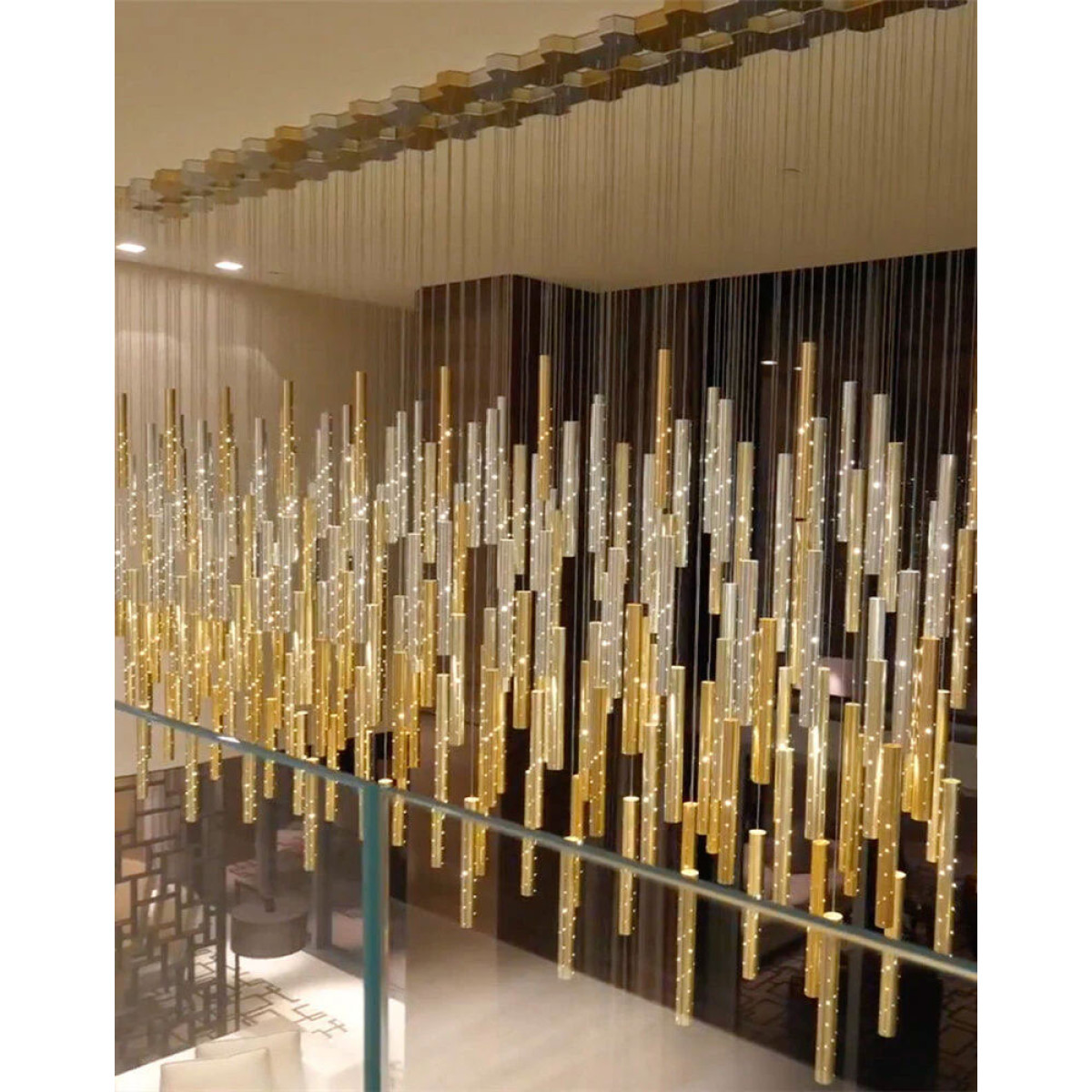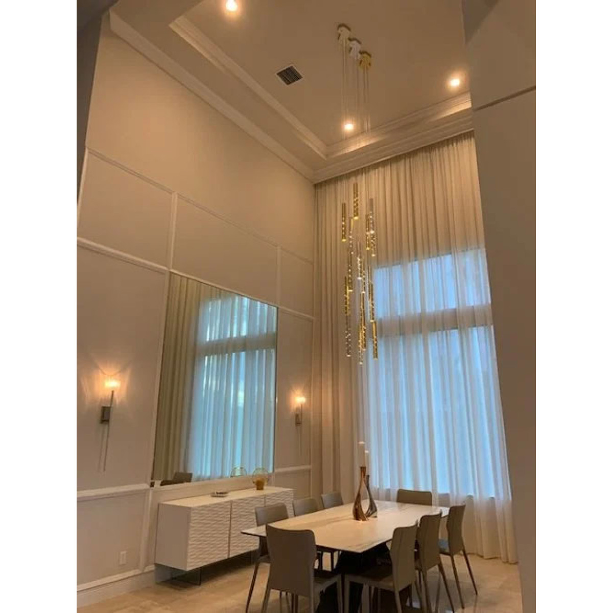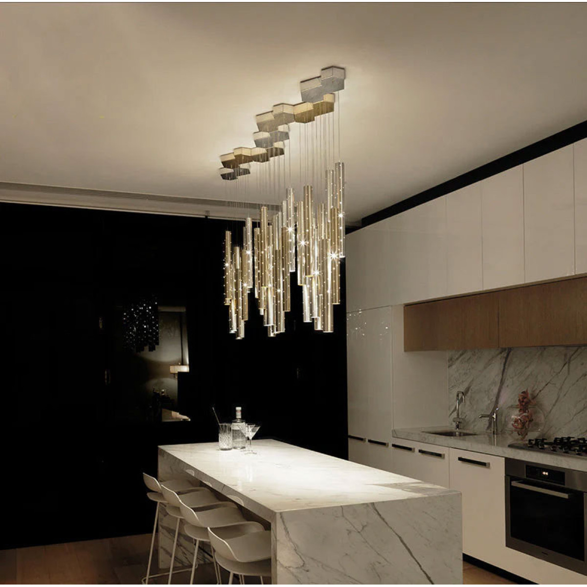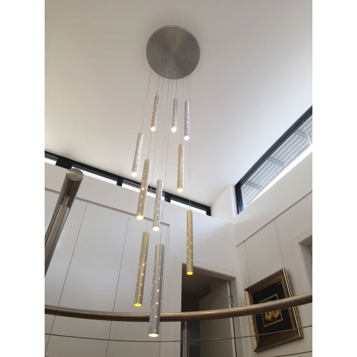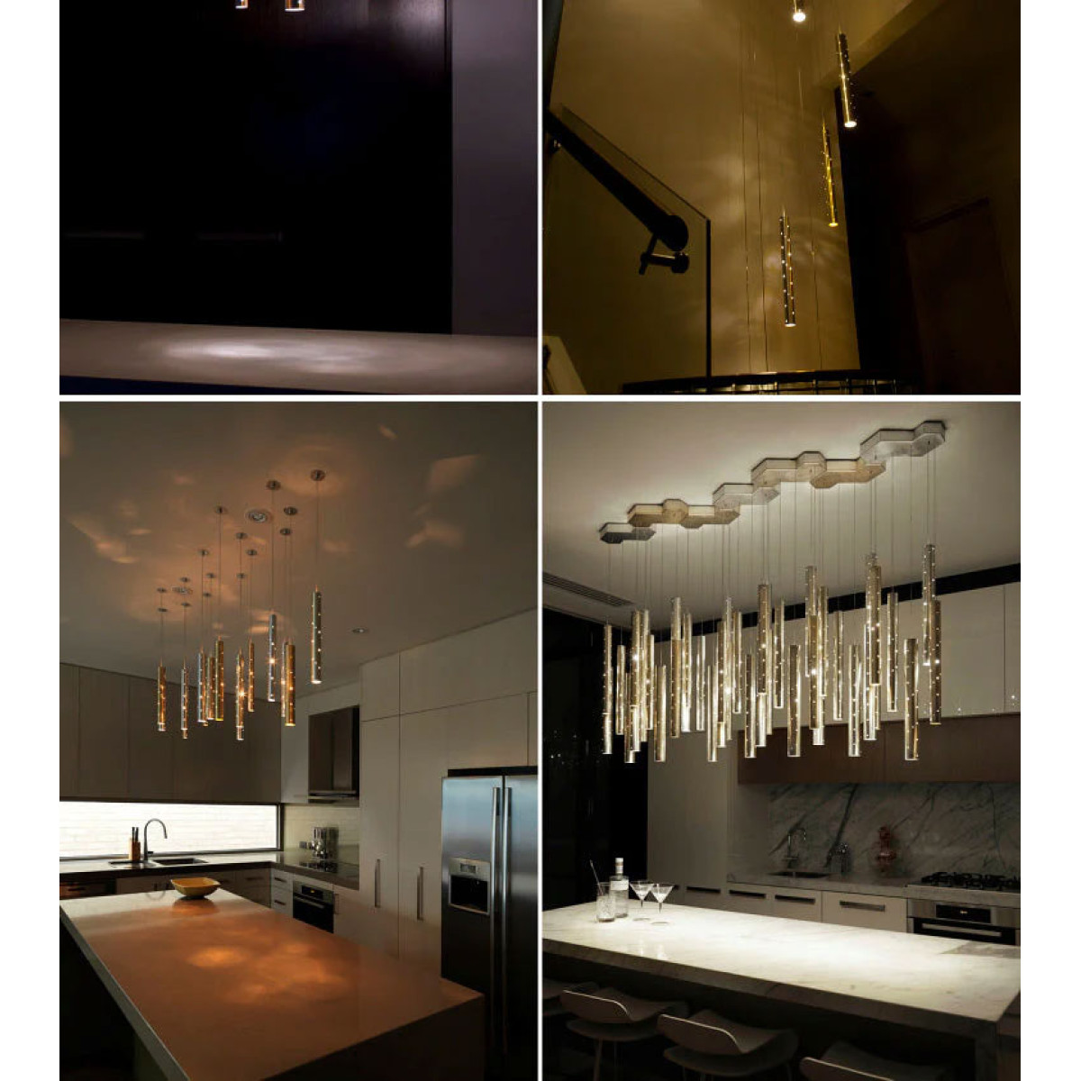 The concept behind Rain is illuminating: a multi-sensory experience of sight and sound that invites touch and interaction. Rain captures the shimmery sparkle of raindrops frozen in descent and voices a whimsy chime of flutes. Individual drops are visually quite subtle, but gain tremendous strength when multiplied and clustered in large groups. It is a playful piece with the sleekness of a design classic that is suitable for residential and commercial use. We often speak of designs having an organic profile or a naturalistic silhouette, but it’s rare to come across a piece that captures the multi-sensorial experience of outdoor phenomena. In this regard, Rain chandelier is the exception to the norm. The piece combines the musicality of the hanging chime, the illuminating allure of filtered light, and the tactile appeal of polished metal. Rain is essentially a pendant lamp constructed of suspended metallic cylinders lit from within. The tubes are punctuated and punctured with dozens of smallish holes, thus providing a multi-directional outlet for a profusion of luminescence. At face value, lighting can work to highlight and enhance beautiful architecture and bring an interior (or exterior) into fully realized aesthetic glory. On the flip side, poor lighting can mean that even an incredibly designed home can seem mediocre at best. The effect of scattered light is in the realm of the familiar disco ball, though Rain’s distribution of these thousand points is vertically oriented and thus manifestly unique. Indeed, the light released from Rain doesn’t so much dance about the walls as remain still in the perpetuity of an implied descent, very like a light mist amid parting clouds when the emergent rays elucidate the mysteries of a single drop.