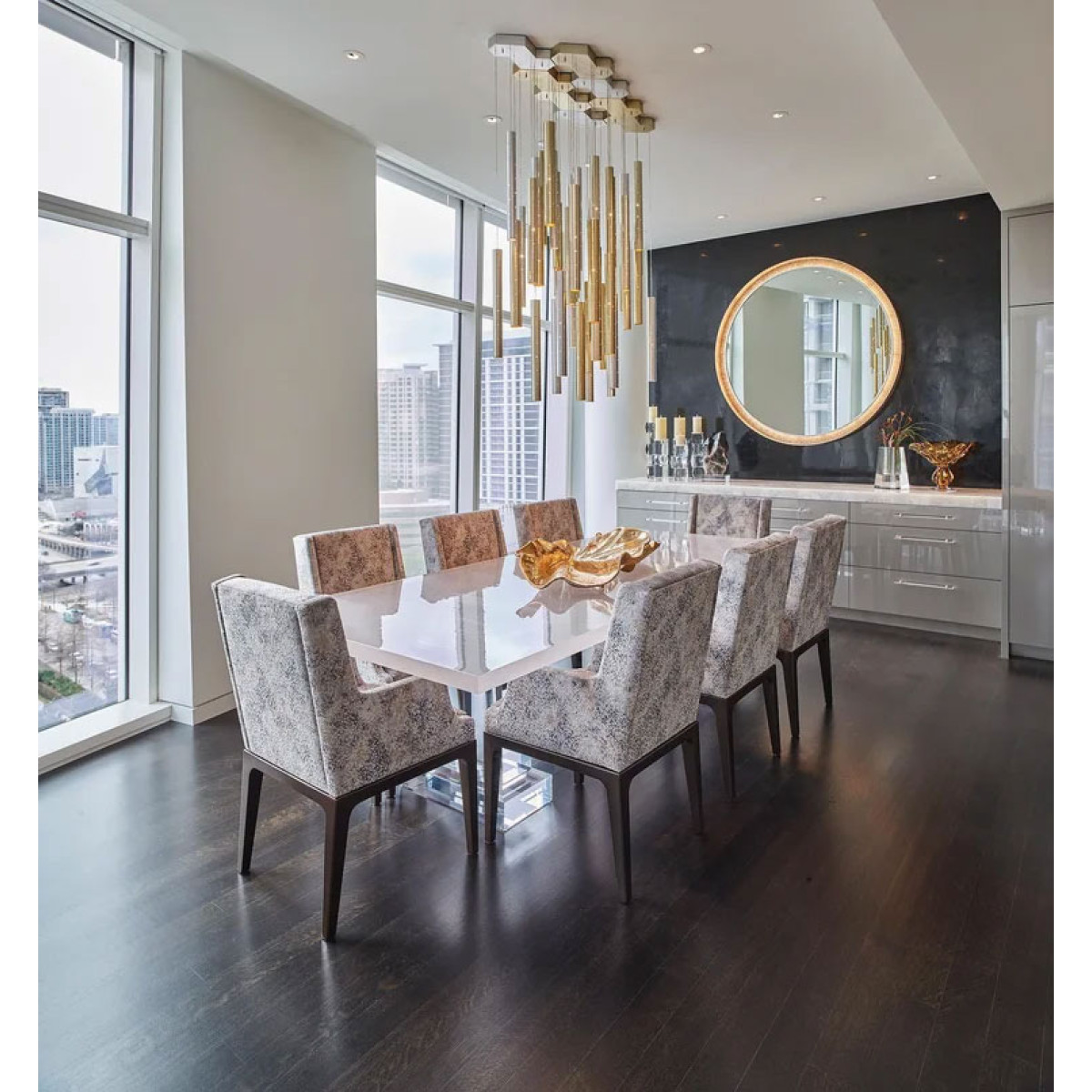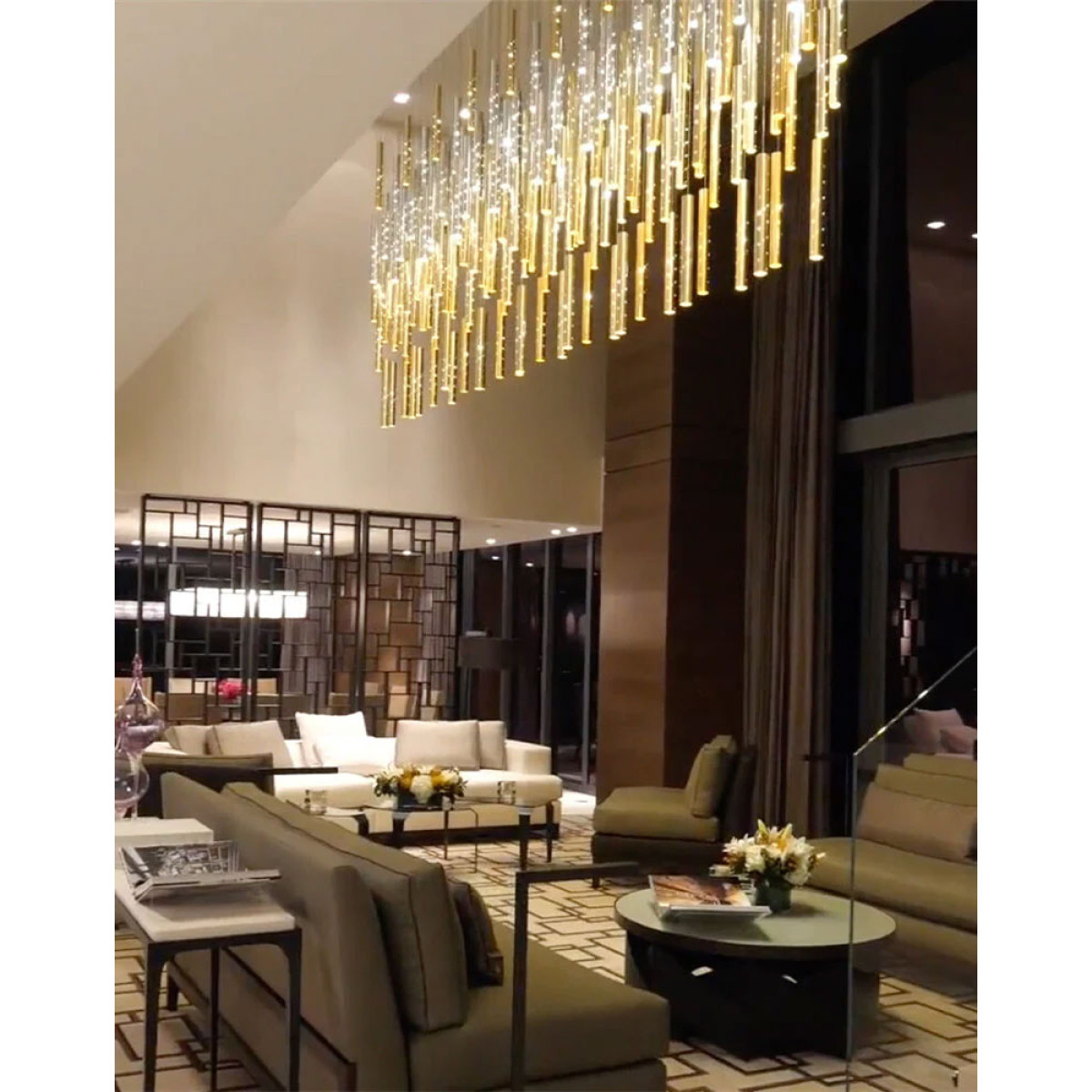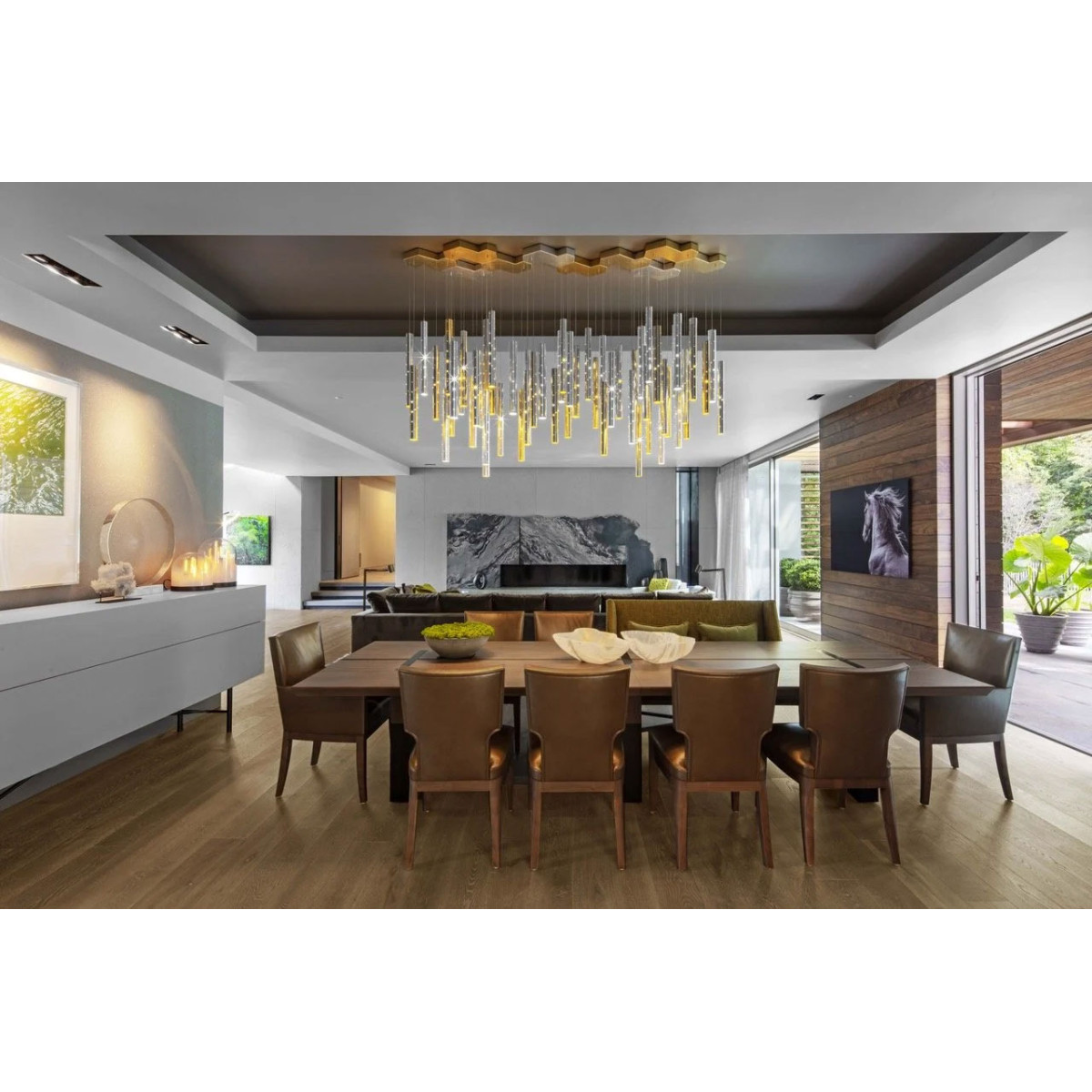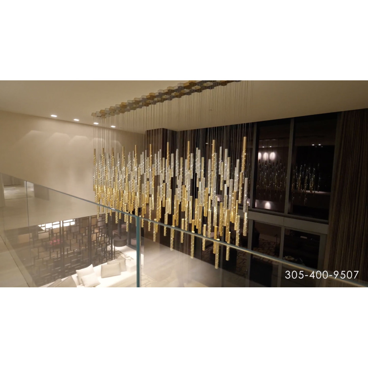 The concept behind Rain is illuminating: a multi-sensory experience of sight and sound that invites touch and interaction. Rain captures the shimmery sparkle of raindrops frozen in descent and voices a whimsy chime of flutes. Individual drops are visually quite subtle, but gain tremendous strength when multiplied and clustered in large groups. It is a playful piece with the sleekness of a design classic that is suitable for residential and commercial use. We often speak of designs having an organic profile or a naturalistic silhouette, but it’s rare to come across a piece that captures the multi-sensorial experience of outdoor phenomena. In this regard, Rain chandelier is the exception to the norm. The piece combines the musicality of the hanging chime, the illuminating allure of filtered light, and the tactile appeal of polished metal. Rain is essentially a pendant lamp constructed of suspended metallic cylinders lit from within. The tubes are punctuated and punctured with dozens of smallish holes, thus providing a multi-directional outlet for a profusion of luminescence. At face value, lighting can work to highlight and enhance beautiful architecture and bring an interior (or exterior) into fully realized aesthetic glory. On the flip side, poor lighting can mean that even an incredibly designed home can seem mediocre at best. The effect of scattered light is in the realm of the familiar disco ball, though Rain’s distribution of these thousand points is vertically oriented and thus manifestly unique. Indeed, the light released from Rain doesn’t so much dance about the walls as remain still in the perpetuity of an implied descent, very like a light mist amid parting clouds when the emergent rays elucidate the mysteries of a single drop.