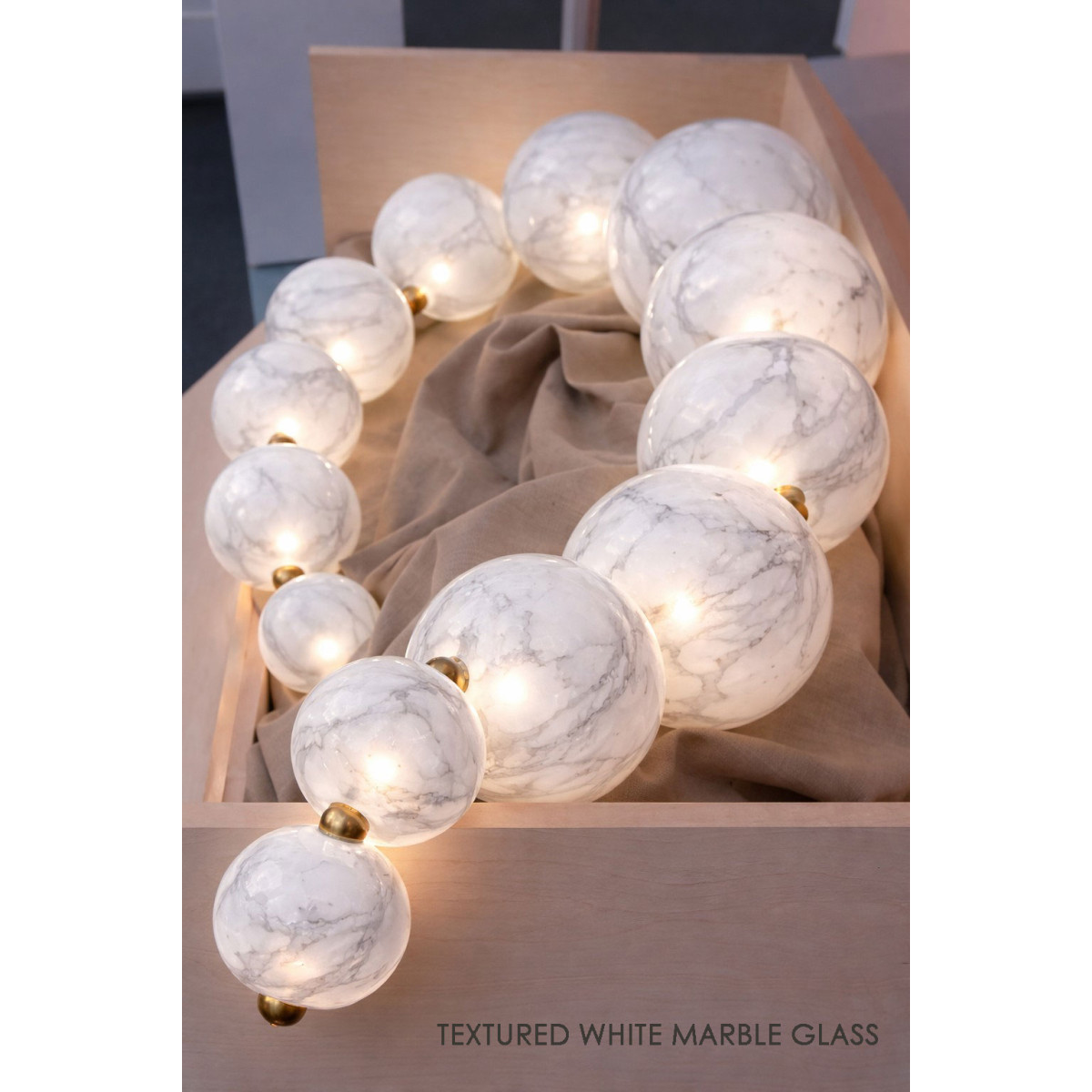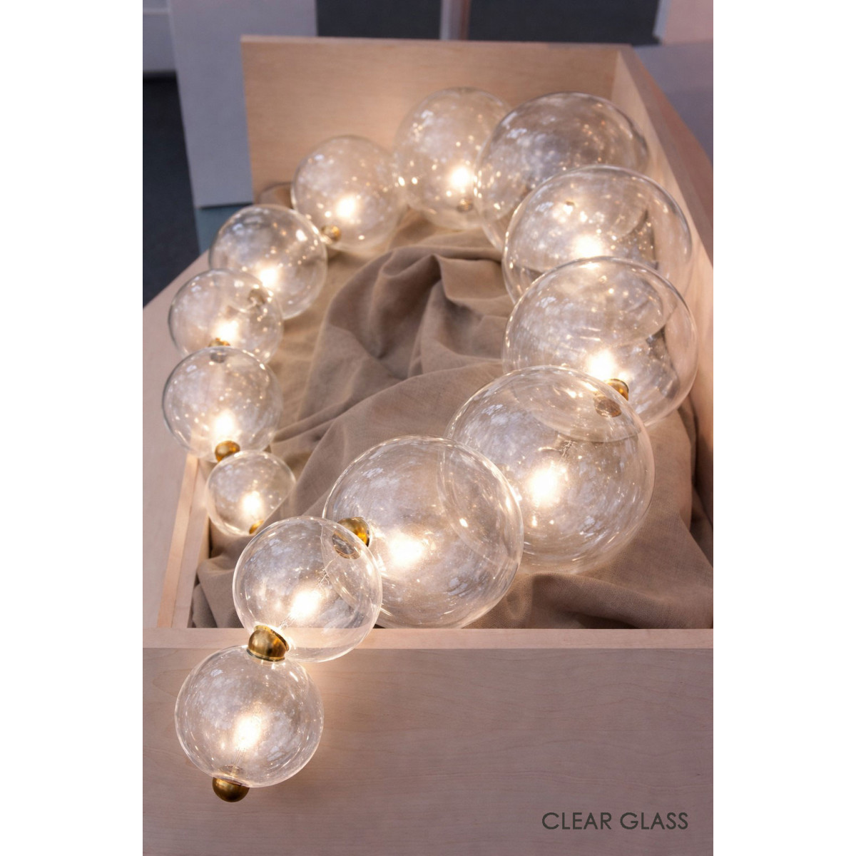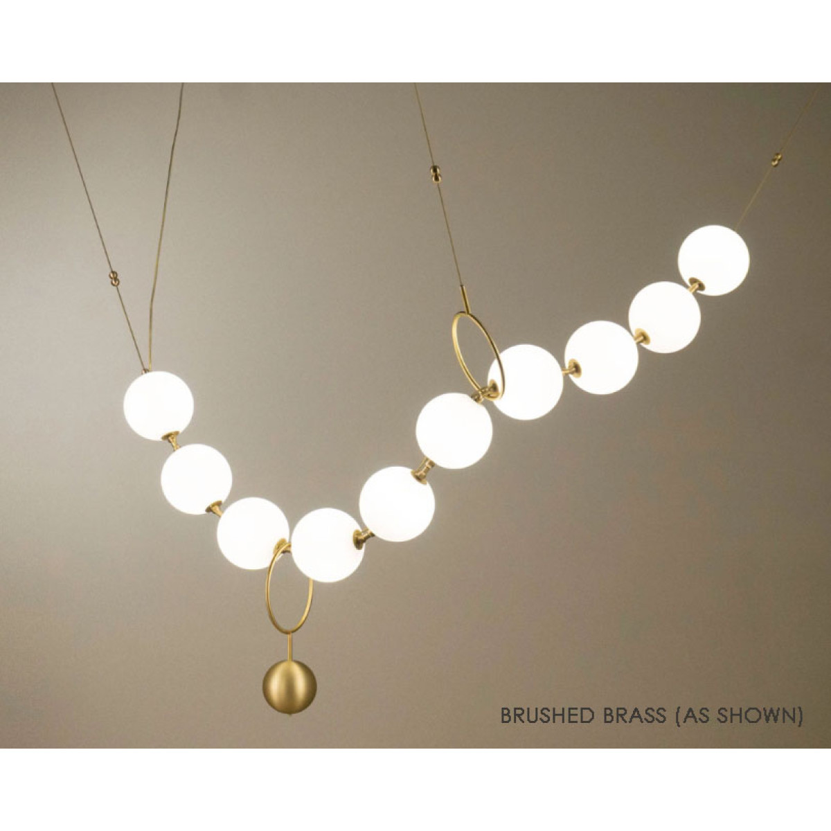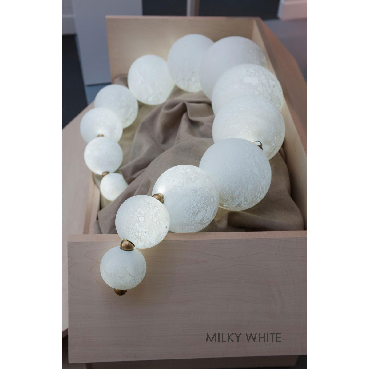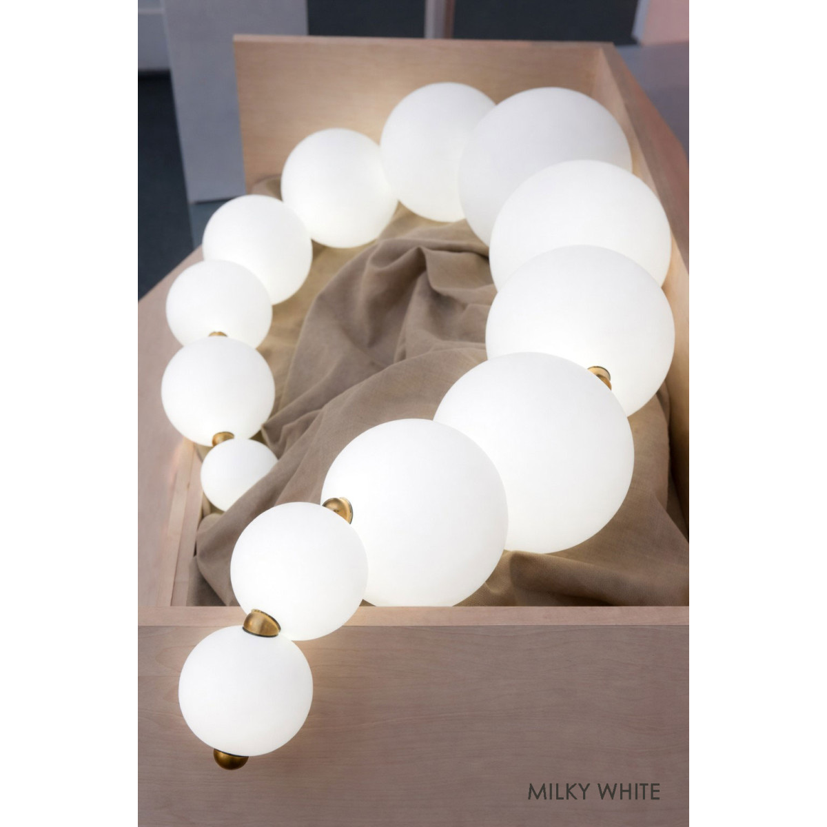 Like a string of pearls, this lamp’s 10 hand-blown glass globes can be arranged in several configurations to adapt to the setting where it will be admired. The finishing touch for this luminous gem is a counterweight and hook that can be added or moved from one “pearl” to another, providing all the flexibility needed for the lamp to fit its space to perfection. Entirely handmade by local artisans, its artistic approach makes MOON a piece of lighting-art, bringing finesse, beauty and poetry to any space. From brass to copper to nickel and fossil black, with globes that can be tinted to taste, it offers owners countless ways to possess a unique creation.