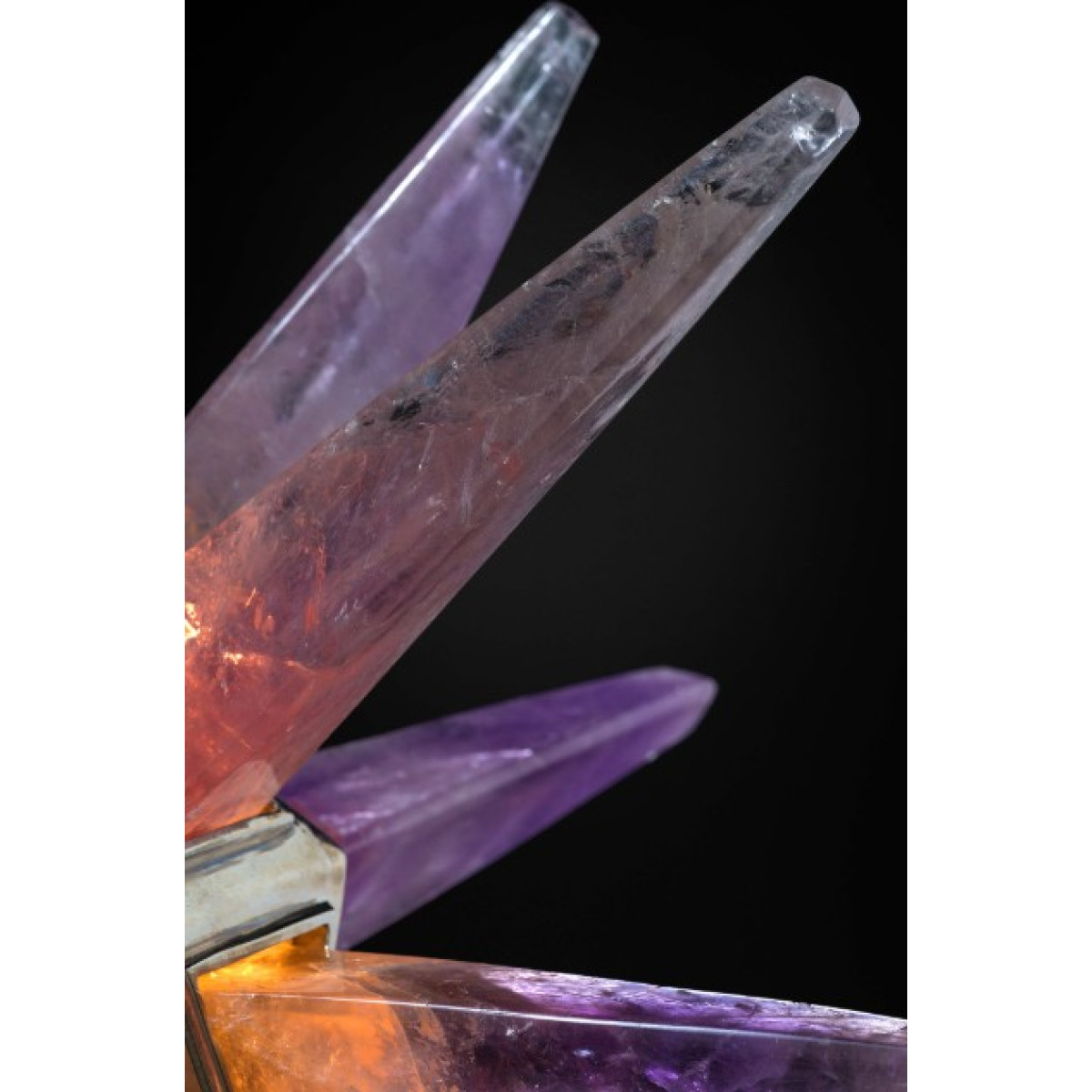 History comes from far away, in a space where time seems to have stopped. Space still virgin, where nature has kept a pristine aspect, where the earth has held unknown treasures, being in Brazil in our case, or Madagascar, a large island in the Indian Ocean. Rock crystal has always been a precious mineral through the ages; from Antiquity to the Renaissance, it was found in palaces and "cabinets of curiosity" sometimes in their natural state called "Etat Brut," or cut shapes without any other artifice. The vogue of rock crystal became in Renaissance times a favorite among rulers who took pride in showing their best pieces in "Kunstkammer" in Vienna, Austria, Dresden, Germany and Prague, Bohemia. There is no collection without this precious mineral, sometimes decorated with gold, silver, enamel or simply engraved (Treasures of Marco, Sainte-Chapelle in Paris, Medici Chapel in Florence and the collections of King Louis XIV kept in the Gallery in The Louvre Museum in Paris). Cool embers with sparkling moon effects, this precious mineral coming from the depths of the earth, has always been a fascination for man. Rock crystal is praised for its beauty, luminosity and transparency, sometimes opaque like a milky substance, depending on the origins of the minerals: It can be found in Madagascar Brazil or even the Alps, all different, in its transparency. His utilization in contemporary lighting, in our case, gives rock crystal its luminosity and contributes beautifully to a fine decor. One can say that rock crystal is shown at his best in a contemporary design.