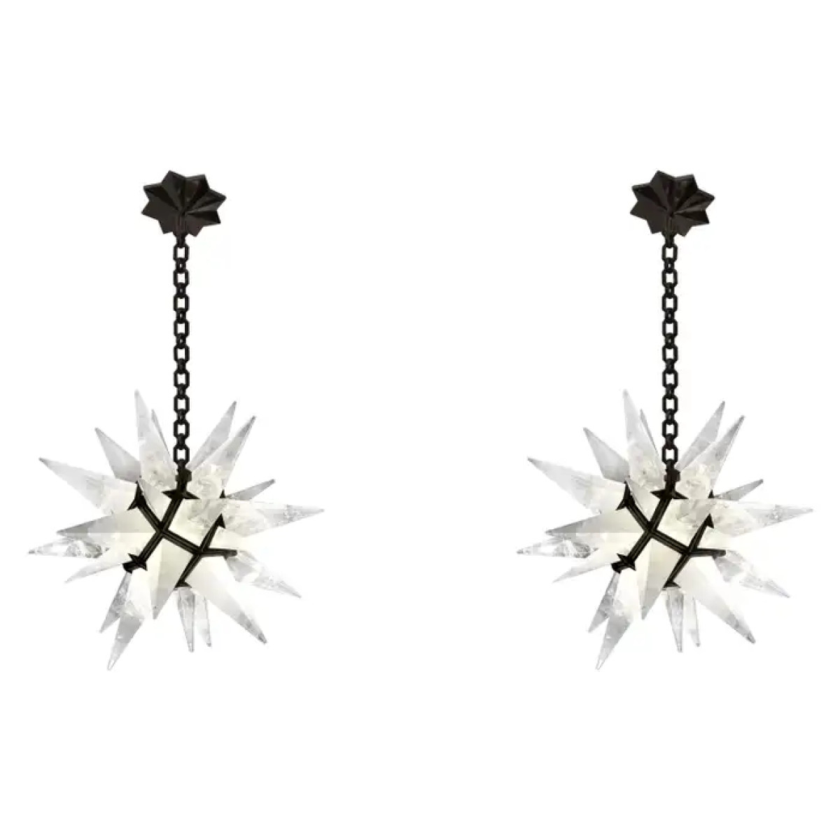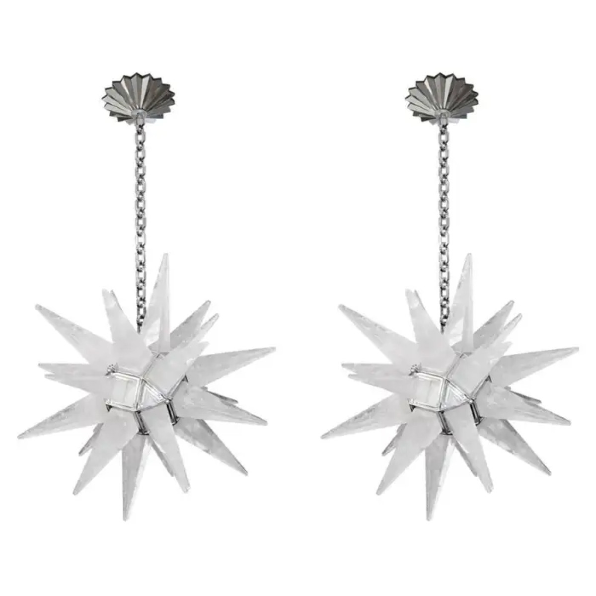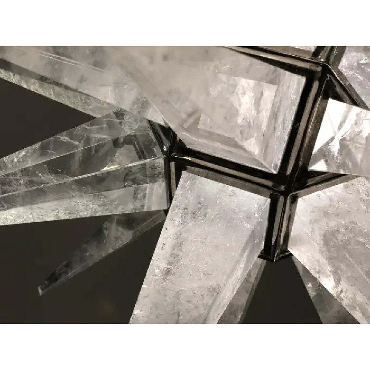 History comes from far away, in a space where time seems to have stopped. Space still virgin, where nature has kept a pristine aspect, where the earth has held unknown treasures, being in Brazil in our case, or Madagascar, a large island in the Indian Ocean. Rock crystal has always been a precious mineral through the ages; from Antiquity to the Renaissance, it was found in palaces and "cabinets of curiosity" sometimes in their natural state called "Etat Brut," or cut shapes without any other artifice. The vogue of rock crystal became in Renaissance times a favorite among rulers who took pride in showing their best pieces in "Kunstkammer" in Vienna, Austria, Dresden, Germany and Prague, Bohemia. There is no collection without this precious mineral, sometimes decorated with gold, silver, enamel or simply engraved (Treasures of Marco, Sainte-Chapelle in Paris, Medici Chapel in Florence and the collections of King Louis XIV kept in the Gallery in The Louvre Museum in Paris). Cool embers with sparkling moon effects, this precious mineral coming from the depths of the earth, has always been a fascination for man. Rock crystal is praised for its beauty, luminosity and transparency, sometimes opaque like a milky substance, depending on the origins of the minerals: It can be found in Madagascar Brazil or even the Alps, all different, in its transparency. His utilization in contemporary lighting, in our case, gives rock crystal its luminosity and contributes beautifully to a fine decor. One can say that rock crystal is shown at his best in a contemporary design.