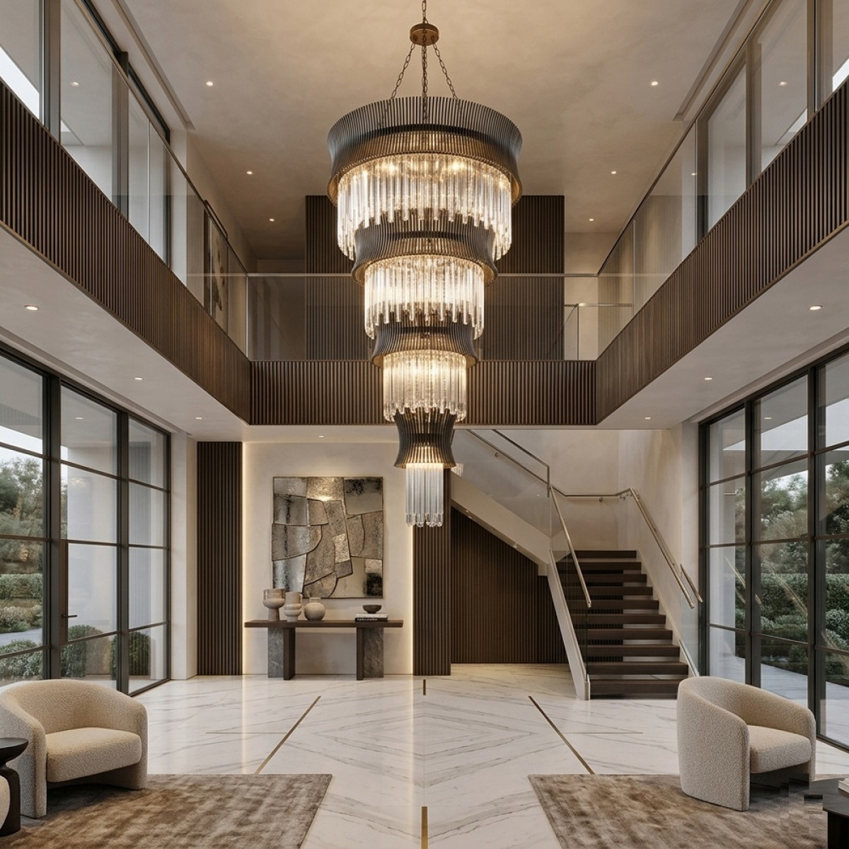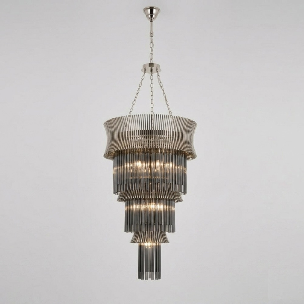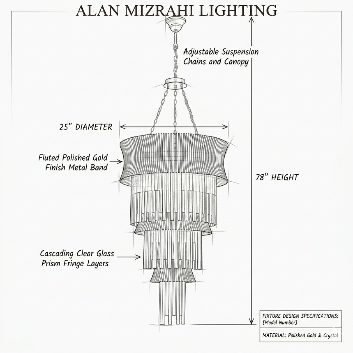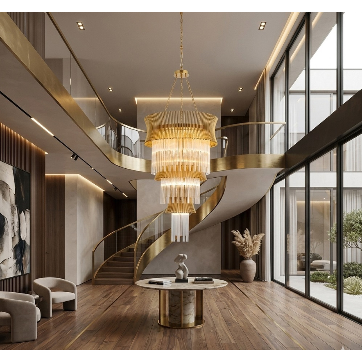 The AM1533 Lilium Luster Glass Chandelier is a refined statement piece that blends classical glamour with modern elegance. Its tiered silhouette is framed in a warm gold finish and dressed with cascading clear glass rods that create a soft, radiant glow. The design feels both dramatic and graceful, making it ideal for grand entryways, staircases, double-height spaces, and luxury interiors. With its elongated form and luminous texture, this chandelier brings height, sophistication, and timeless presence to any setting.