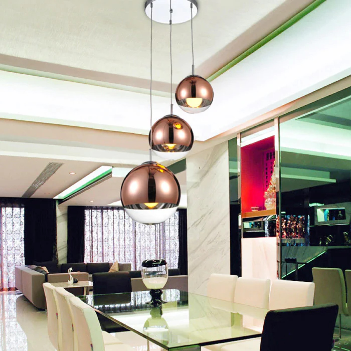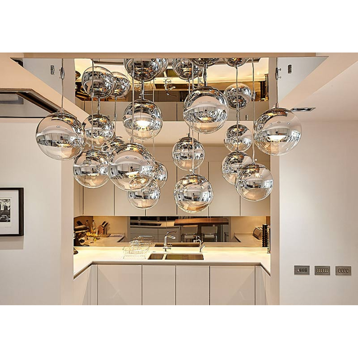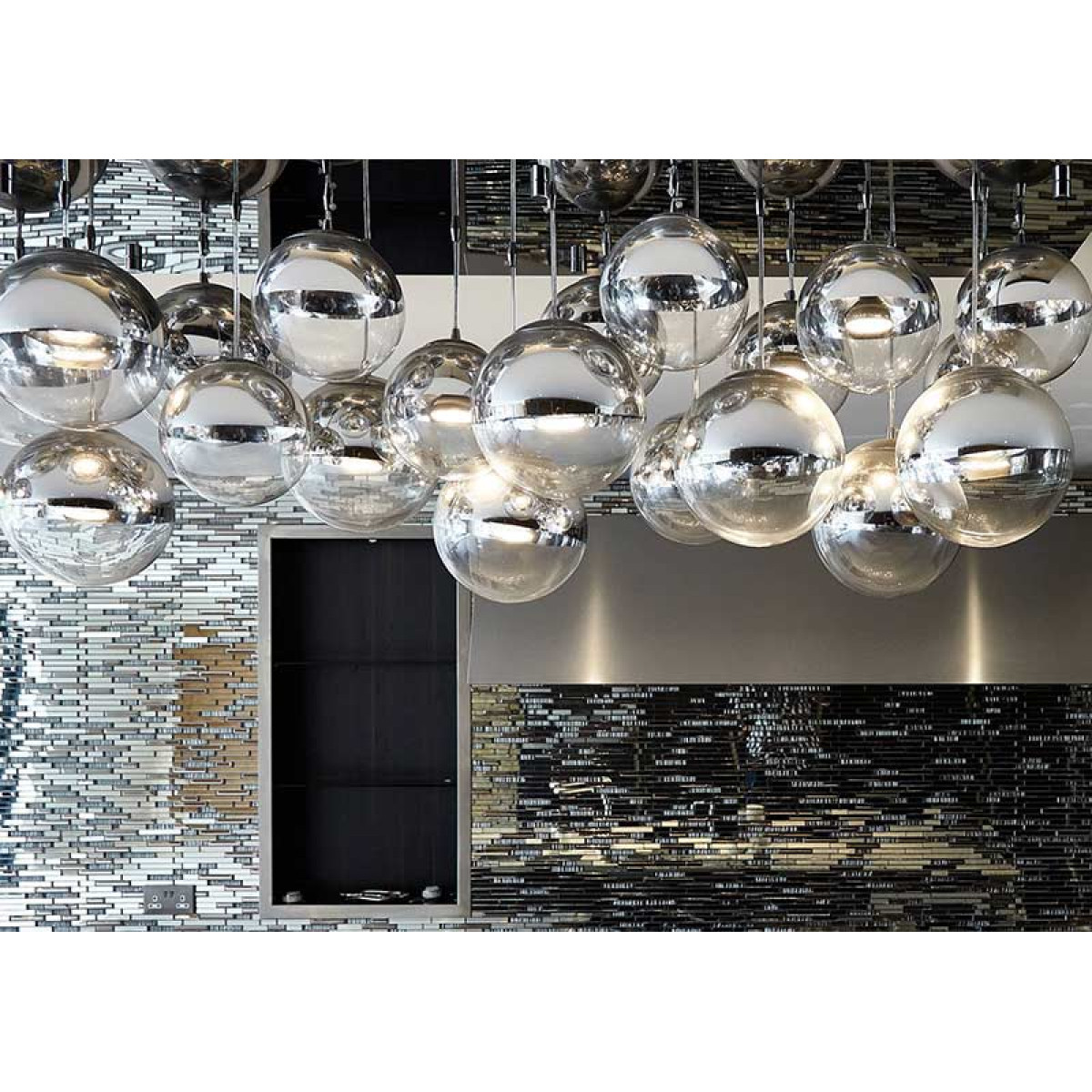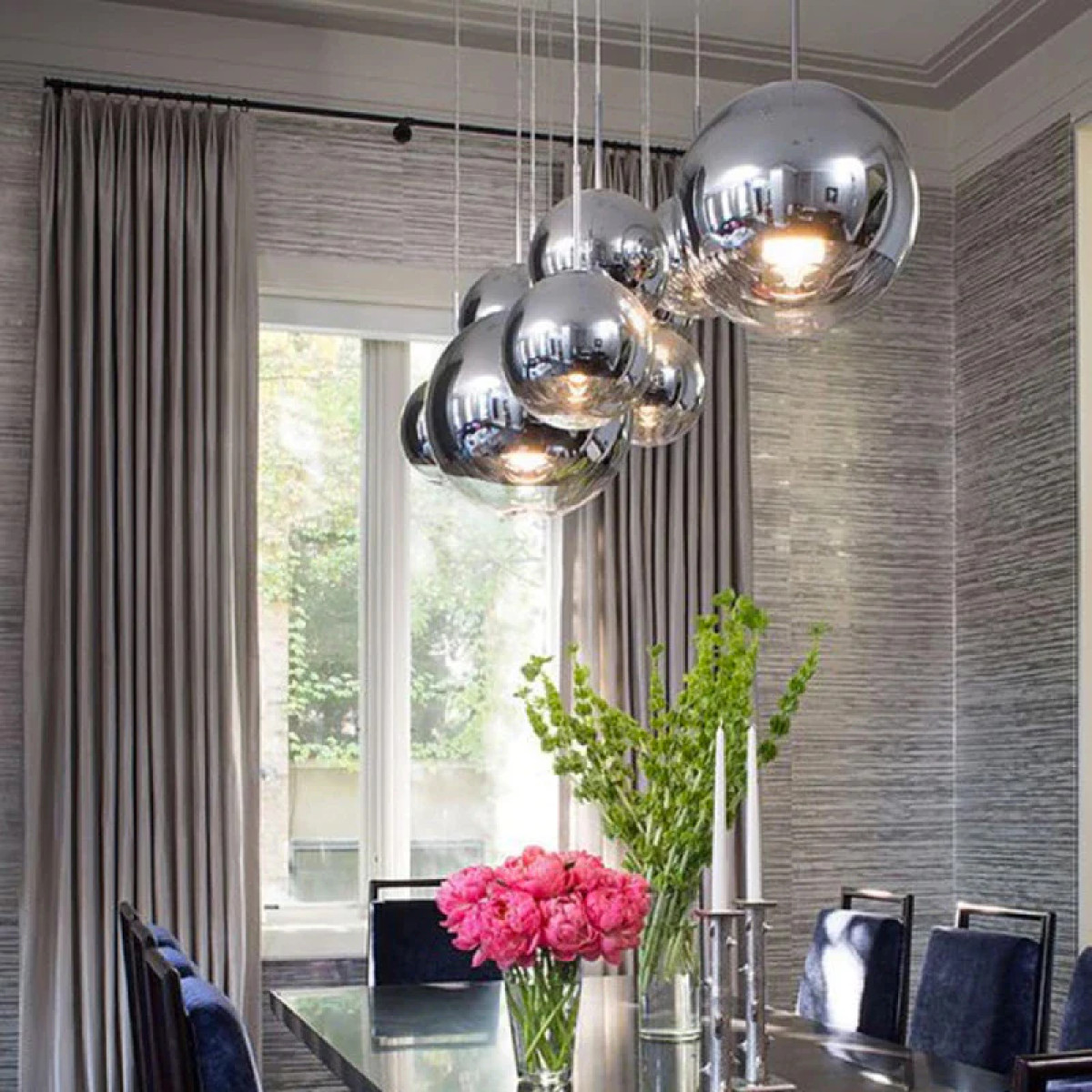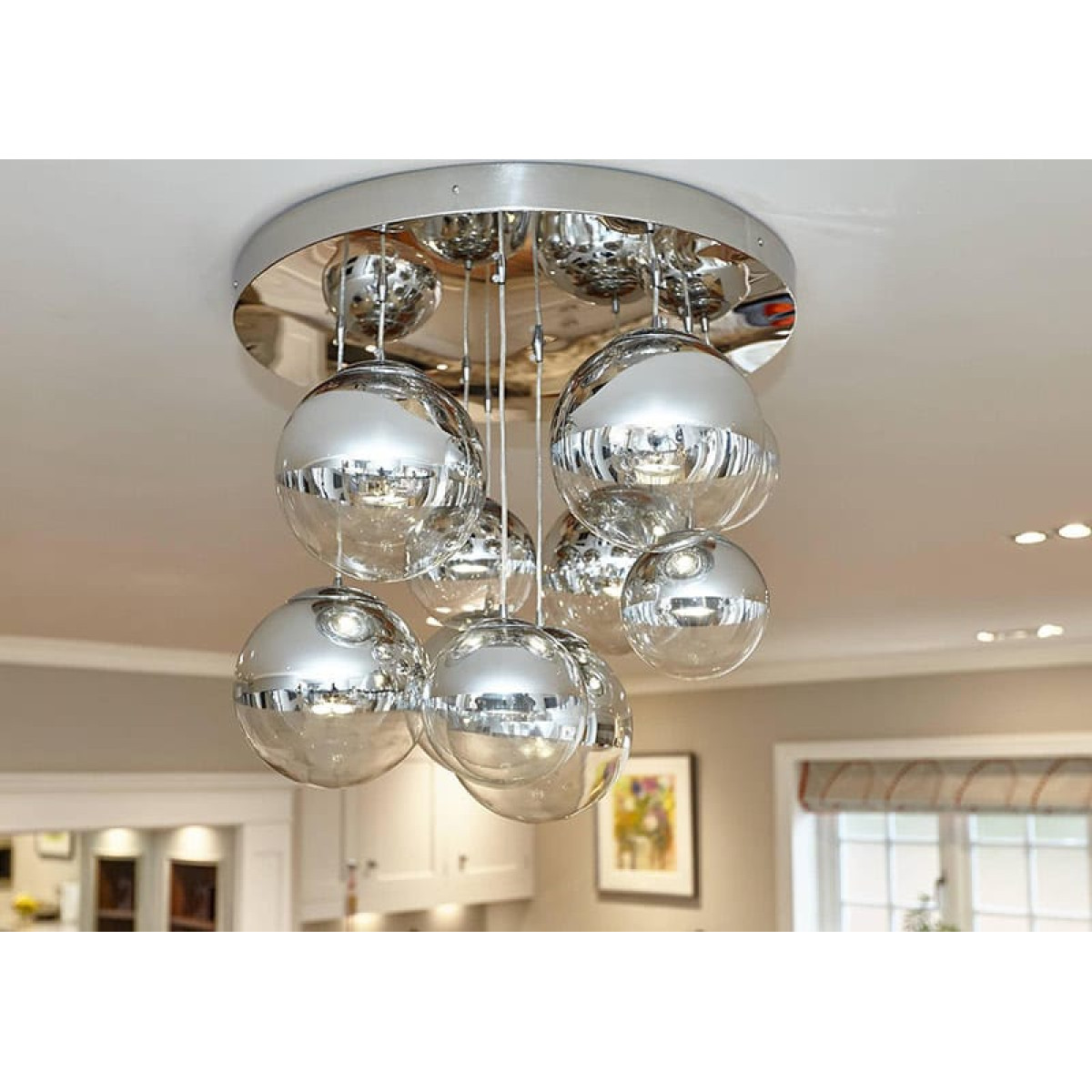 Modern Charm in a Compact Form. The DV8874 Globbi Cromati chandelier offers a fresh, contemporary aesthetic perfect for intimate or modern spaces. Featuring smooth, half-chromed hand-blown glass orbs suspended at varying heights, this elegant piece creates a playful dance of light and reflection. Mounted on sleek chrome panels, the orbs reflect and refract light in dynamic, unexpected ways—bringing depth and movement to any setting. Compact yet eye-catching, the Globbi Cromati is an ideal choice for those seeking refined modern design with a unique twist.