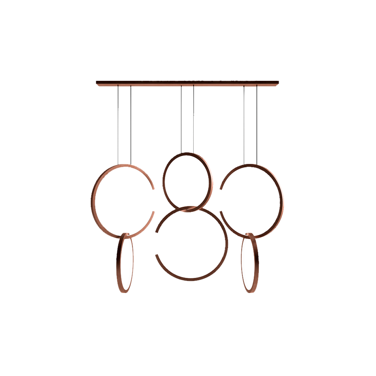 Boasting impressive formal presence, this refined chandelier is the perfect centerpiece in an entryway, dining room, and loft space in a contemporary-styled interior. This elegant piece is crafted entirely of metal with a brushed-copper finish and features a linear ceiling mount with three sets of two cables, each holding two rings. Ideal for a contemporary interior, the smooth and continuous light mixes with the warm reflections on the metal to diffuse a stunning ambient light in any room.