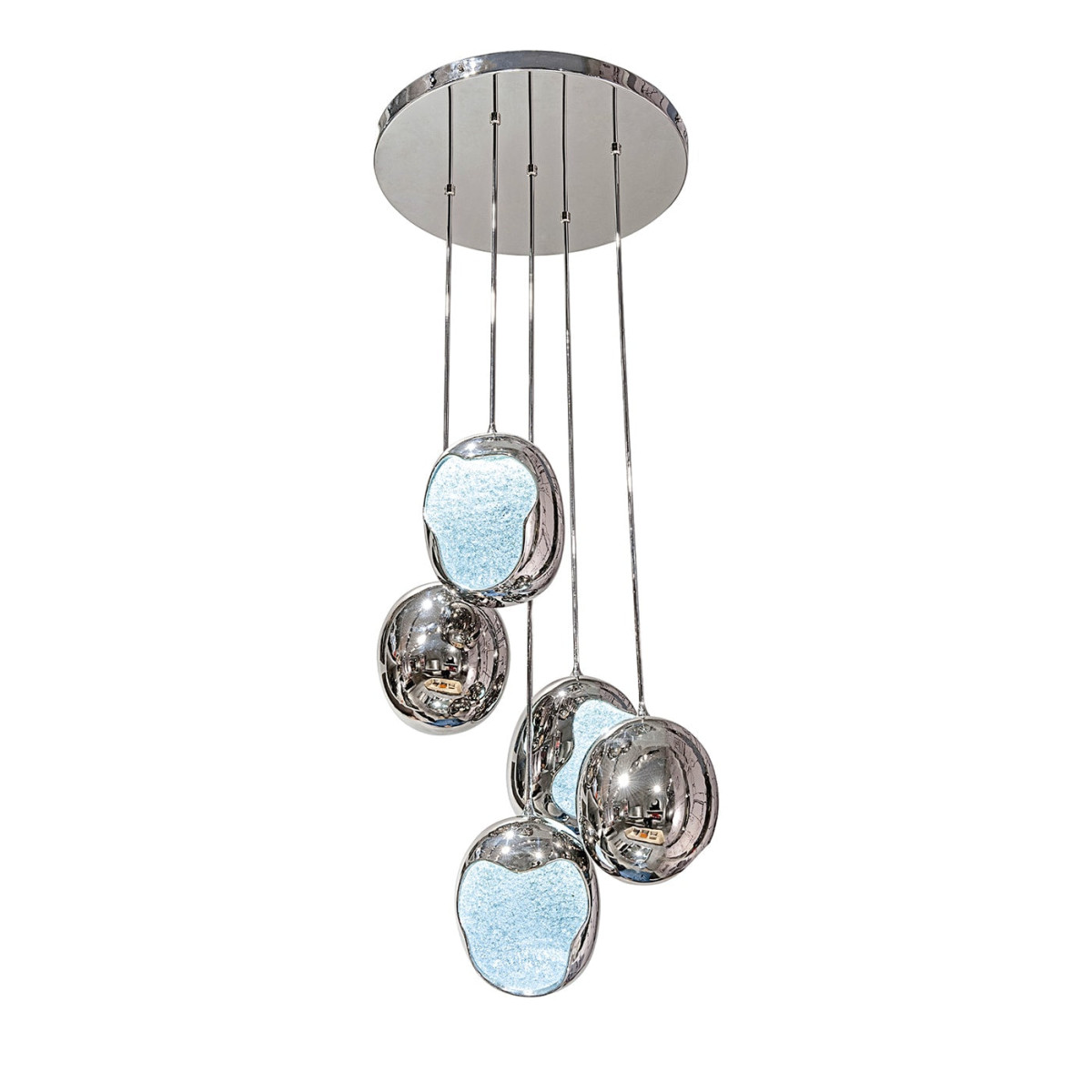 The Element-K Ceiling Lamp is a striking fusion of organic texture and contemporary form. Each globe-shaped pendant features a polished chrome exterior, sculpted with fluid cutouts that reveal shimmering crystal-like interiors. Suspended from a sleek mirrored canopy, the design captures both light and reflection, creating a dynamic play of sparkle and shine. Its modern yet natural aesthetic makes it a statement piece, ideal for luxury interiors seeking a balance of bold geometry and refined glamour. Whether hung as a dramatic centerpiece over a dining table or in a grand foyer, the Element-K offers sculptural presence and radiant elegance.