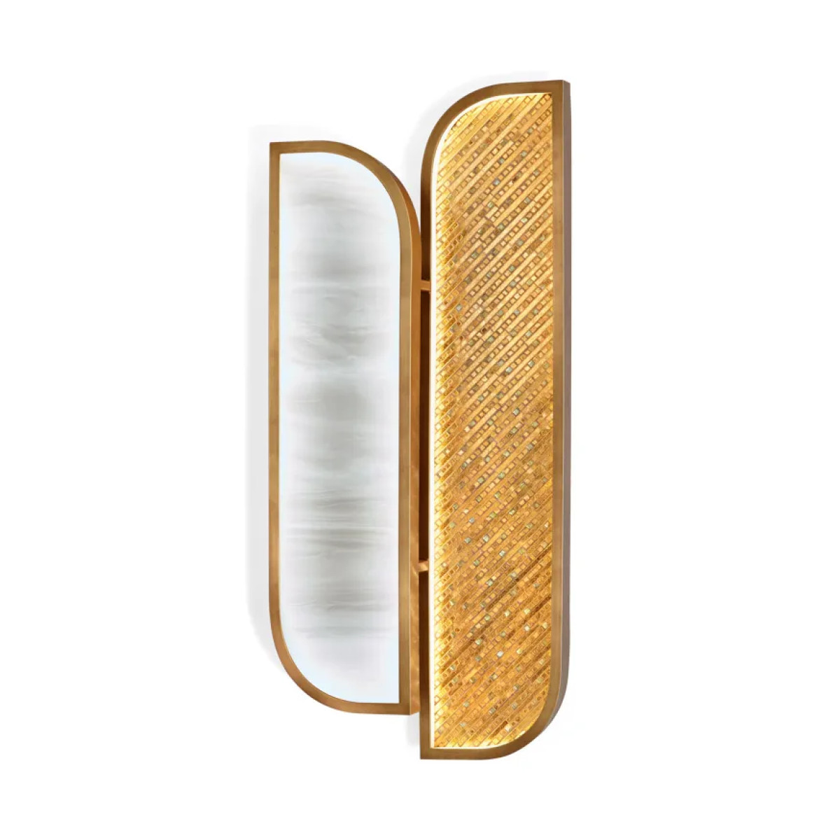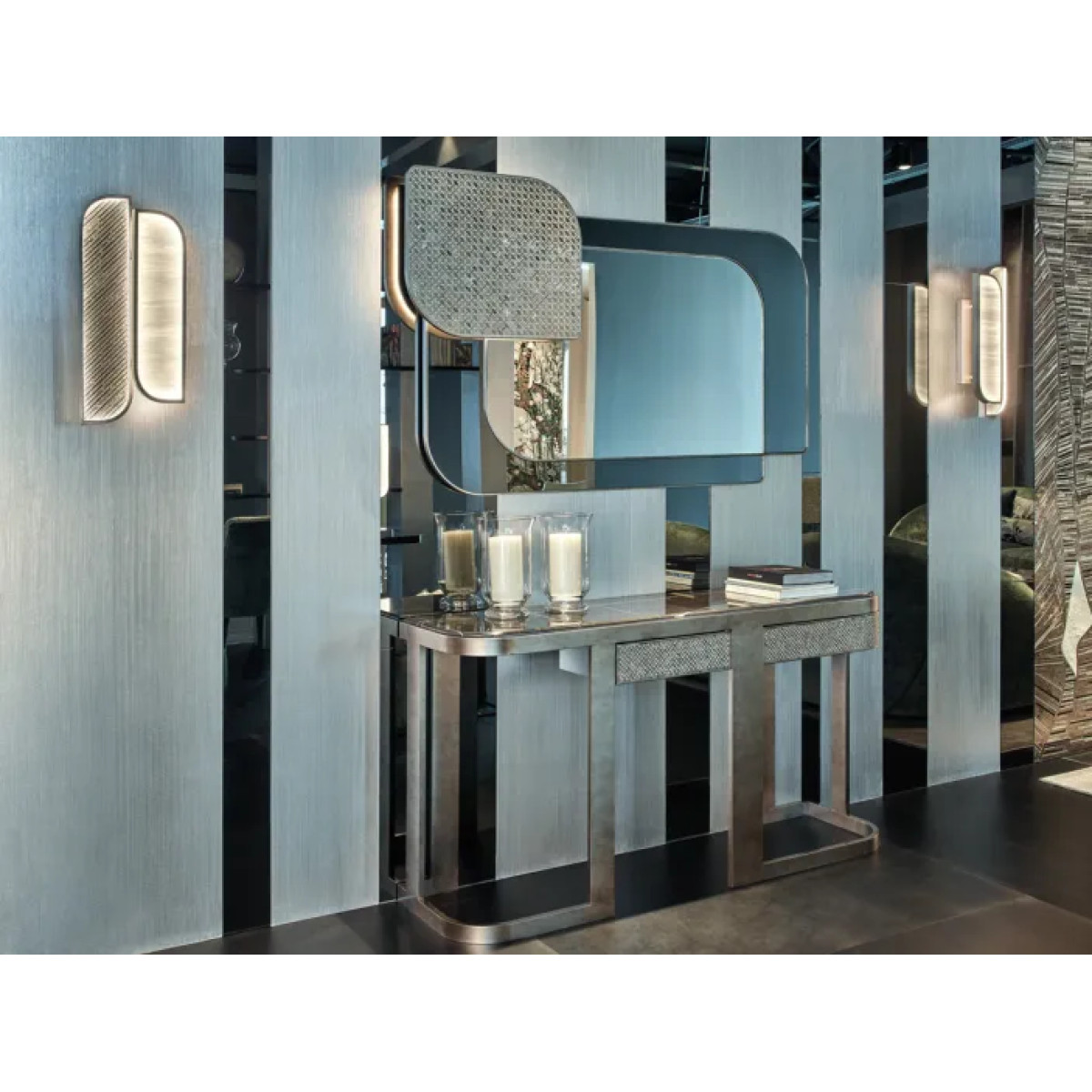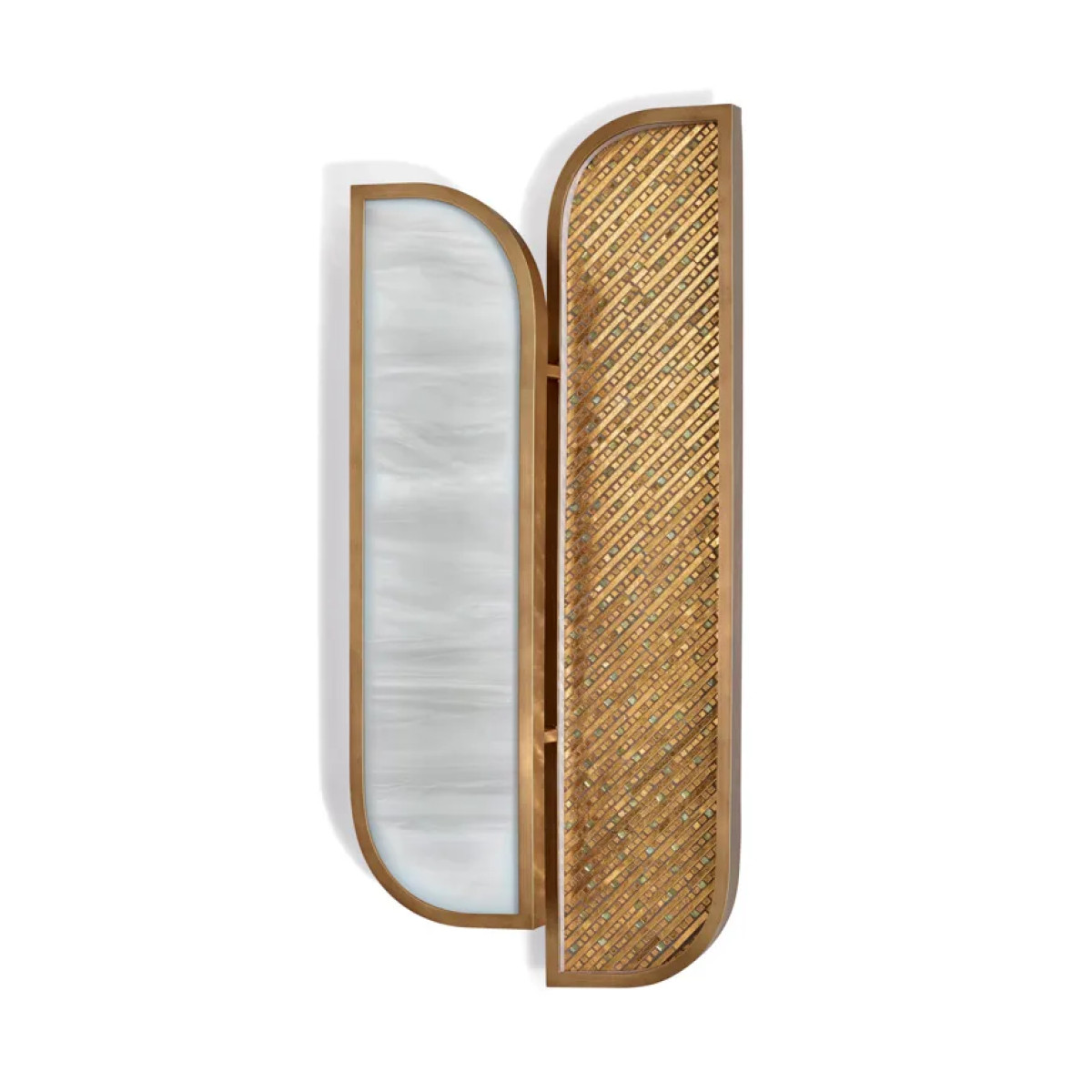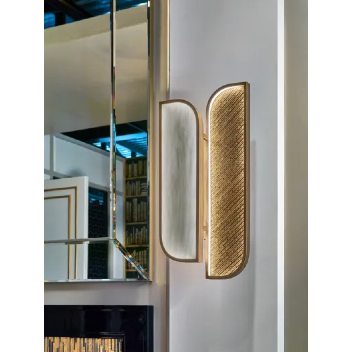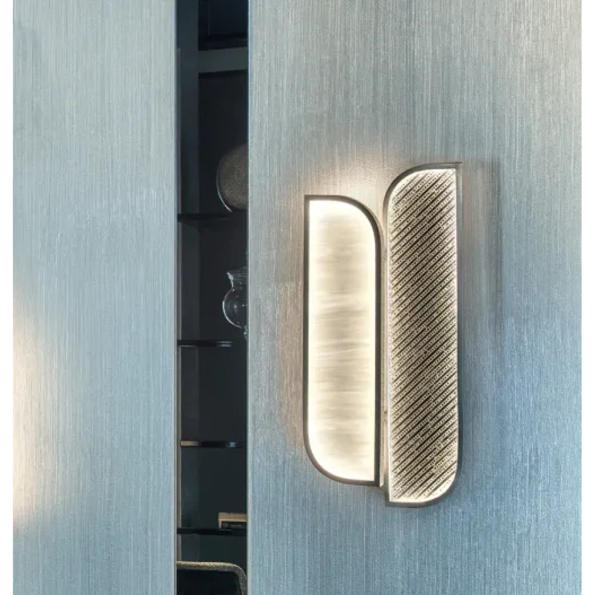 The refined materials and special workmanship make this wall sconce with seductive shapes an enveloping and pleasant lighting fixture. A game of geometries in an elegant combination. The classically inspired extent in contemporary plays an eclectic style, elegant and refined. Interiors express personality. A constant research, attention to quality, use of selected materials and skillful manufacture cured in every detail by master artisans are the core values of the production all made in Italy. The space takes importance in its entirety, free from boundaries. The artisanal workmanship gives life to unique shapes, making each piece an unrepeatable work of art.