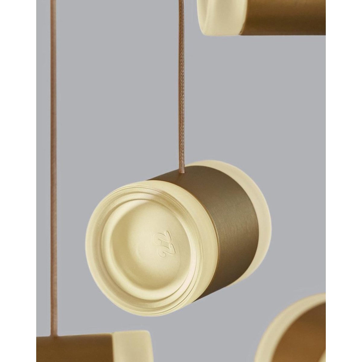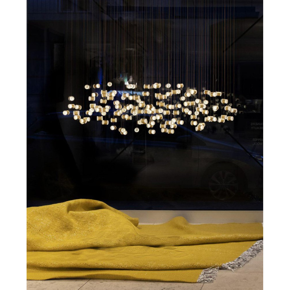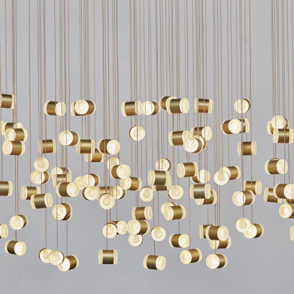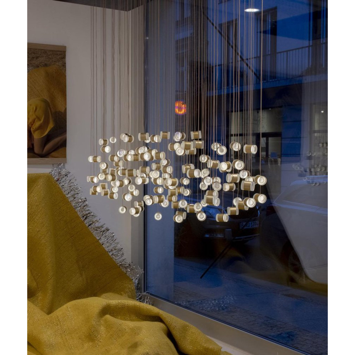 In cooperation with a German cosmetics company as provider of materials and an upcycling platform, this spectacular lighting installation by LLOT LLOV was created from 290 reused face cream containers. Two pots each made of high-quality frosted glass form one lighting element. Due to its industrial production, each glass element has a random numbering on the bottom, this visible graphic detail thus reflects its own history of reuse. The different thicknesses of the glass create different light intensities of the lamps. The 145 dimmable LED light elements are held together by an anodized aluminum centerpiece, shimmering in precious matt gold. Attached to thin coaxial cables, the light bodies appear to float. Their orientation is random, only their height is fixed. The different materials and their almost cloud-like arrangement create lively shadows and reflections in the room. This lighting installation is a special production and can be adapted according to customer requirements.