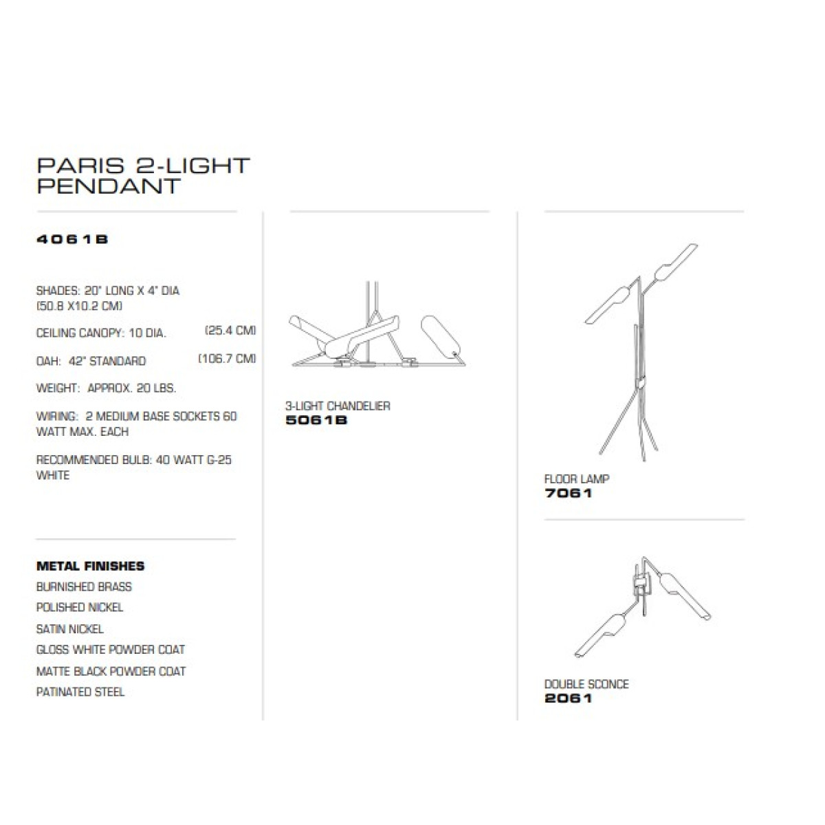 Paris 2 Light Pendant shades: 20" long x 4" dia, canopy diameter: approx. 10”, OAH: 42”, weight: approx. 20 lbs., wiring: 2 medium-base sockets, 60-watt max, recommended bulb: white G25, finish: gloss white powder coat with polished nickel accent. It's Stem and Canopy Finish: Gloss white Powder coated, Matte Black Powder Coat, Painted Steel and Shade Interior Finish: Dutch Gold, Dutch White Gold, Dutch Platinum, Painted White or Shade Exterior Finish: Dark Antique Brass, Oil Rubbed Bronze, Gloss White Powder Coat, Matte Black Powder Coat.