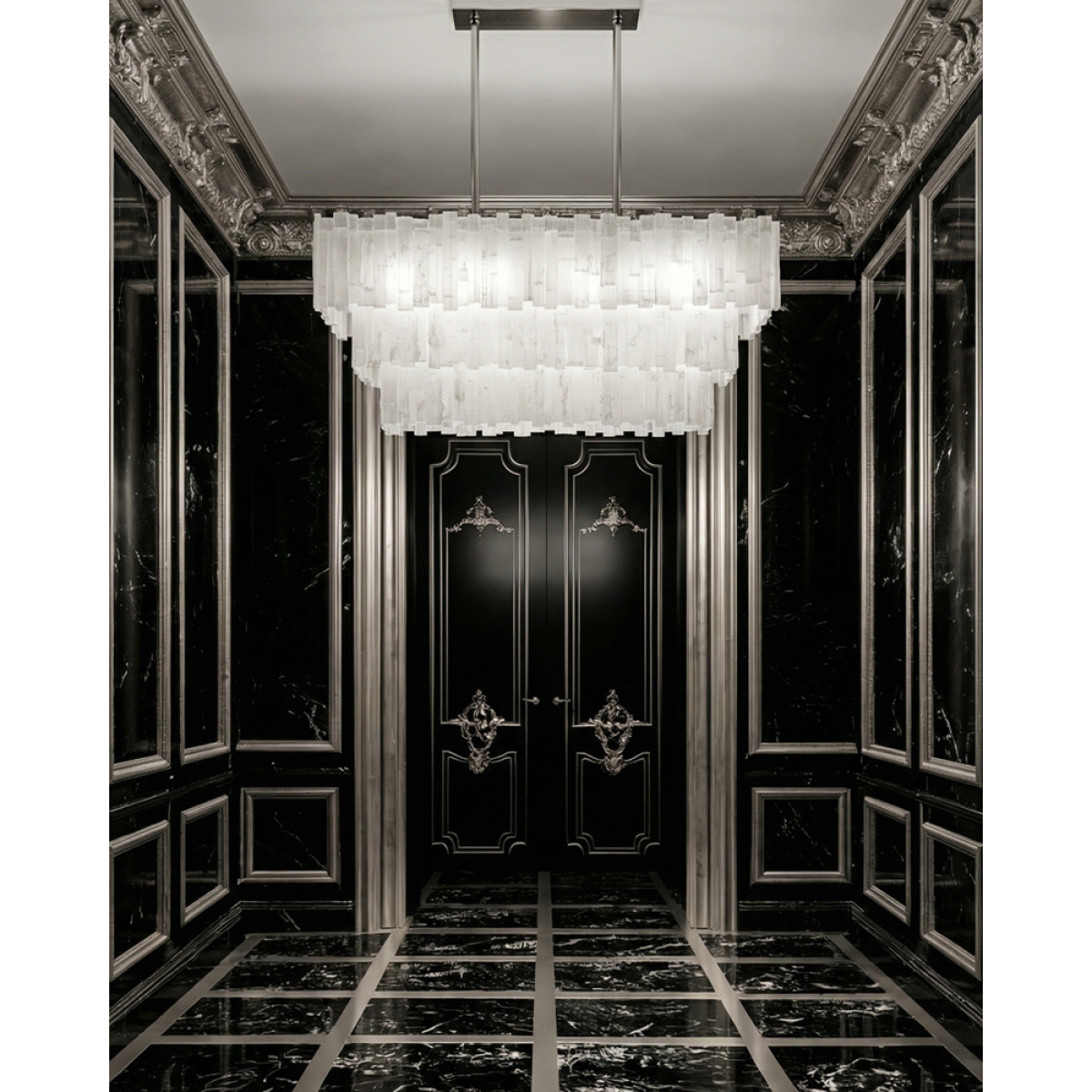 With its sleek rectangular shape, this chandelier is sure to make a bold statement in any room. The Selenite crystals are arranged in layers, creating a mesmerizing and otherworldly effect when the light shines through them. Alan Mizrahi Lighting designs create a wide array of custom designed lighting fixtures and furniture according to the exact proportions, dimensions and specifications, to enhance the beauty of their living or working space