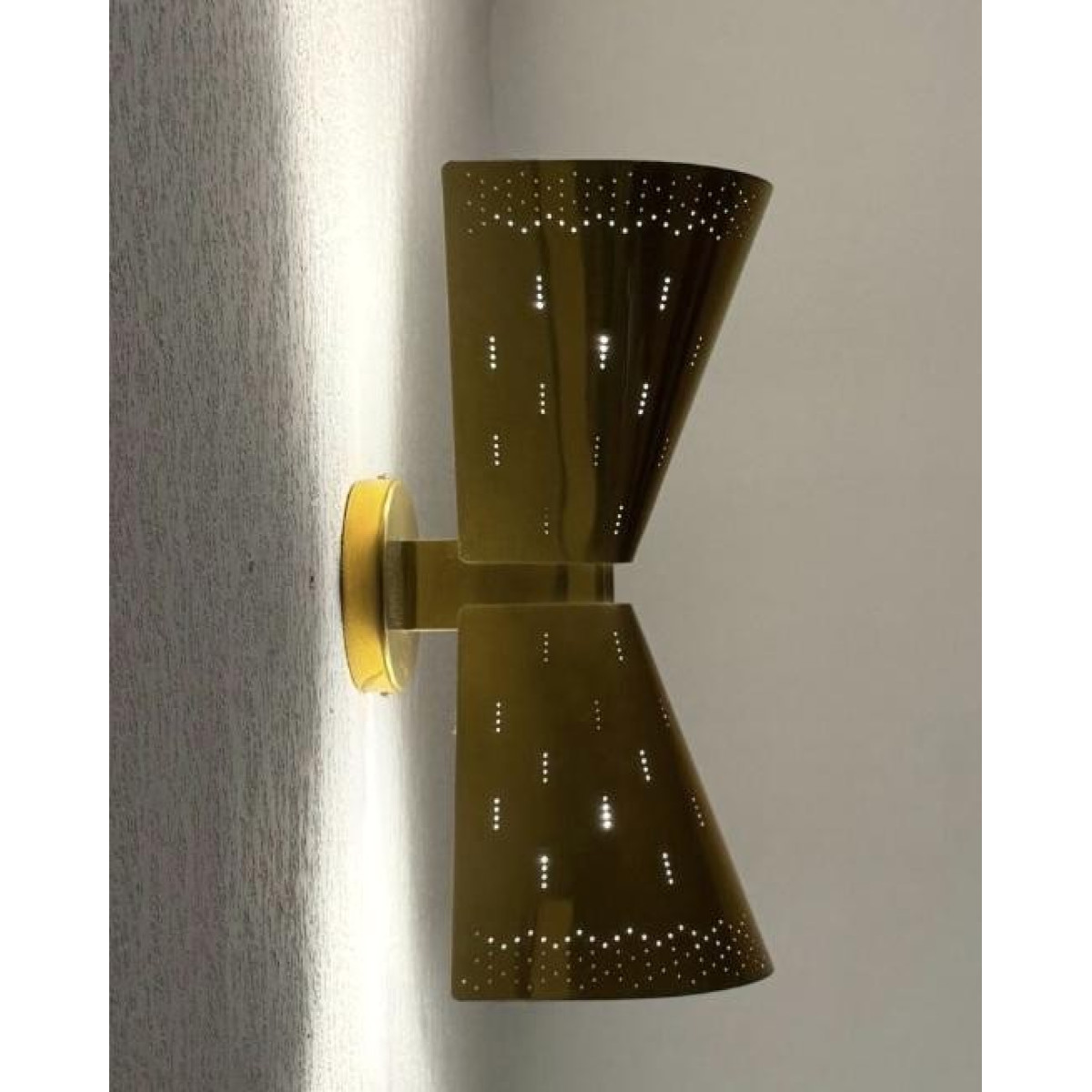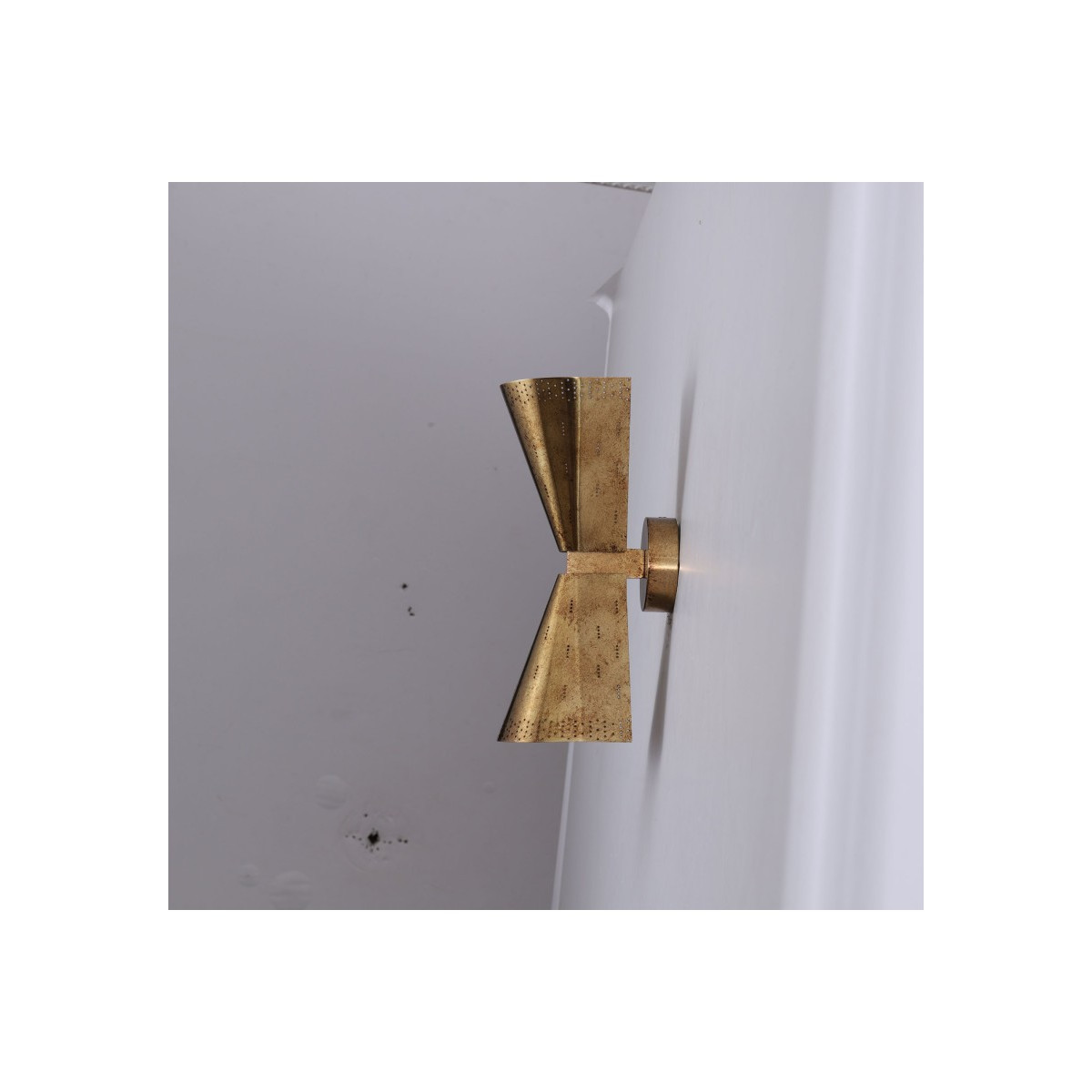 An outstanding pair of Paavo Tynell wall lamps, manufactured by Taito Oy in Finland in the 1950s. This glaring pair of lights is in full brass with minimal details that gives them an amazing appearance when lit up. Both items are in full original condition with a beautiful patina to further add to their story. The lamps can be polished upon request for an agreed upon fee/price.