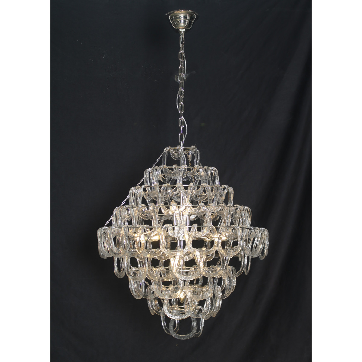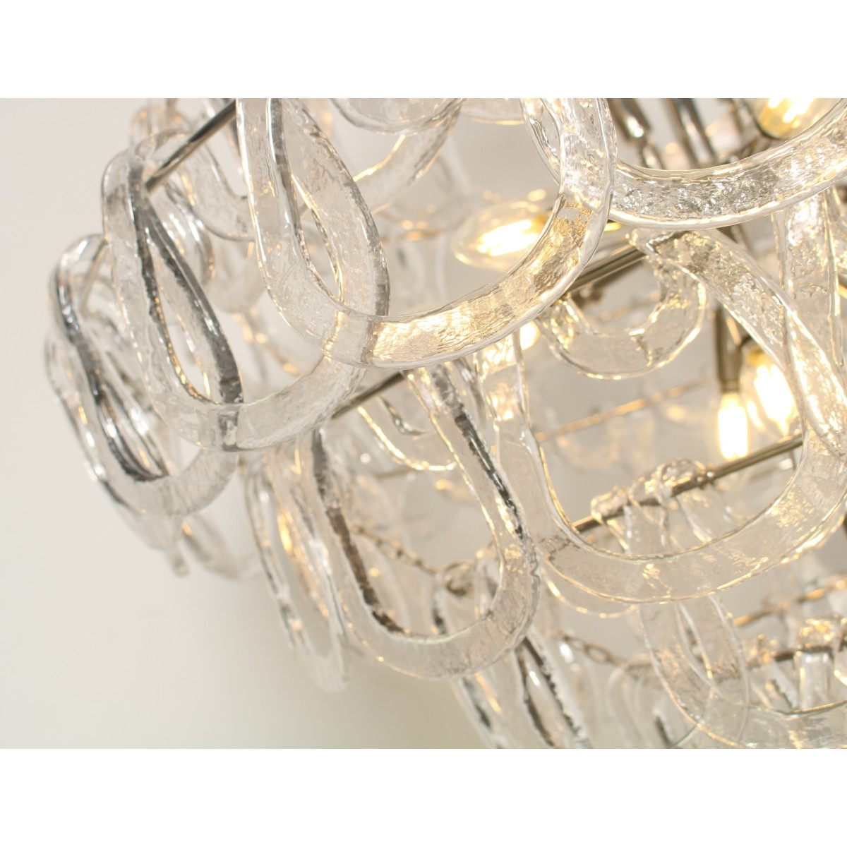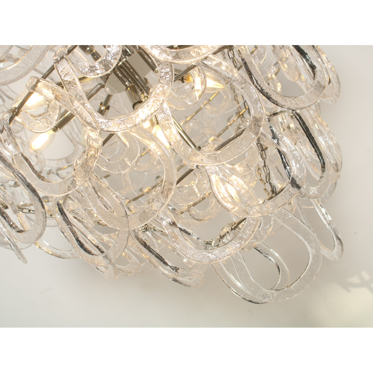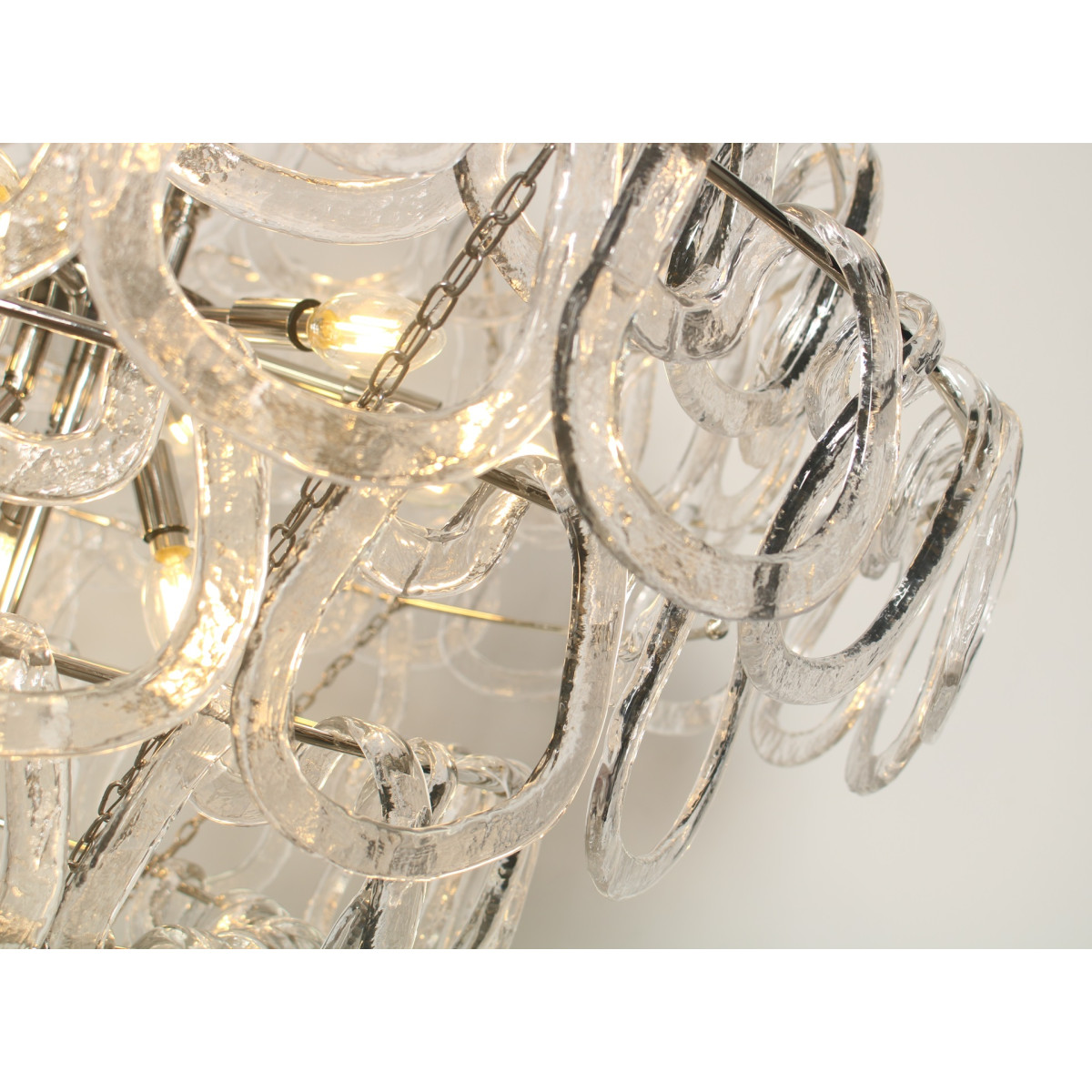Inspired by a piece of 20th-century glass, this design is dynamic and uplifting. Glass is hand-blown into individual horseshoe shapes which cascade from a nickel frame, creating a striking decorative effect. Hand-blown glass is formed into individually crafted horseshoe shapes. The glass pieces are repeated, interlocked, and tiered on a nickel-plated steel frame. Also available as a wall light. The Sorbonne Glass Chandelier has beautiful handmade glass horseshoe-shaped pieces overlapping in tiers to create a waterfall of glass reflecting the light.