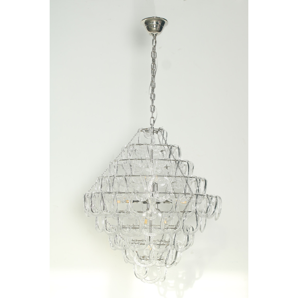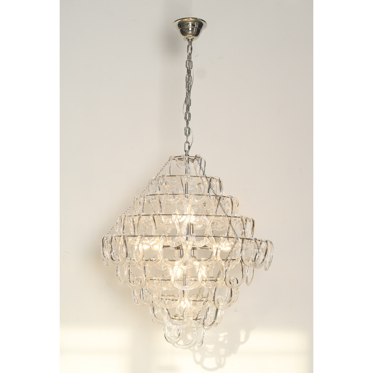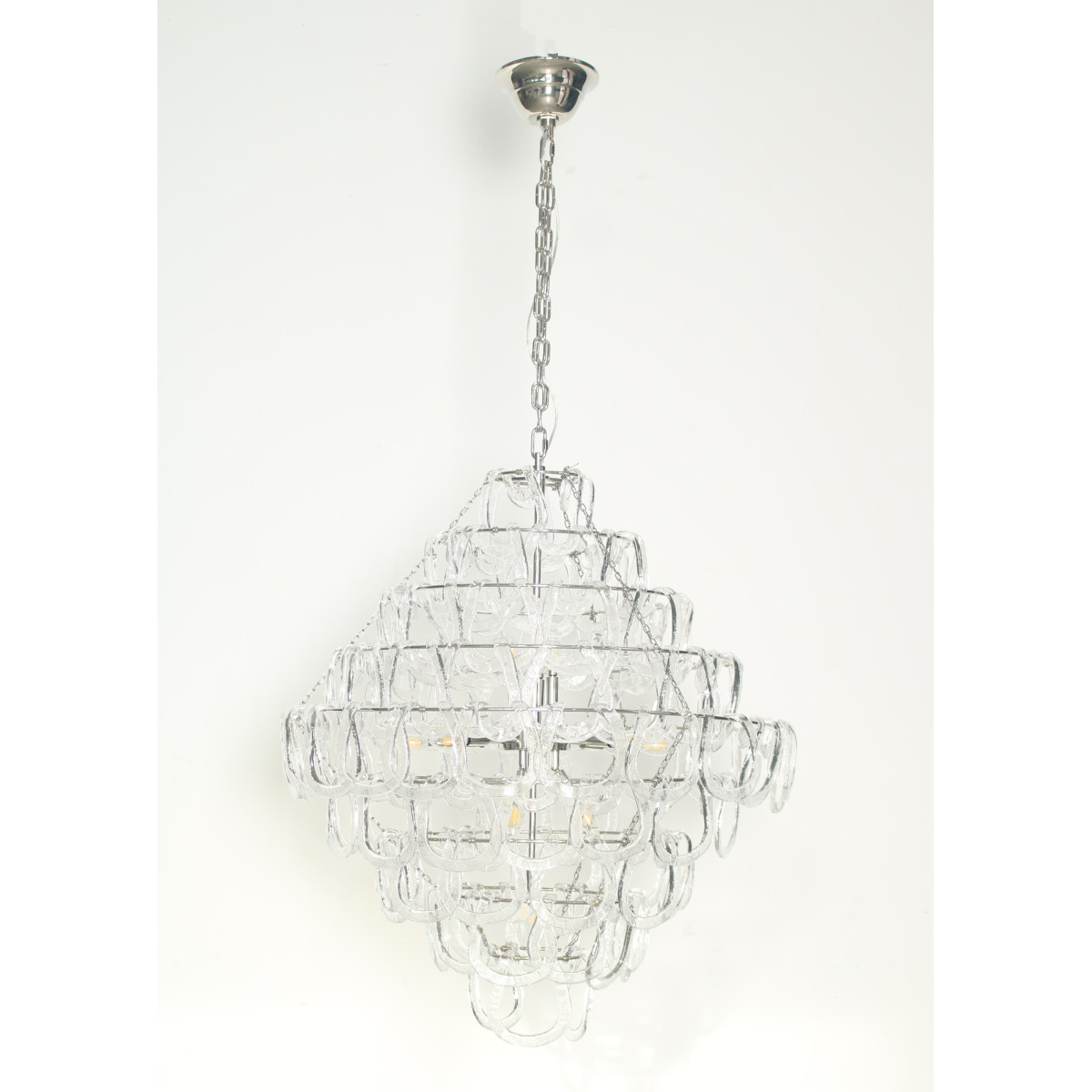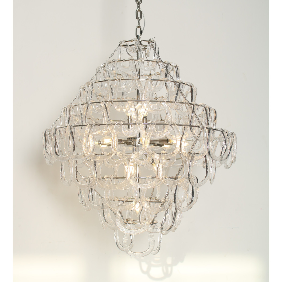 Inspired by a piece of 20th-century glass, this design is dynamic and uplifting. Glass is hand-blown into individual horseshoe shapes which cascade from a nickel frame, creating a striking decorative effect. Hand-blown glass is formed into individually crafted horseshoe shapes. The glass pieces are repeated, interlocked, and tiered on a nickel-plated steel frame. Also available as a wall light. The Sorbonne Glass Chandelier has beautiful handmade glass horseshoe-shaped pieces overlapping in tiers to create a waterfall of glass reflecting the light.