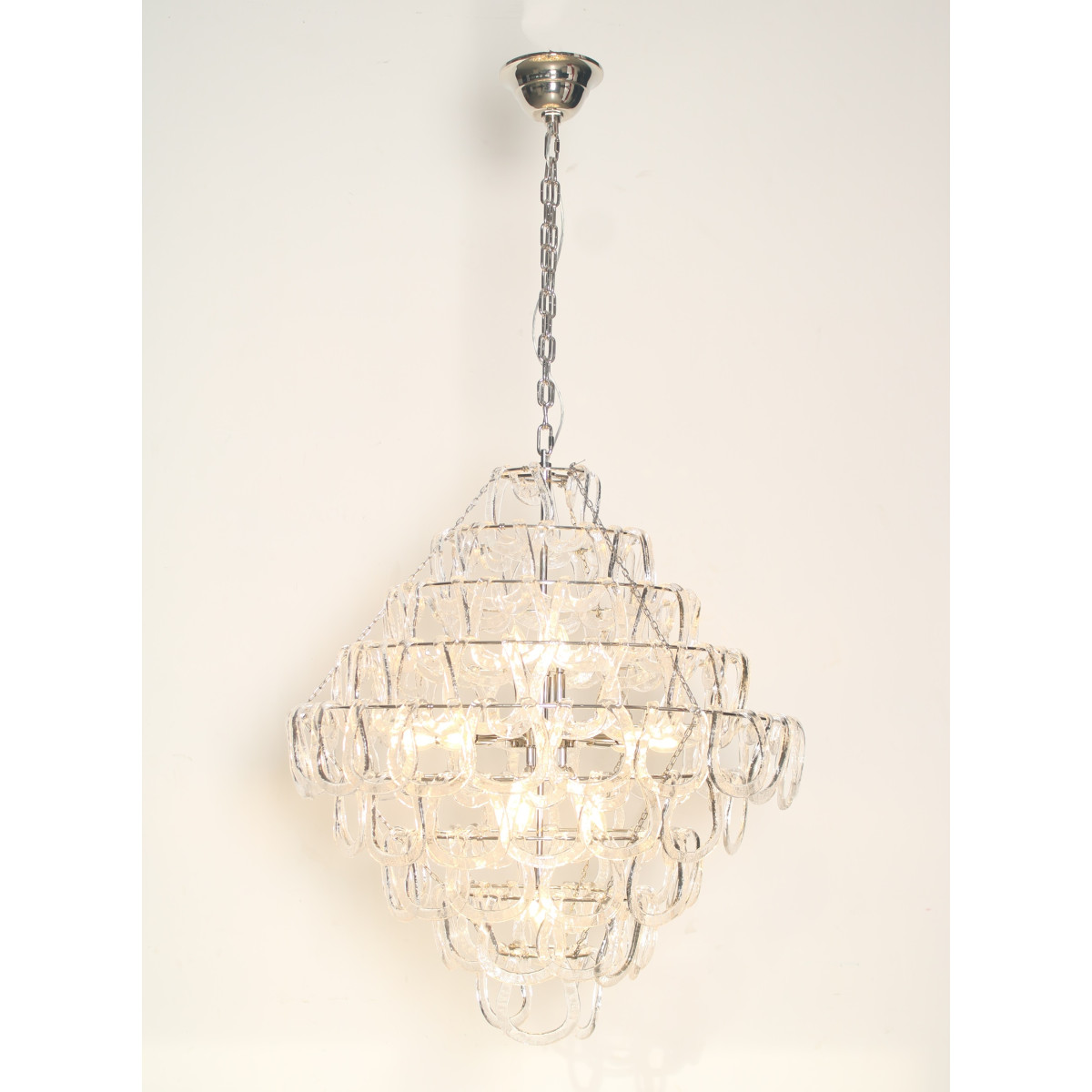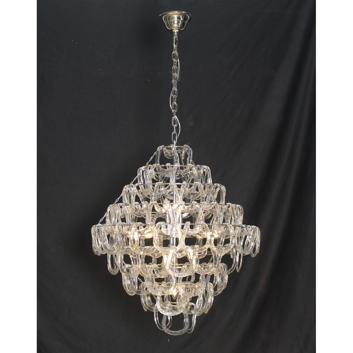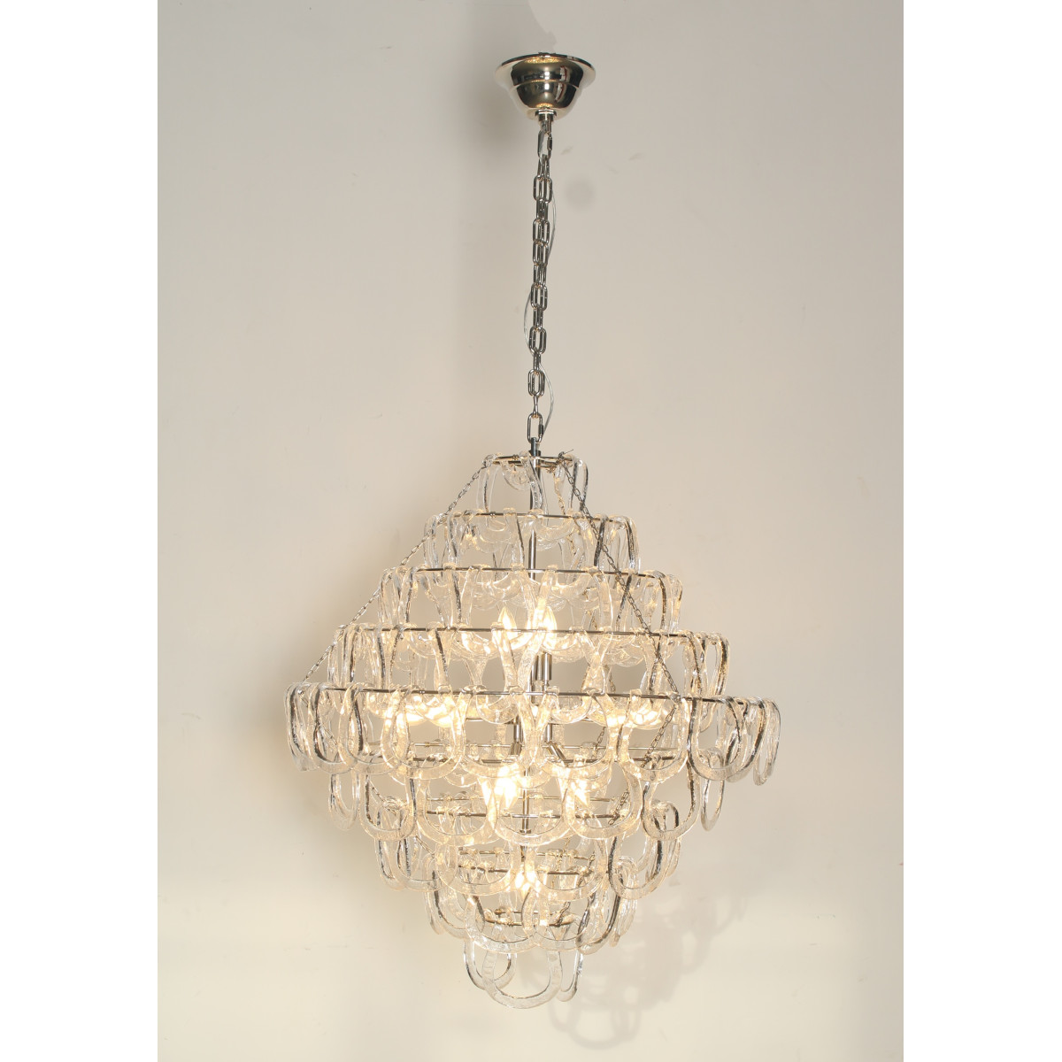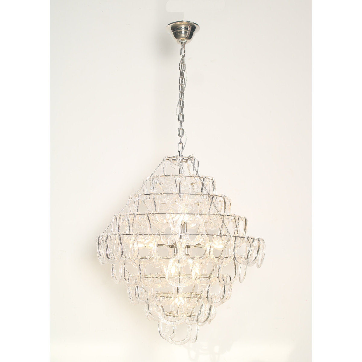 Inspired by a piece of 20th-century glass, this design is dynamic and uplifting. Glass is hand-blown into individual horseshoe shapes which cascade from a nickel frame, creating a striking decorative effect. Hand-blown glass is formed into individually crafted horseshoe shapes. The glass pieces are repeated, interlocked, and tiered on a nickel-plated steel frame. Also available as a wall light. The Sorbonne Glass Chandelier has beautiful handmade glass horseshoe-shaped pieces overlapping in tiers to create a waterfall of glass reflecting the light.