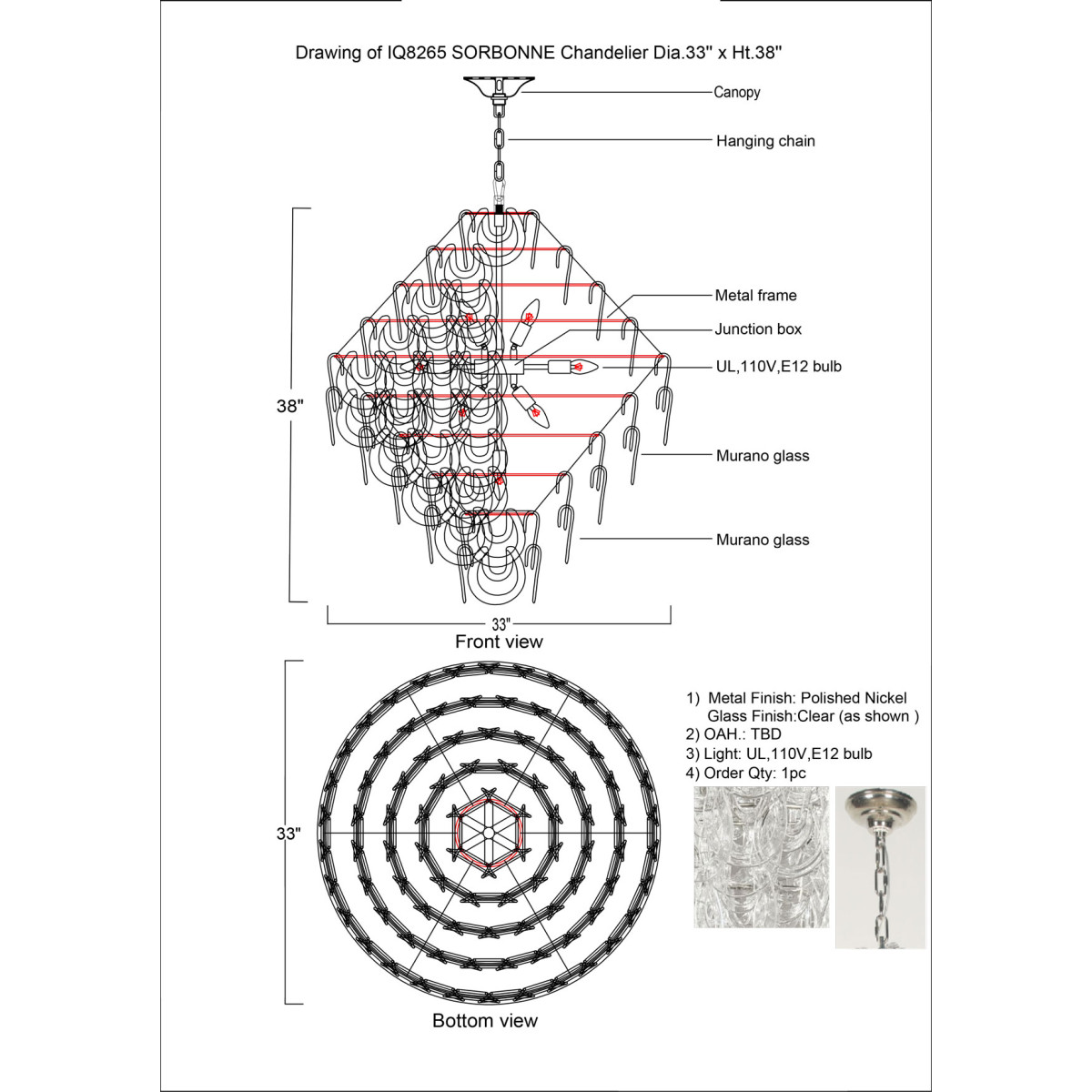 Inspired by a piece of 20th-century glass, this design is dynamic and uplifting. Glass is hand-blown into individual horseshoe shapes which cascade from a nickel frame, creating a striking decorative effect. Hand-blown glass is formed into individually crafted horseshoe shapes. The glass pieces are repeated, interlocked, and tiered on a nickel-plated steel frame. Also available as a wall light. The Sorbonne Glass Chandelier has beautiful handmade glass horseshoe-shaped pieces overlapping in tiers to create a waterfall of glass reflecting the light.