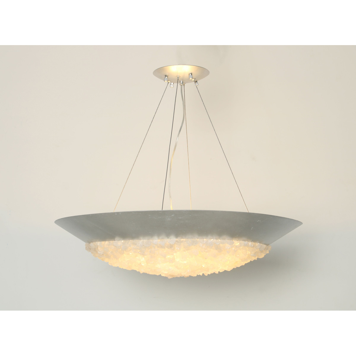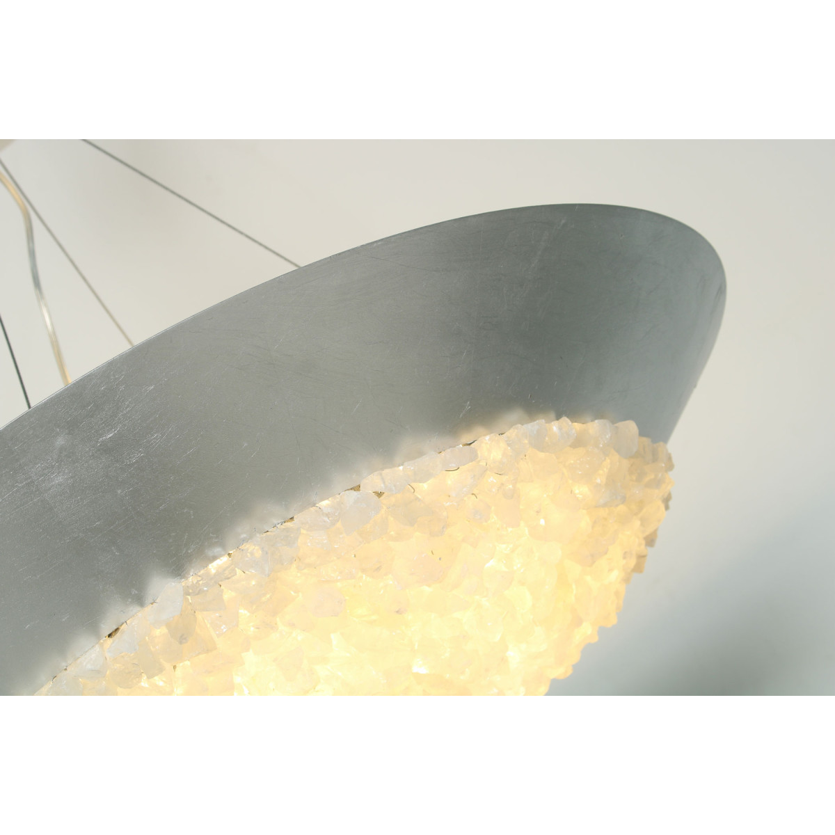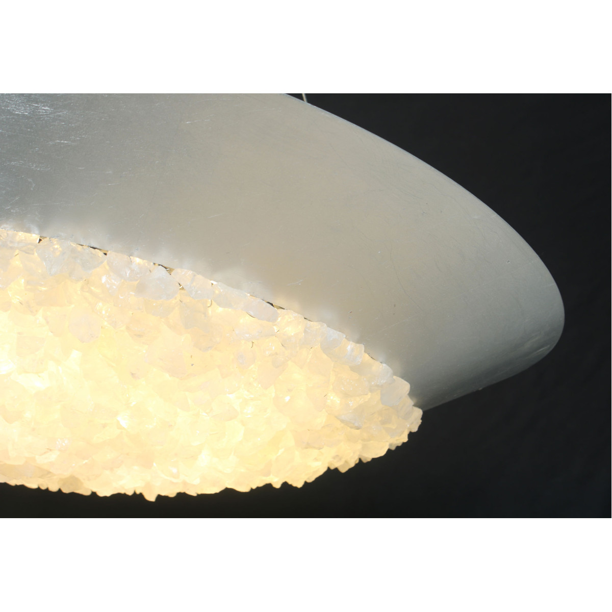 A pendant in a tinted gold leaf finish featuring hundreds of rough cut crystal gems that refract light in a manner reminiscent to the cirrus clouds ice crystals that form the lunar halo in the frozen night sky. Also available in silver leaf or matte black.