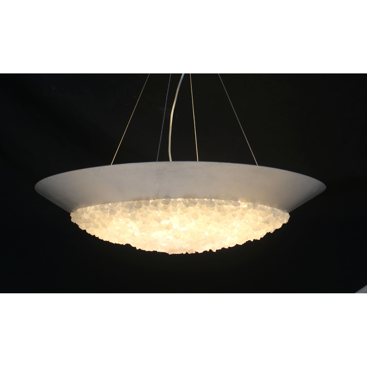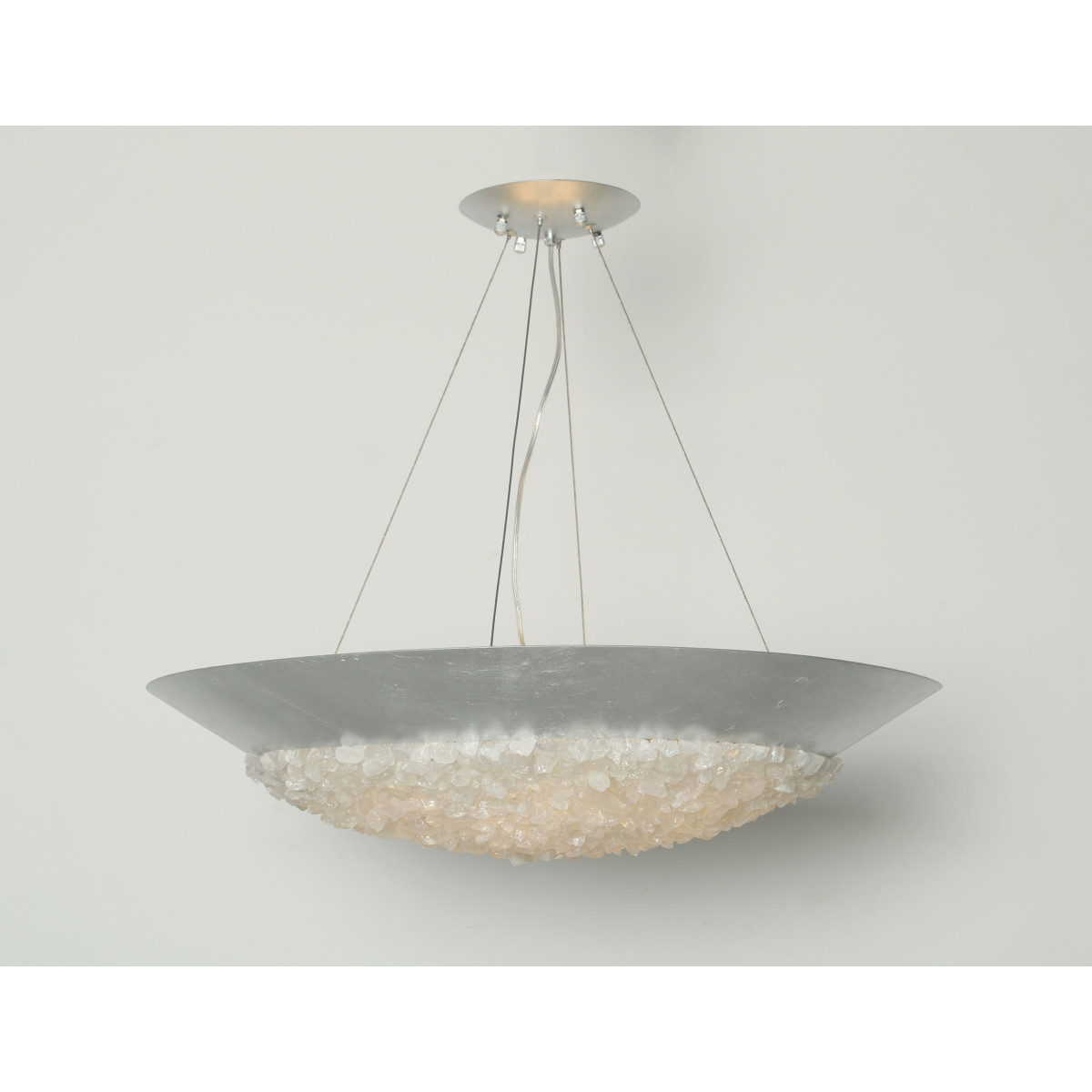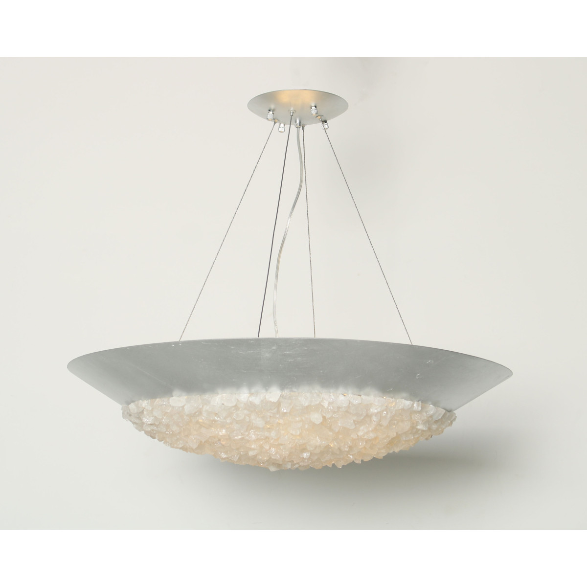 A pendant in a tinted gold leaf finish featuring hundreds of rough cut crystal gems that refract light in a manner reminiscent to the cirrus clouds ice crystals that form the lunar halo in the frozen night sky. Also available in silver leaf or matte black.