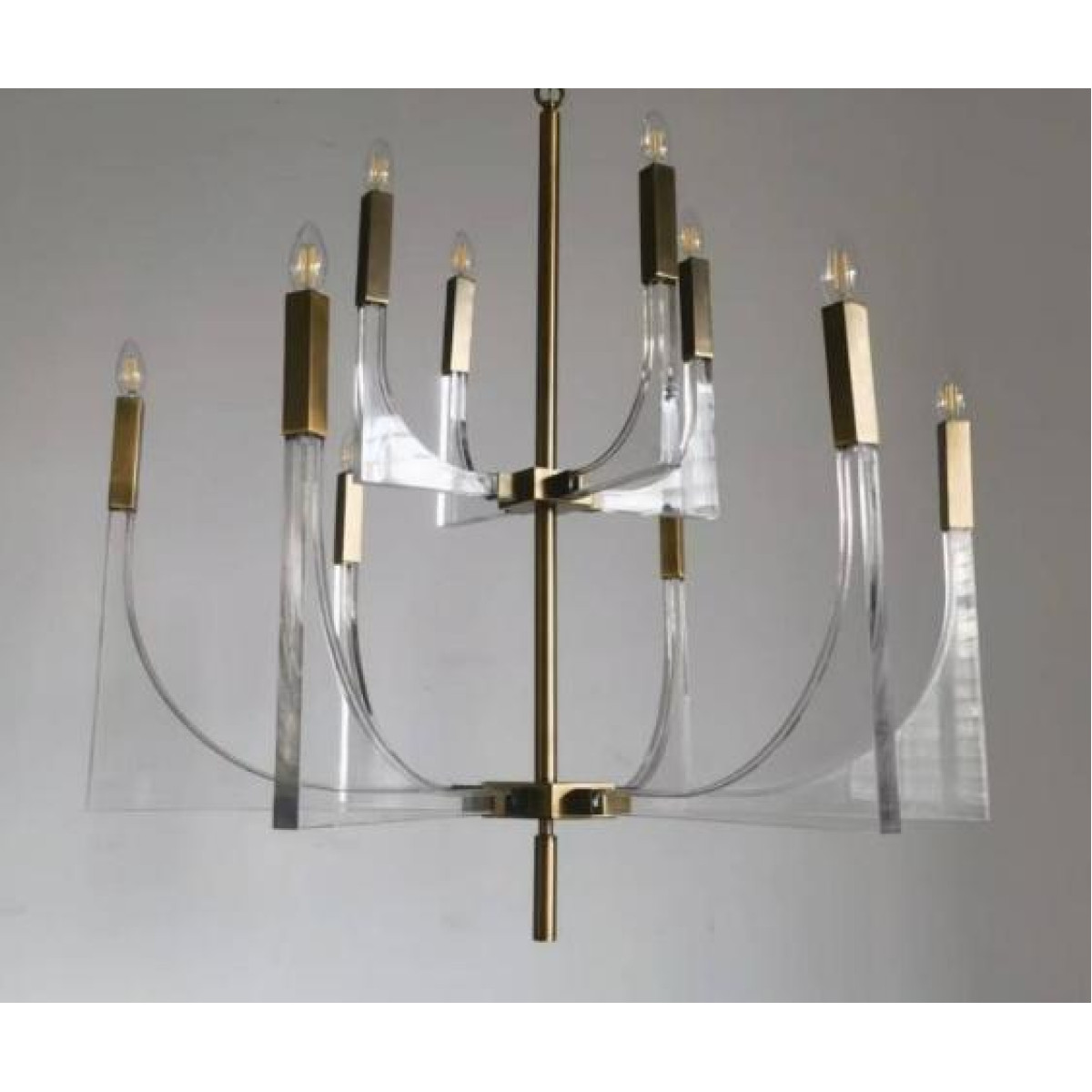 Classic form meets graphic modern design in this 2 tier tinted acrylic and antique brass, 6 light chandelier. The chandelier takes 60 watts, type B bulbs.