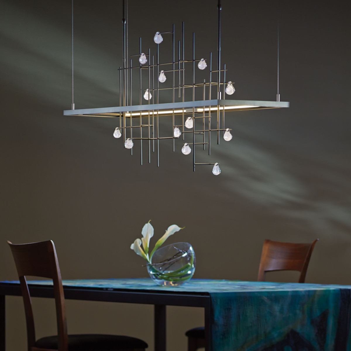 Raindrops cascading down a trellis were the inspiration behind Spring. Each "raindrop" created by the Vermont artisans at AO Glass, captures the light, resulting in an unexpected sparkle. The LED light guide is independently adjustable from the sculpture. Sloped ceiling adaptable to 45 degrees. Double down-rod fixtures can be used in one direction only. The two down-rods must remain the same length. The fixtures will run parallel or along the slope, but not perpendicular or up the slope. Includes adjustable cable, adjustable stem, and canopy kit.
