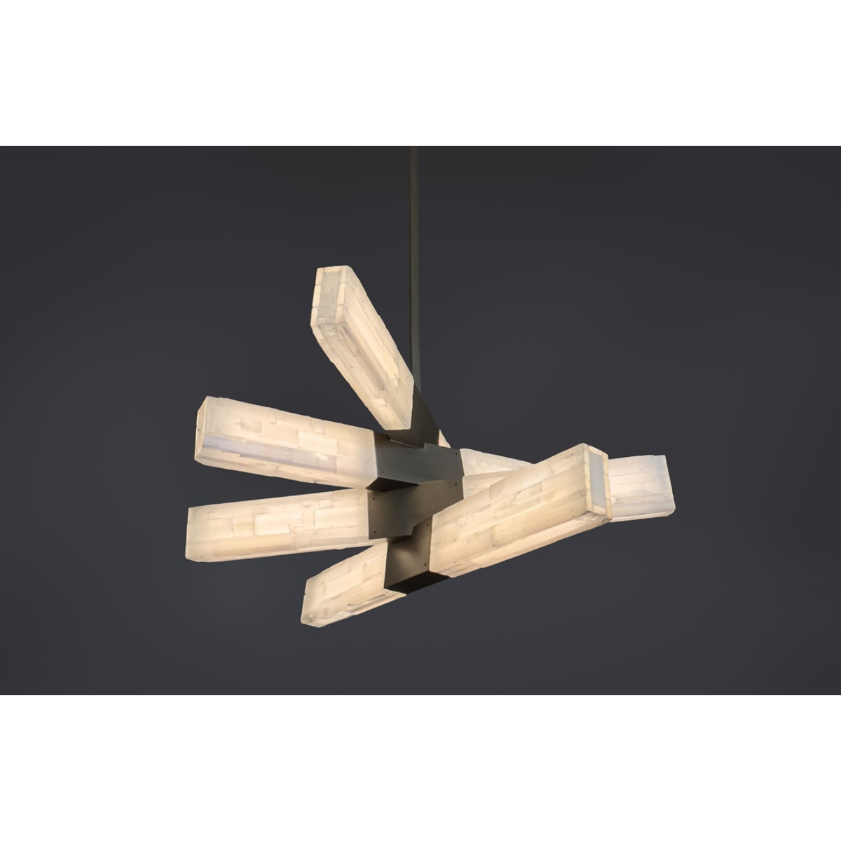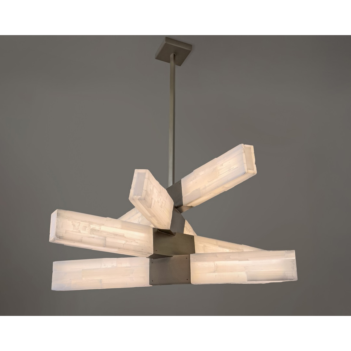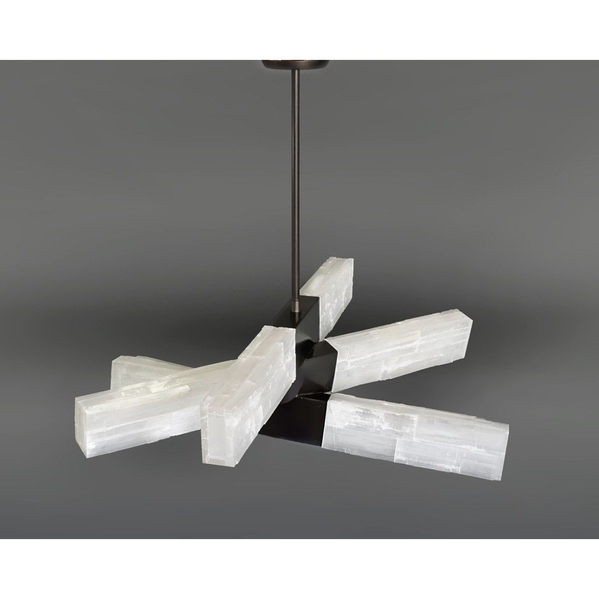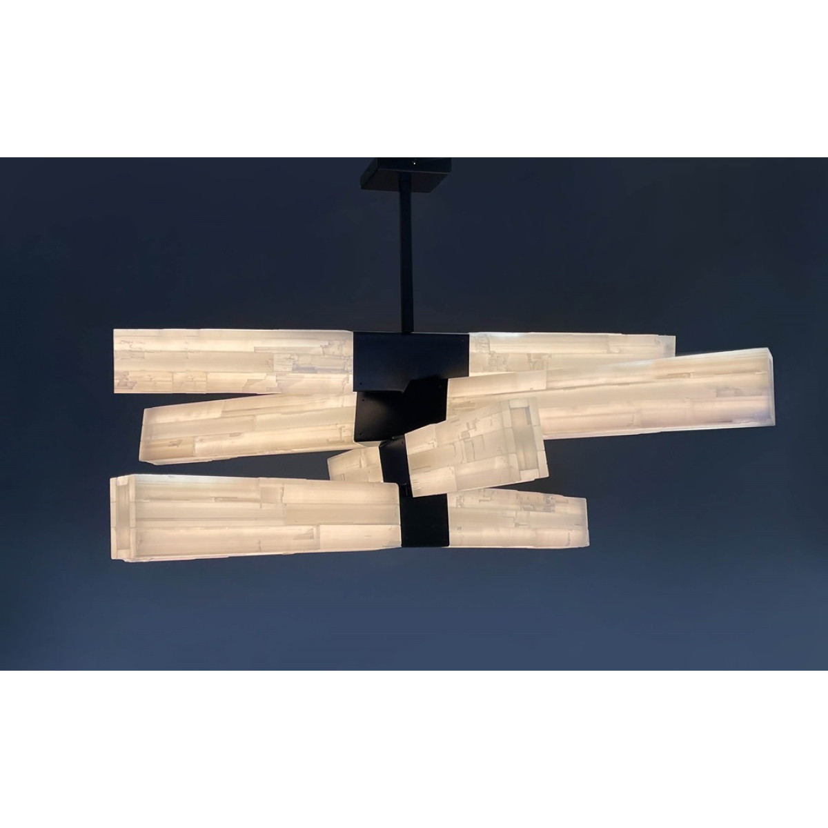 Chiseled selenite on acrylic with 3 or 4 Bars. When the chandelier is illuminated, the selenite bars emit a soft and ethereal glow, creating a warm and inviting atmosphere in any space.