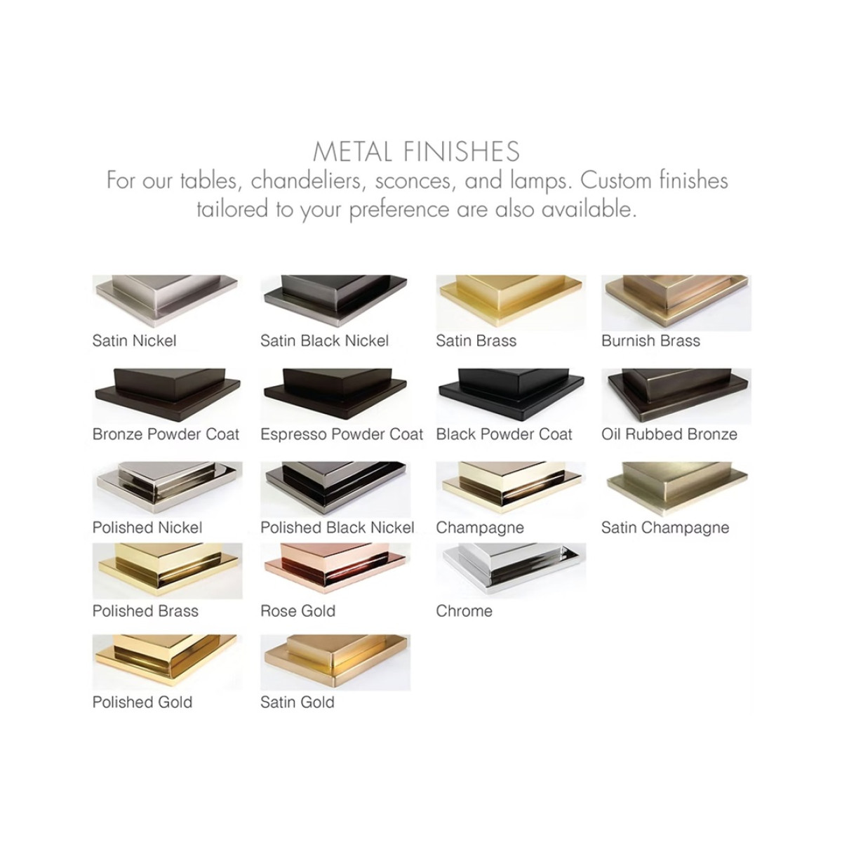 | Optional | Available in custom finishes, sizes, and colors. |