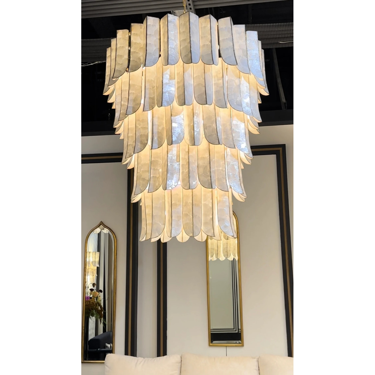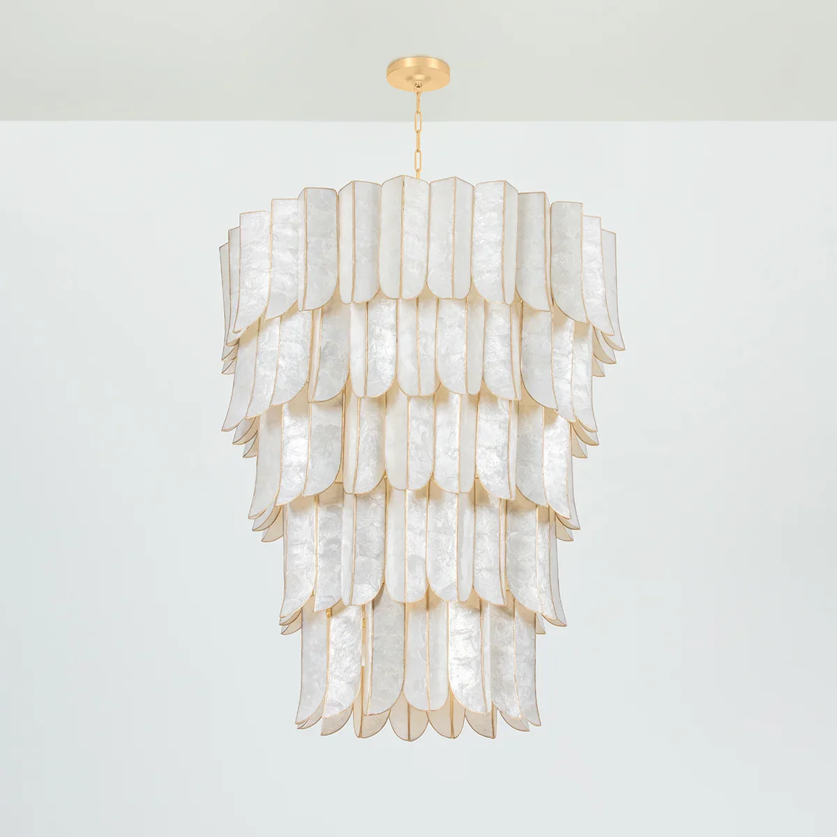 Capturing the dynamism of its namesake city, Cartagena cuts an impressive figure with its shimmering layers and exquisite materiality. Tiers of lustrous leaf-shaped panels crafted from fine Capiz Shell exude drama and decadence. Vintage Gold Leaf heightens the glamor of this statement piece, which comes as a sconce or chandelier in three sizes.