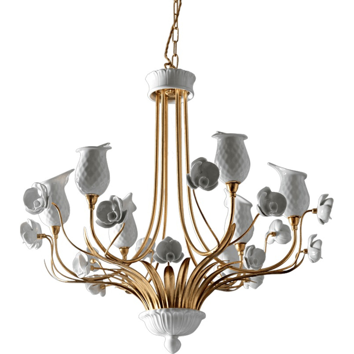 This chandelier is a refined and elegant lighting fixture combining metal, porcelain, and fabric. It marries classic craftsmanship with decorative details — from porcelain sculptures to pleated fabric shades — projecting an aura of sophistication and luxury. Ideal for spaces that benefit from statement lighting with artisan appeal.