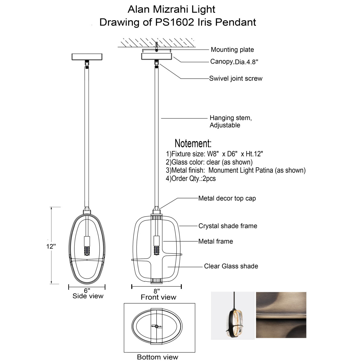 Metal Finish: Monument Light Patina (Different finish available at no additional cost)