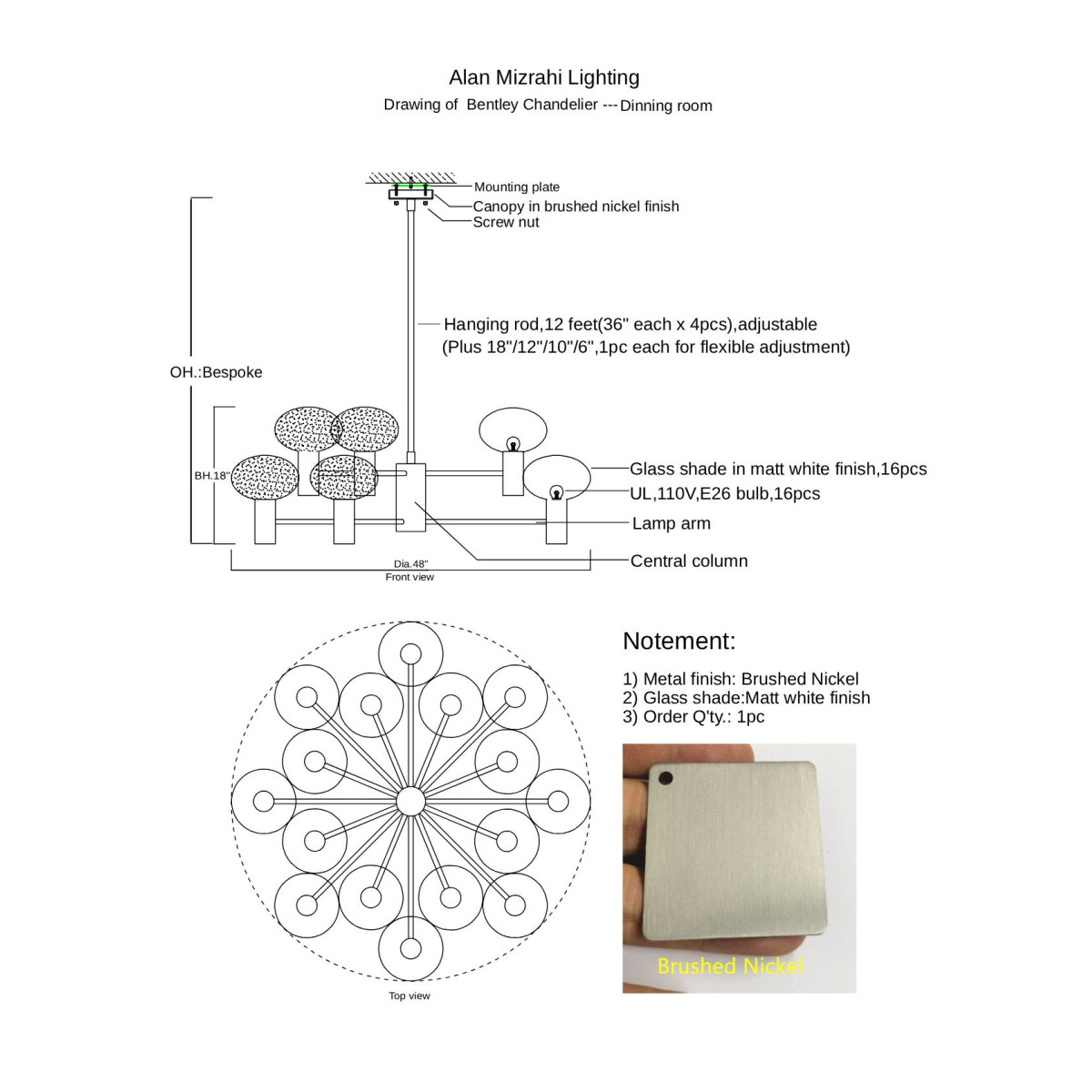 Enjoy the Bentley Chandelier in your home today! Finished in polished nickel, the cylindrical center features several slender arms that spider out in a diamond-like formation to showcase sixteen mushroom-shaped opal glass globes. The connection between the glass and the steel is clean and concise, visually streamlining this piece. Oversized this luxe light is a great solution for personal or professional spaces in need of a little (or a lot!) of luster.