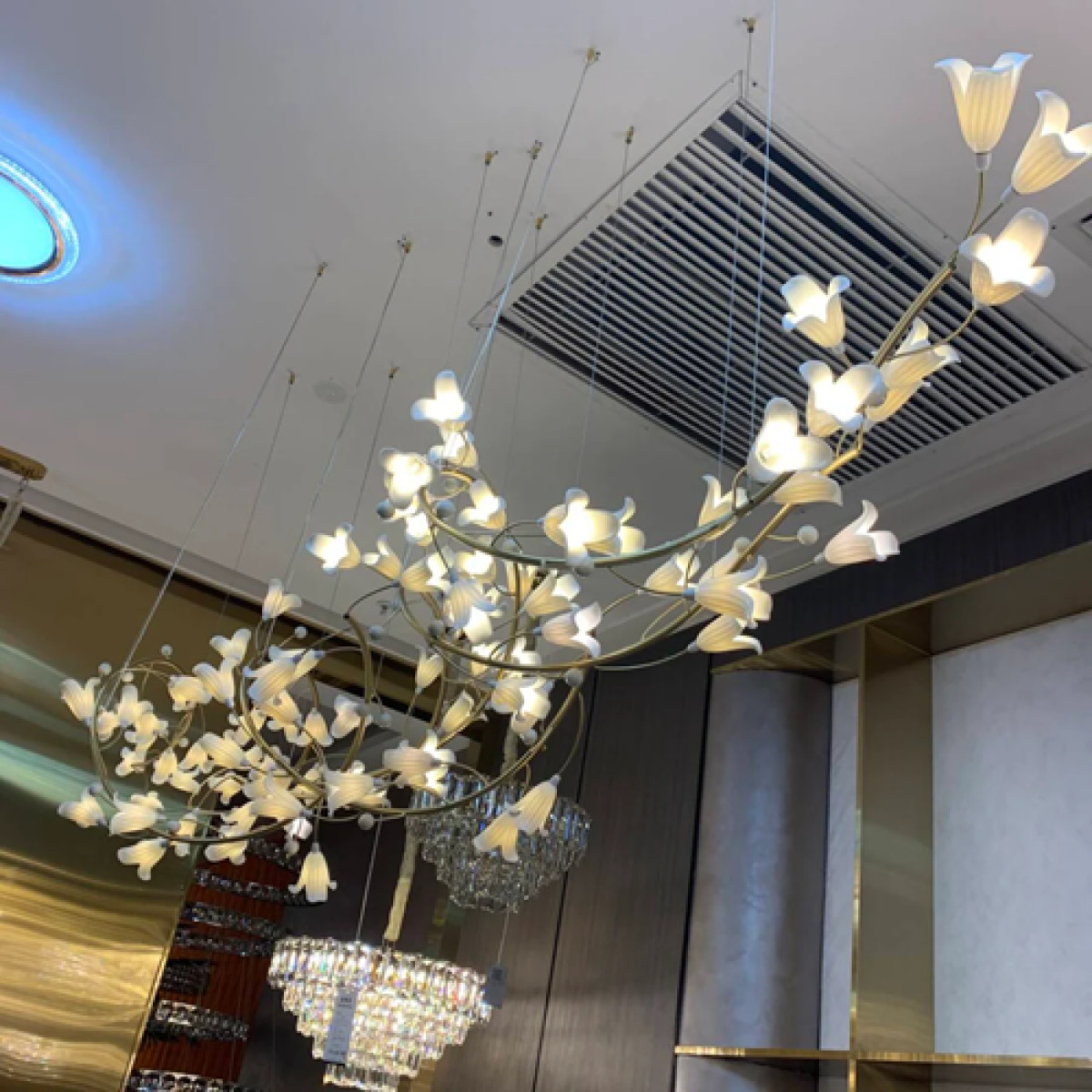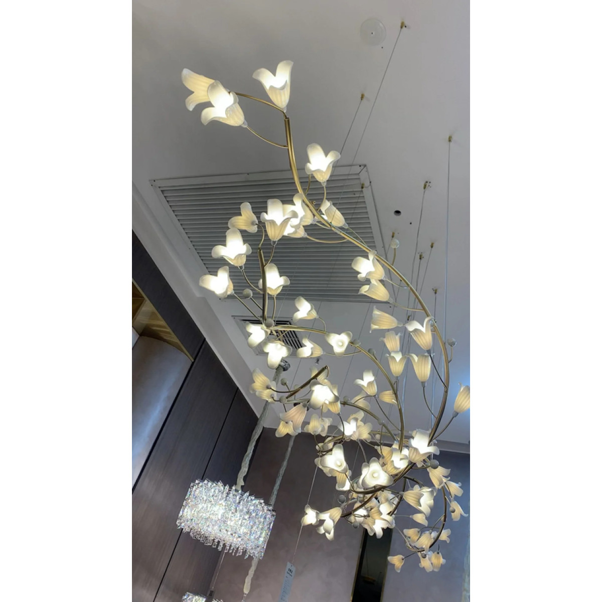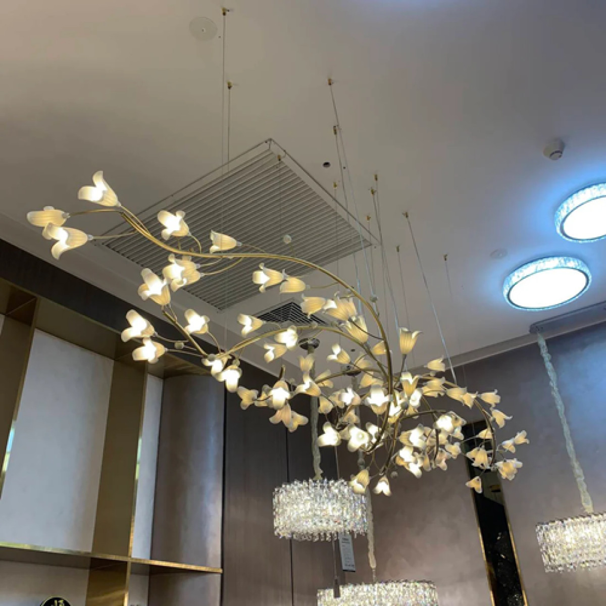A stunning modern chandelier inspired by natural branches adorned with elegant ceramic flower lights. Crafted with premium brass arms that curve gracefully, adding an artistic and luxurious touch. Soft-glow ceramic petals create a warm, inviting ambiance perfect for living or dining spaces. The sculptural design blends contemporary style with organic beauty for a statement ceiling piece. Ideal for high-end interiors, hotels, showrooms, and modern luxury homes.