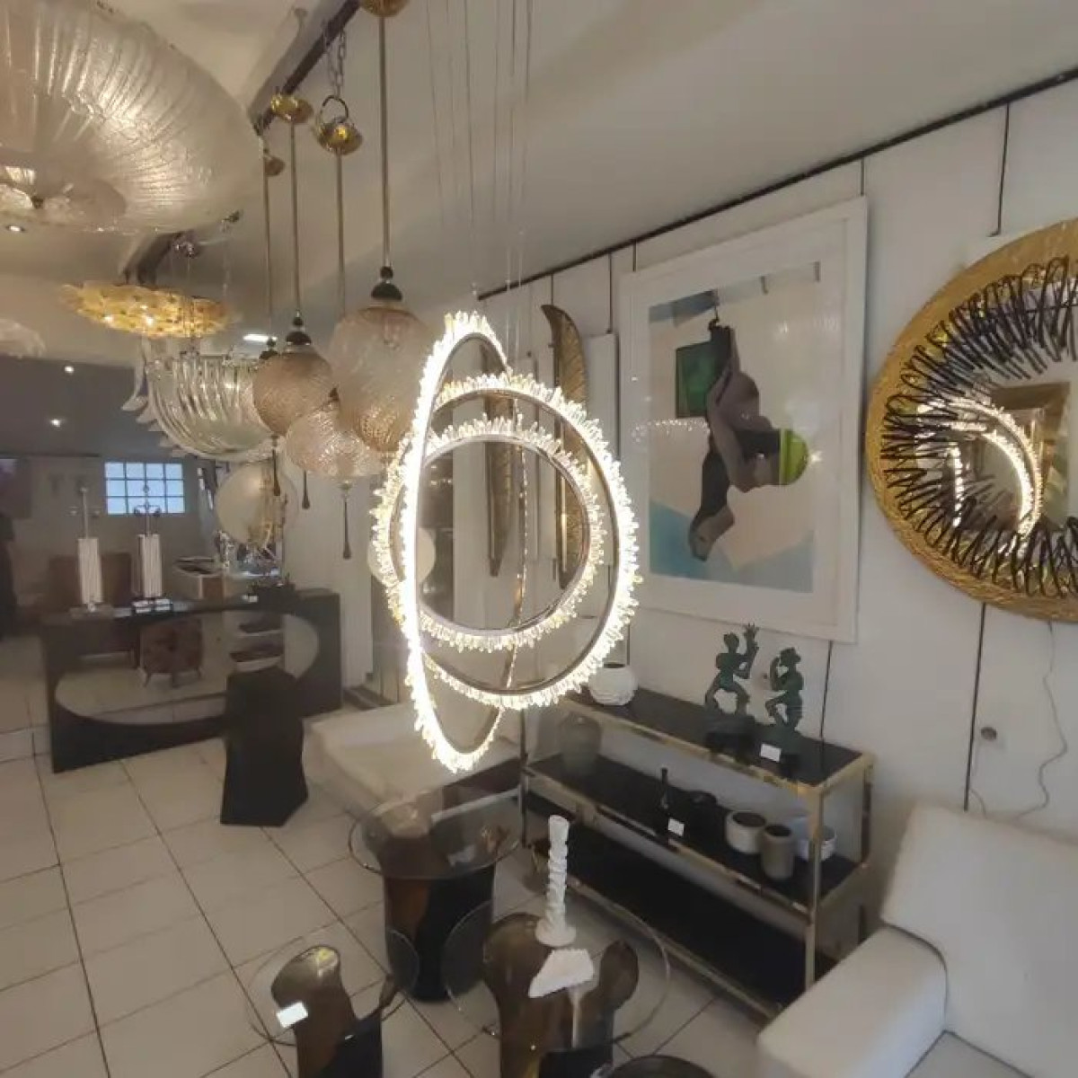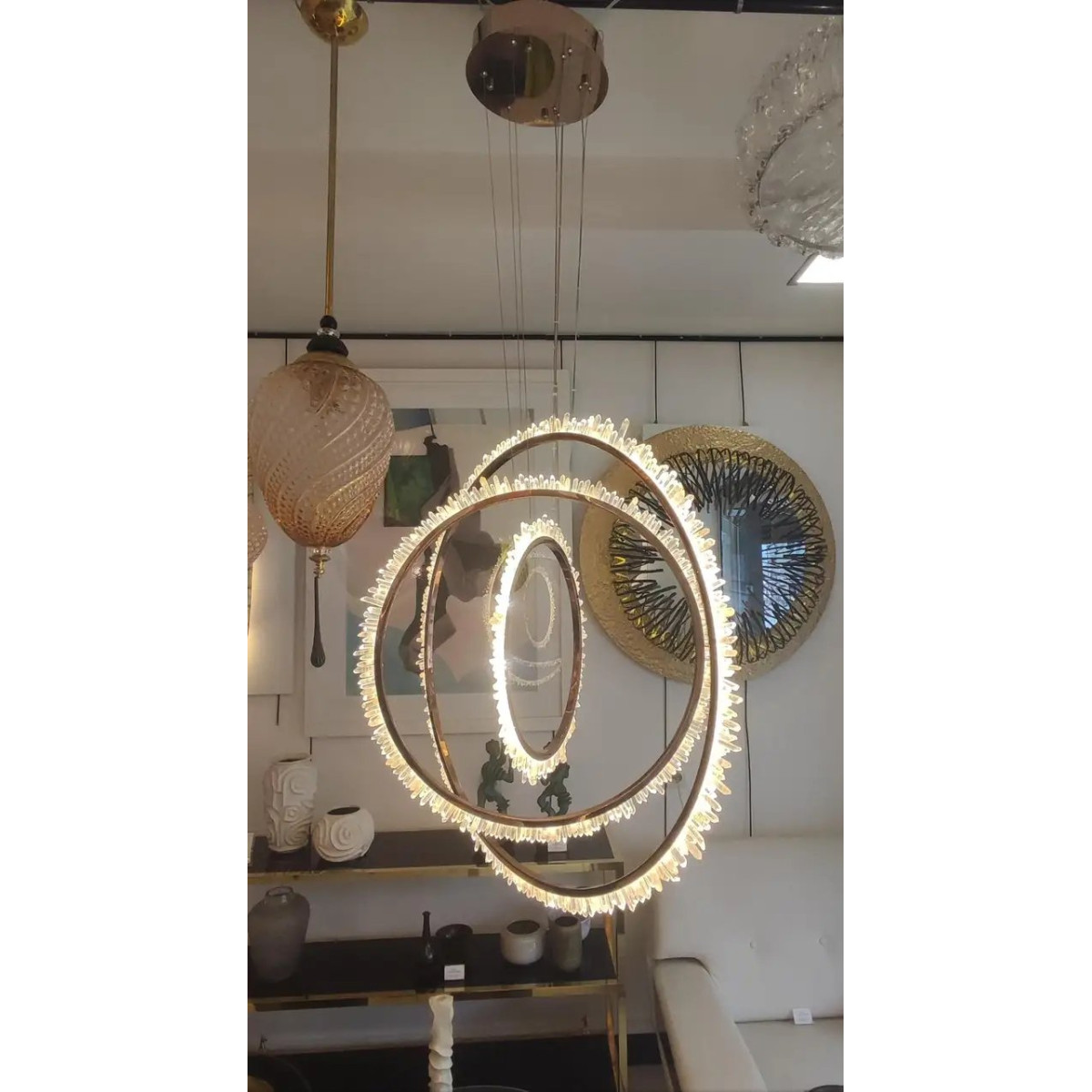 This contemporary ceiling light features 3 nested, circular bands crafted from polished brass that are suspended at dynamic, intersecting angles. Each ring is embellished with a dense perimeter of jagged rock crystals that catch and refract the light for a shimmering, organic effect. The fixture is supported by thin, adjustable cables connected to a matching brass canopy, creating a sophisticated and sculptural focal point.