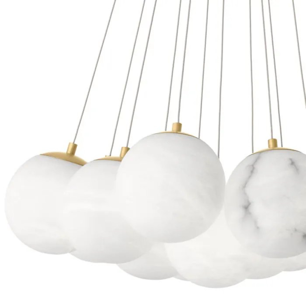 Illuminating, like the moon on a clear night, the Sphinx Chandelier captivates with its elegant composition of smooth alabaster and antique brass finish. Alabaster is a natural material with each piece differing in color, opacity and veining. Wires are adjustable so different compositions can be made. A quintessential piece, the Sphinx creates a harmonious glow in any space.