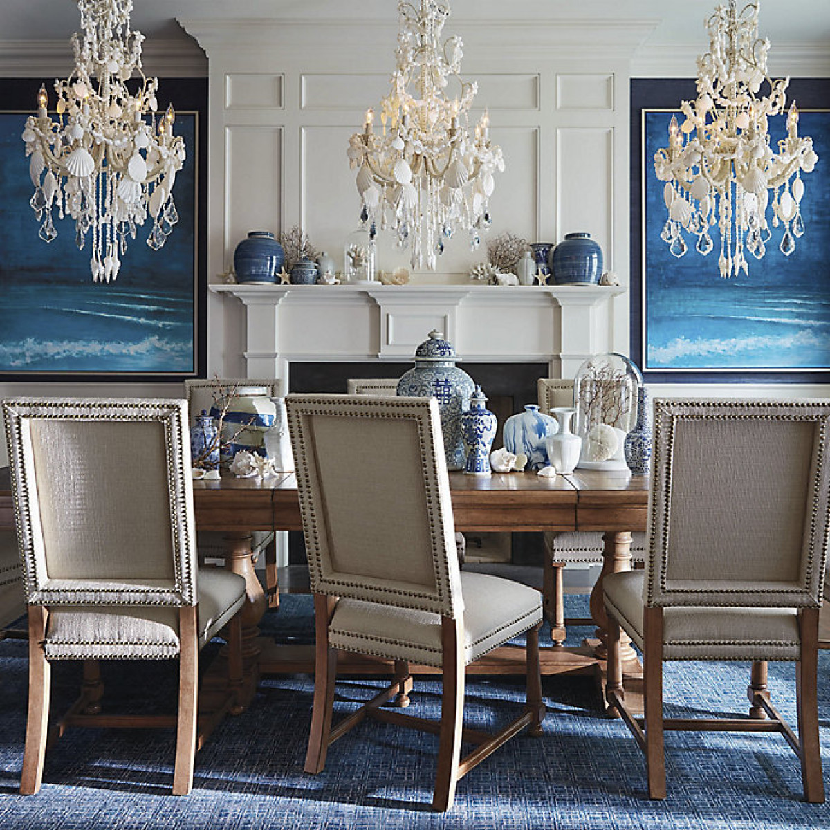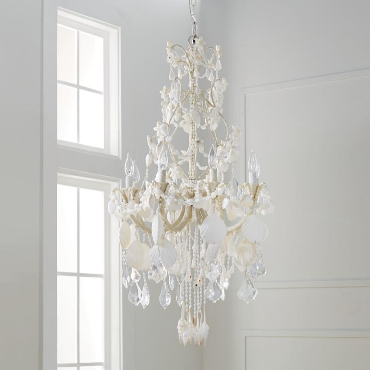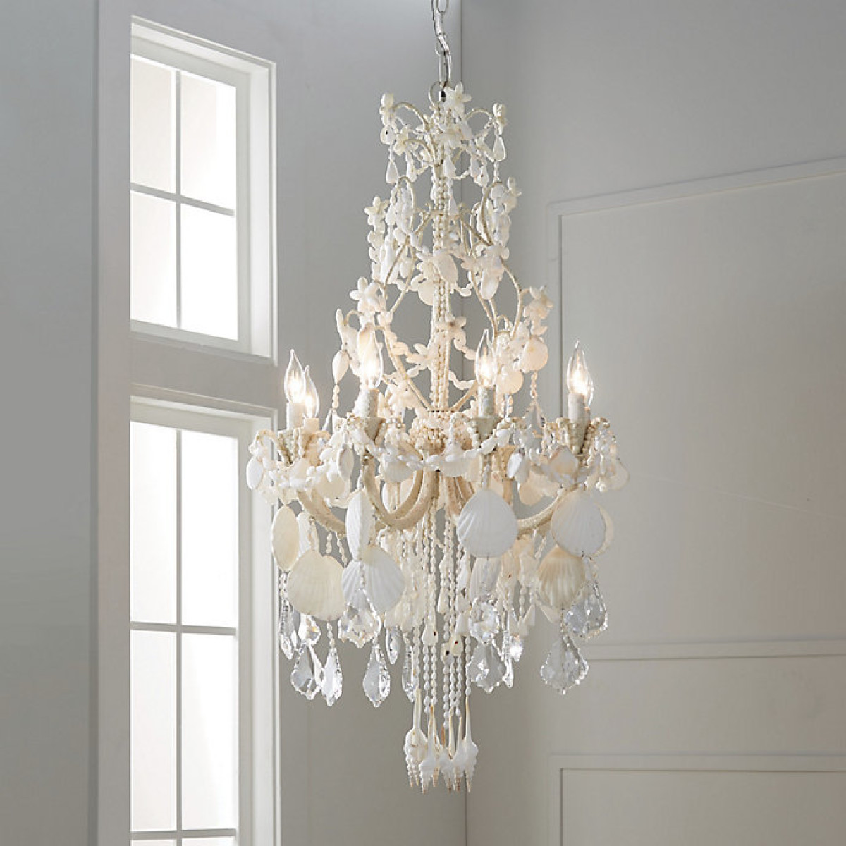 An ethereal symphony of cascading crystals and seashells, our Harbor Shell Chandelier casts a captivating note in any space. The exclusive, all-white fixture features a sand-coated metal frame, which nearly disappears behind a myriad of shells playing the part of draped swags, elegant teardrops and floral accents.