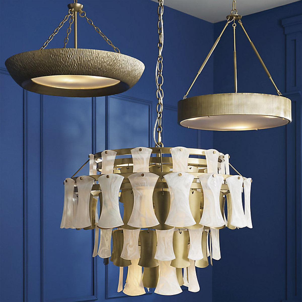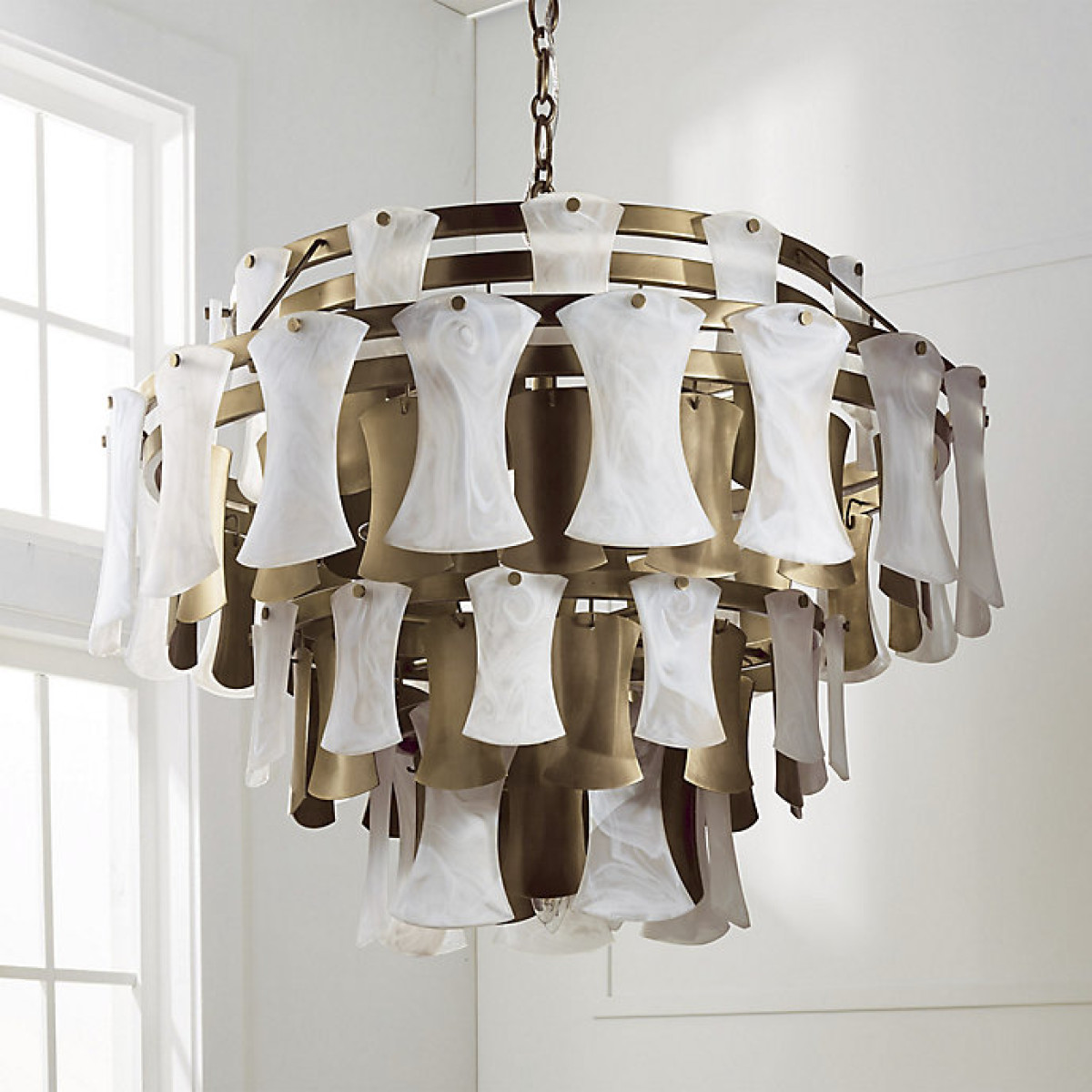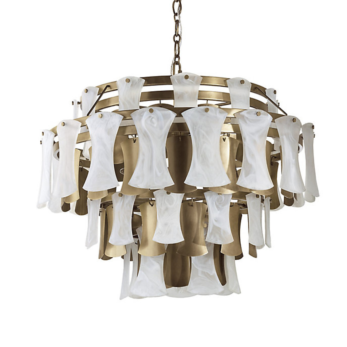Cassandre lighting includes a unique swirl design on glass inspired by alabaster mineral rock. Matching shaped burnished brass metal accents on alternating tiers have curved features that add a decorative touch in any room.