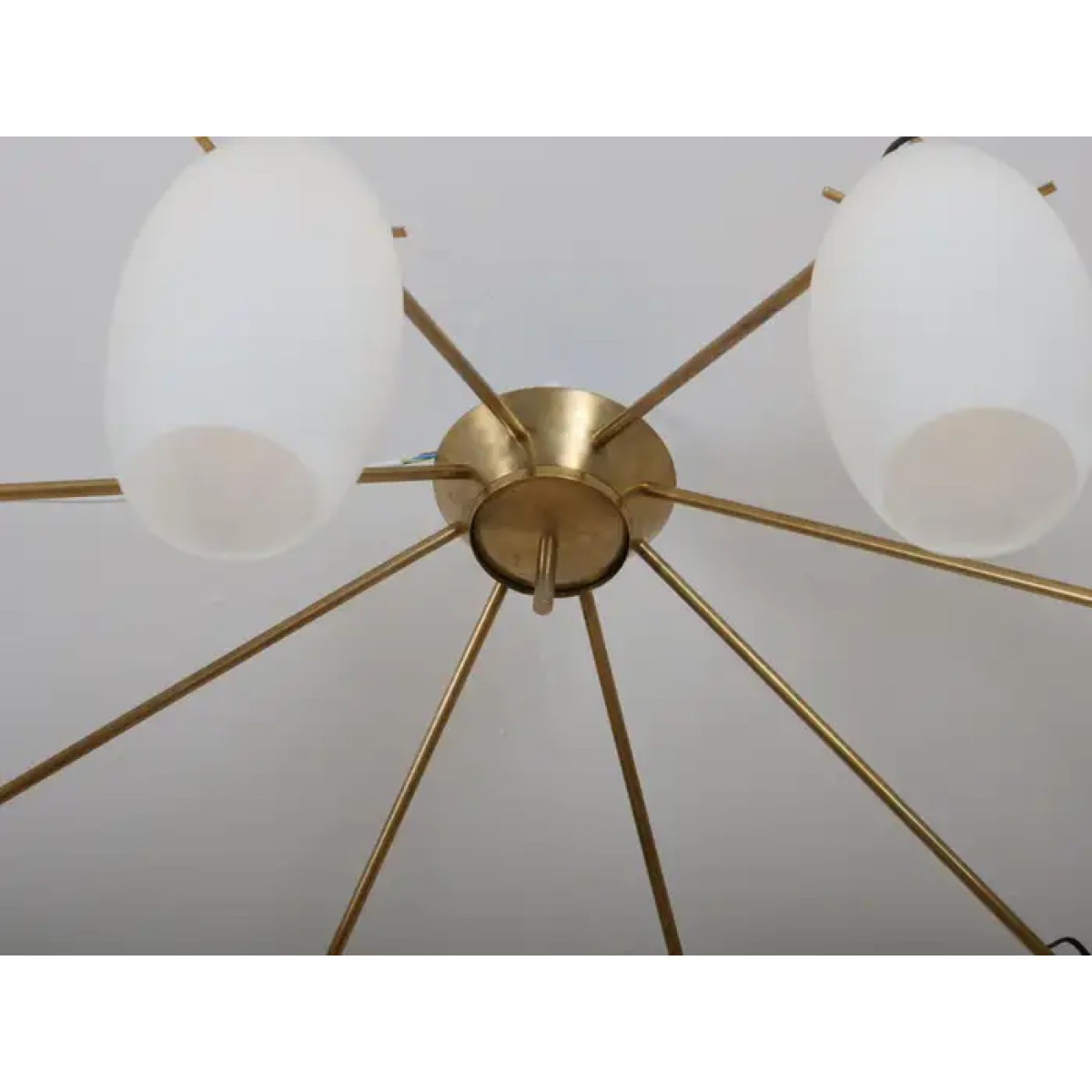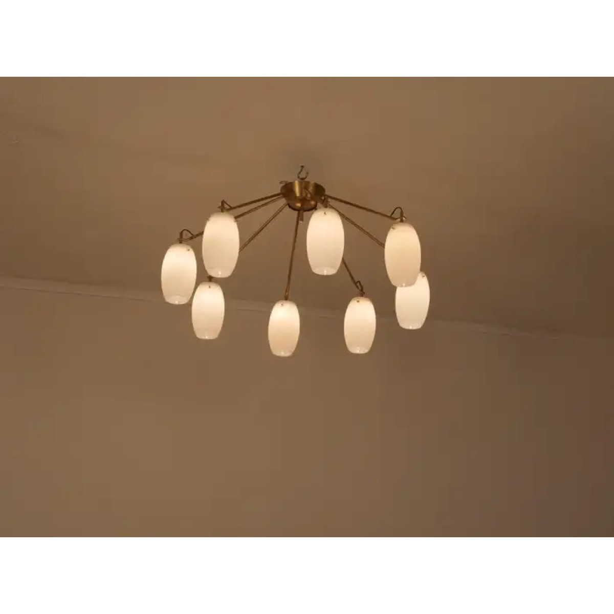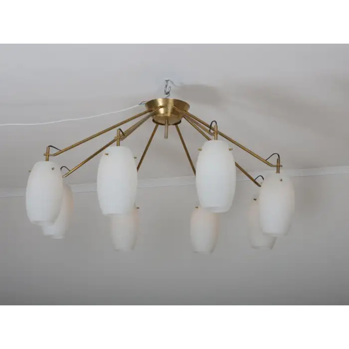 Elegant Stilnovo 8 shade chandelier. Italy c1950. Brass structure with satin glass shades
