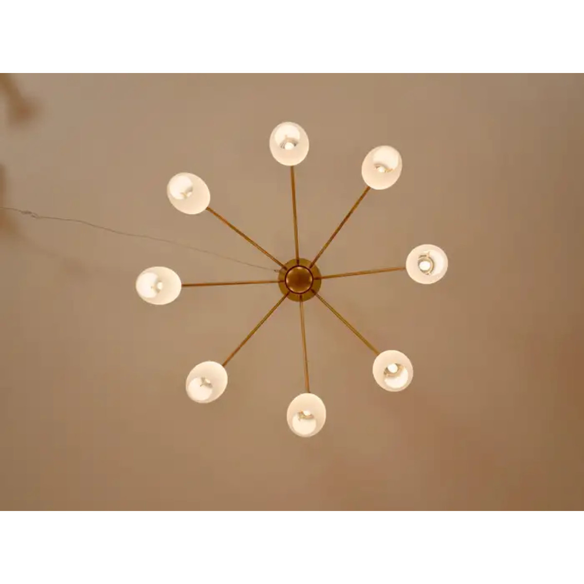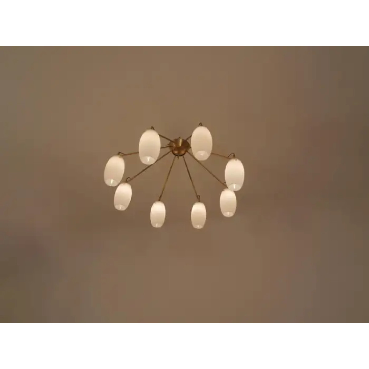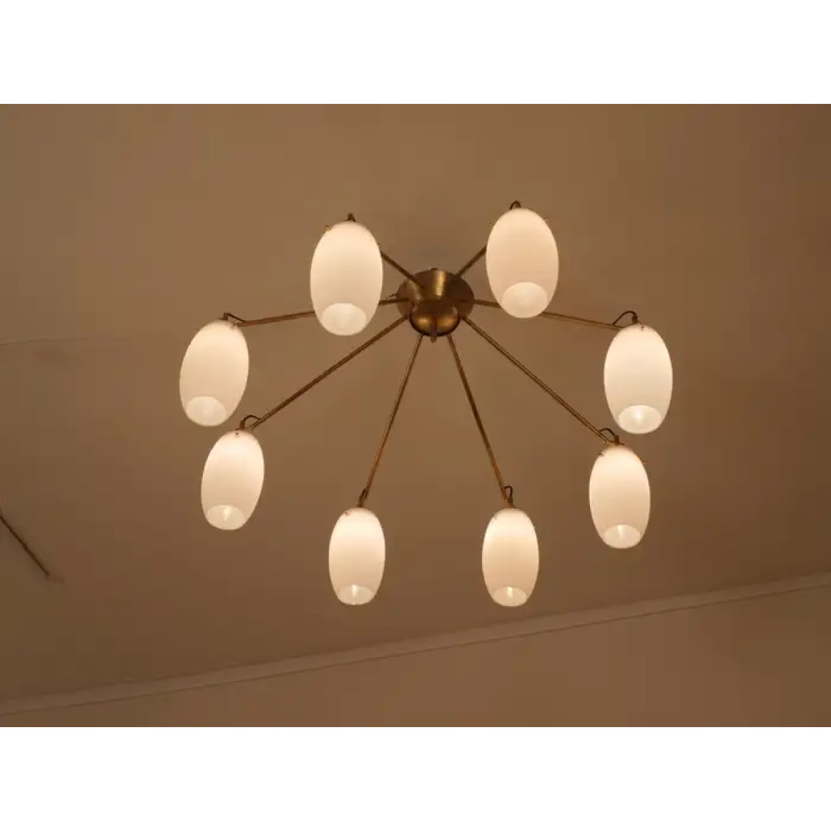 Elegant Stilnovo 8 shade chandelier. Italy c1950. Brass structure with satin glass shades