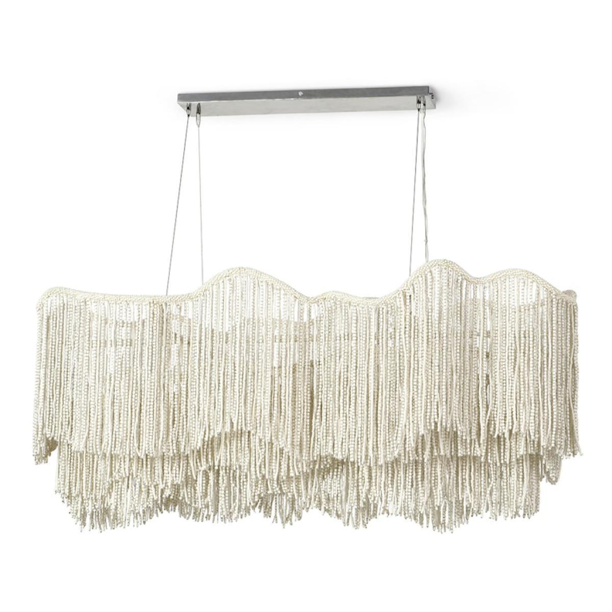 Strands of tiny wood beads in a cream finish embellished with glass beads hand-painted in silver attached to a powder coated white metal frame. Chandeliers come with a brushed nickel plated canopy hanging kit and adjustable cable wires which are easily cut, allowing customizable hanging heights. Professional installation recommended.