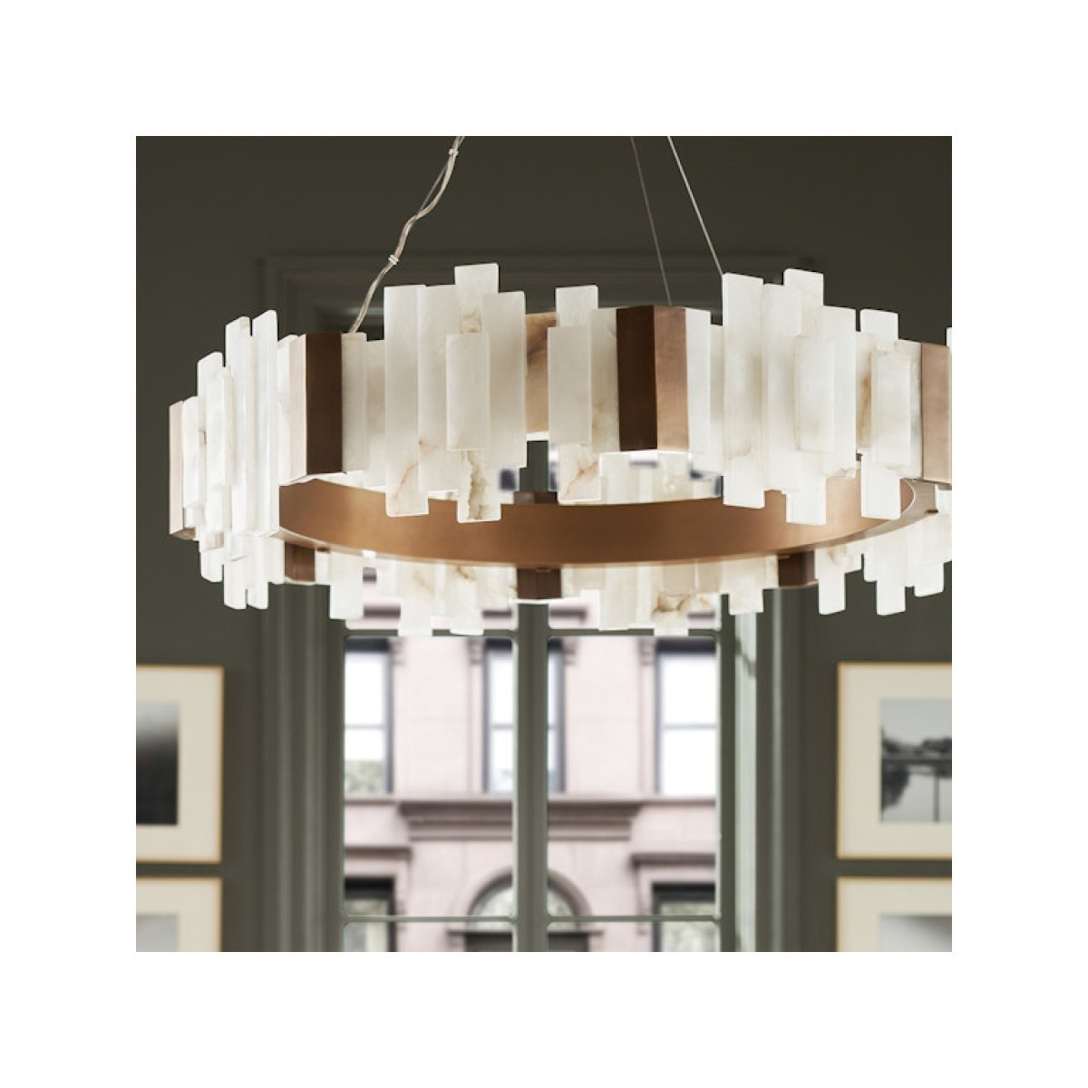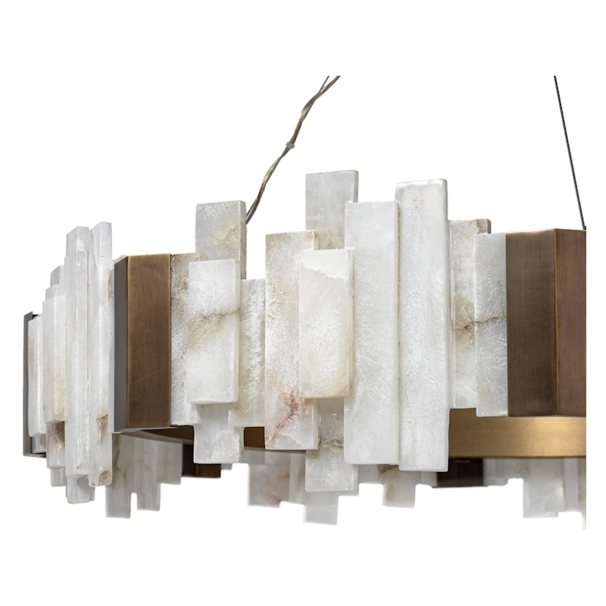Fully adjustable integrated LED chandelier with an antique brass finished aluminum frame featuring sliced alabaster tiles and brass details. Chandelier is complete with an antique brass finished metal canopy hanging kit and adjustable cable wires, which are easily cut, and allows customizable hanging heights. Alabaster is natural material that is sourced from a rare mineral created from a metamorphic rock formation process. The white smoke color is natural and will slightly vary in color and grain, no two pieces will be alike.