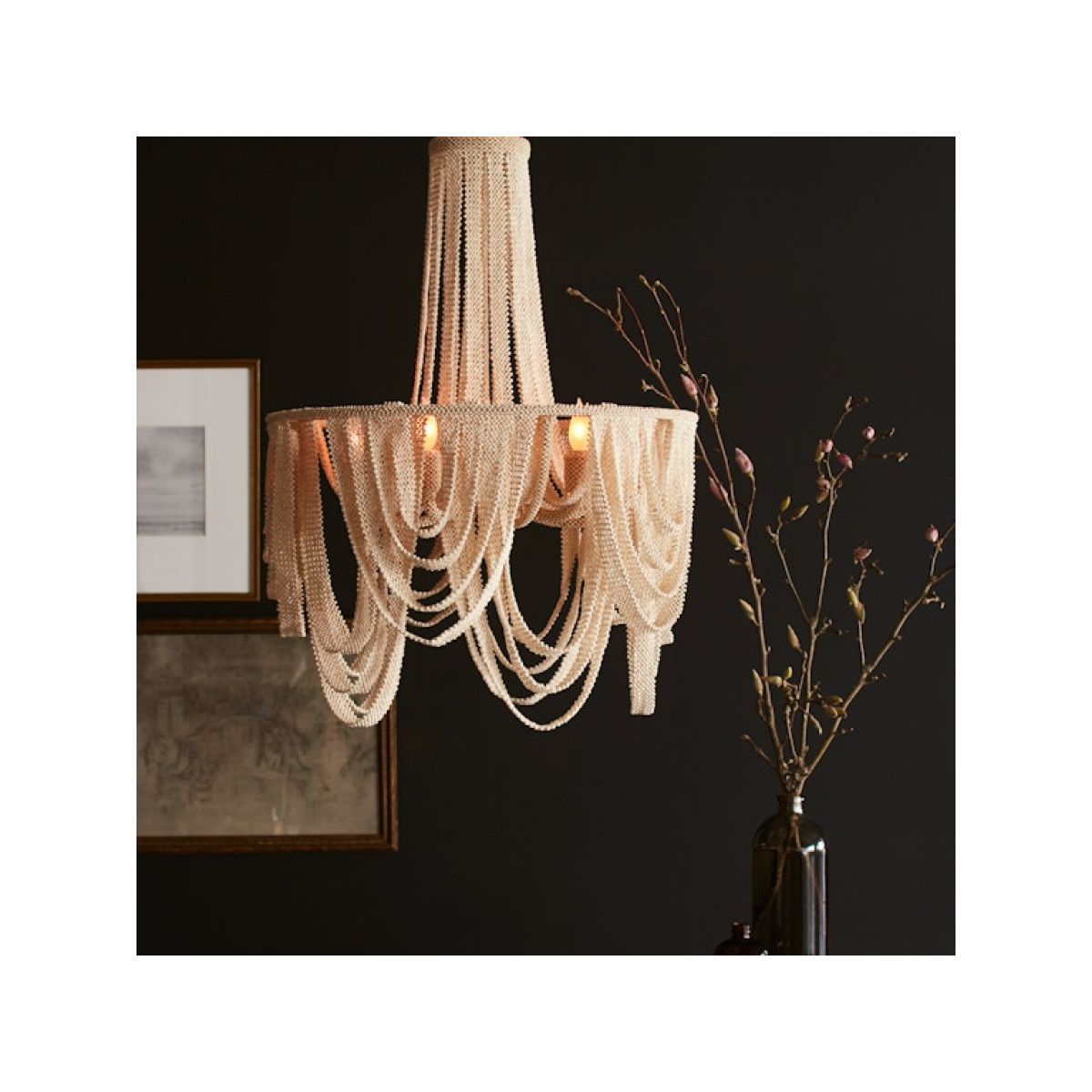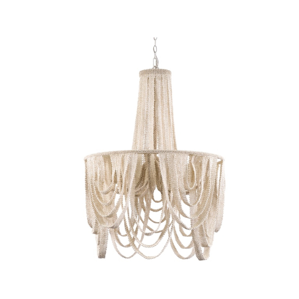 Tiny coco beads hand-sewn into draping ribbons, suspended from a powder coated metal frame. Chandelier comes with an off-white finish chain and canopy hanging kit. Professional installation recommended.