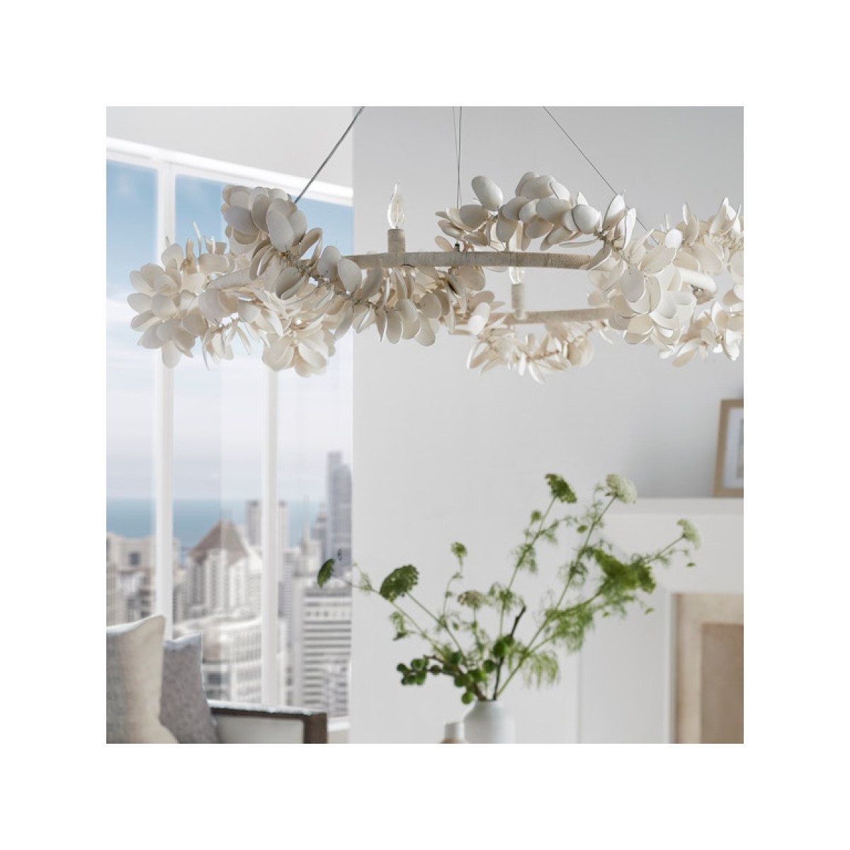 Fully adjustable chandelier features hand-cut petals formed from coco shells in an off-white finish. Natural markings and indentations are part of the inherent beauty of coconut shells and add interest to the piece. Chandelier is complete with an off-white finished canopy hanging kit and adjustable cable wires, which are easily cut, allows customizable hanging heights. Professional installation recommended.