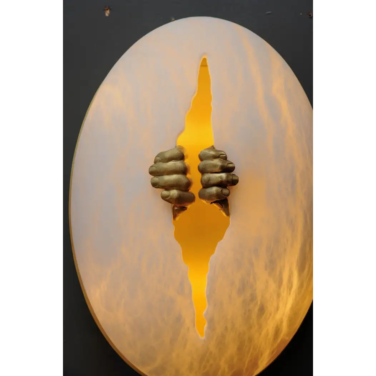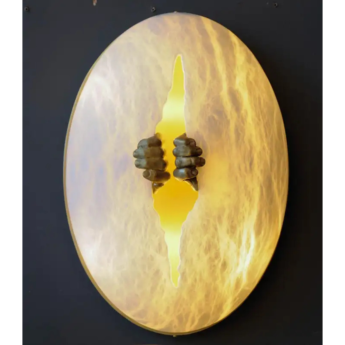New exclusive design by Glustin Luminaires, egg shaped alabaster sconce with a crack carved in the middle spread by a pair of brass hands. Satin brass plate on the back.