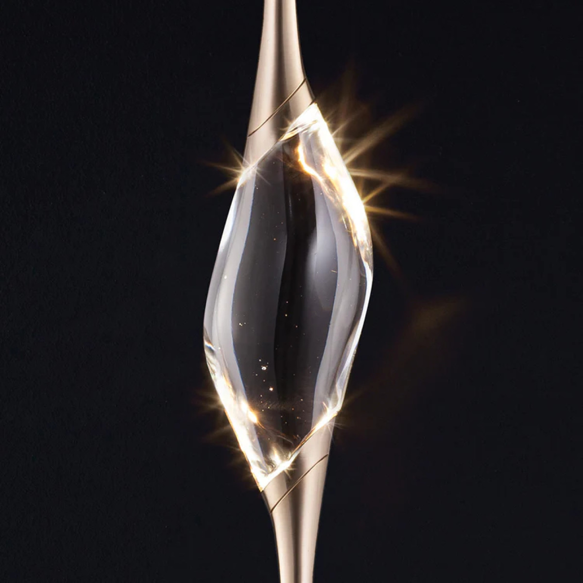 Refined and seductive, Il Pezzo 12 Staggered Chandelier evokes the image of female figures carrying light within. Tapered brass stems house precious crystal diffusers with integrated LED sources, while an additional LED at the tip provides direct illumination. The design is completed by the "Missing Piece" ("Pezzo Mancante") a brass cylinder engraved with a unique serial number for authenticity. Custom sizes and finishes are available.