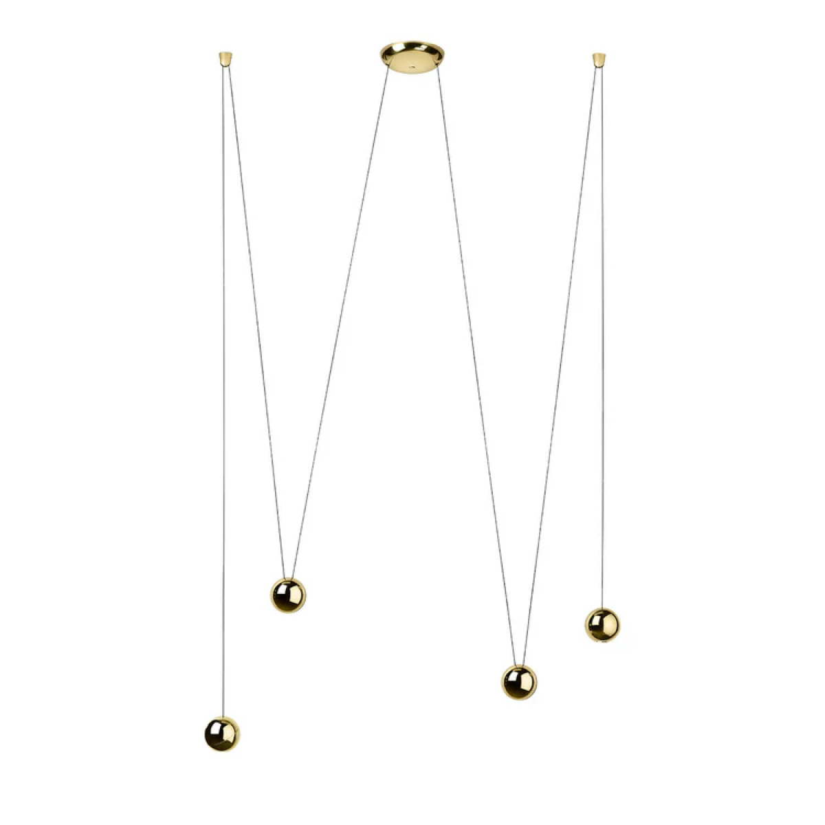 Sfere Double is a pendant lamp with a free interpretation of space, where four brass spheres, archetypal and elementary forms, can achieve various configurations, in a balance of counterweights where the wirings are exposed, and the light that comes with a little mystery from the various spheres expands or concentrate depending on the positioning of the individual sources. Details: ceiling rose diam 25 cm, spheres diam 12 cm, cable 5 m (x2), LED included.