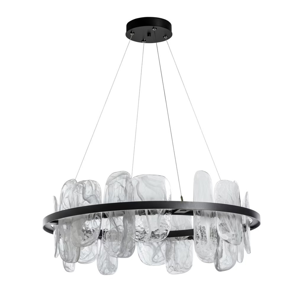 The Vitre Circular LED Pendant is ideal for a great room, grand foyer or any space that requires a focal piece. This grand lighting pendant is cable-hung and features unique, handmade slabs of clear glass with abstract white "swirls" that give depth and add beauty to this chandelier. Each vertical piece of glass looks organic in form, yet is slotted into the LED light-guide which provides a wash of up-and-down light. Also available as a large linear pendant.