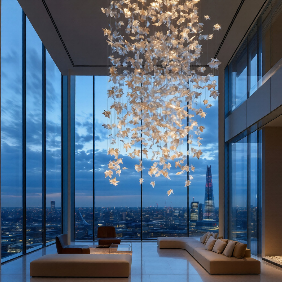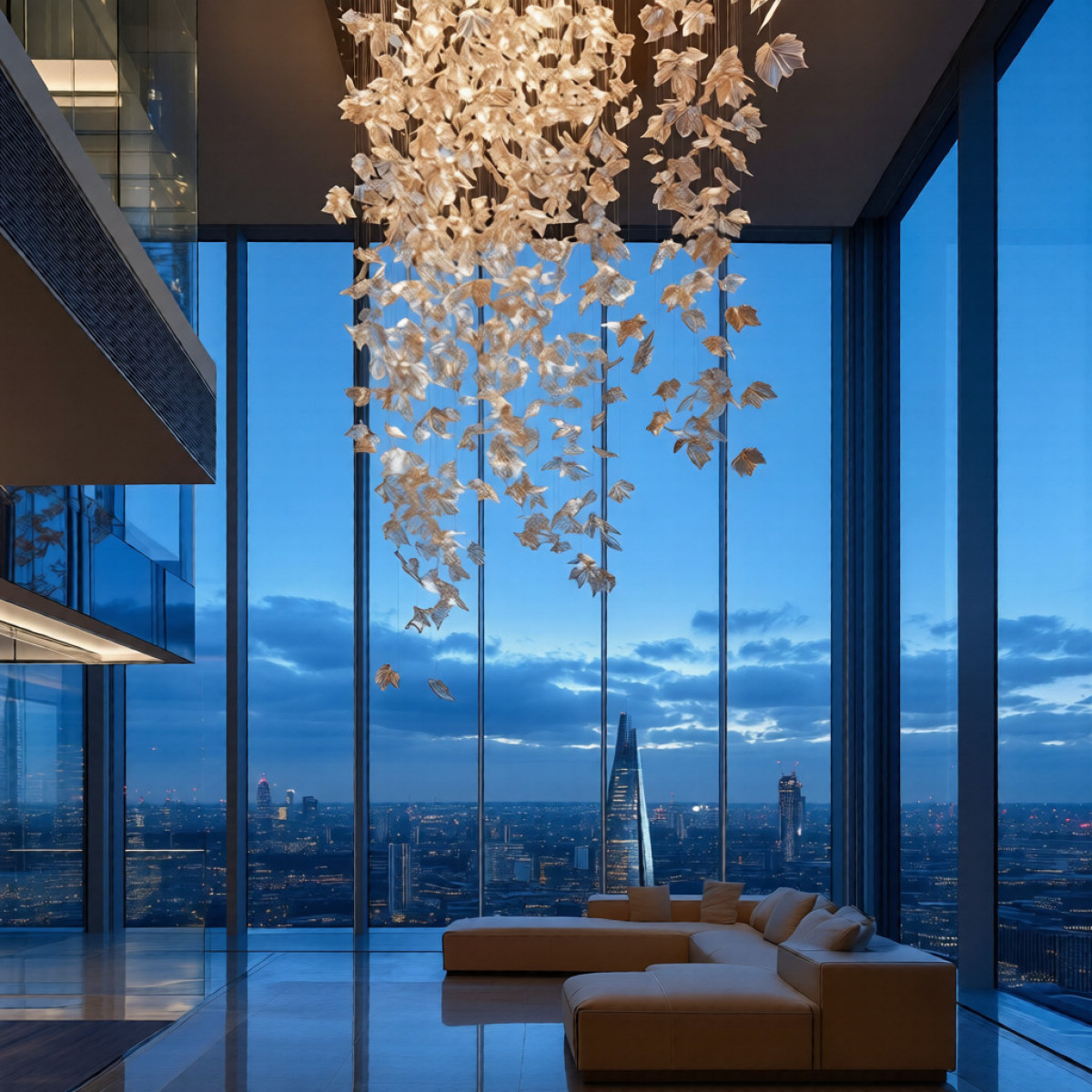 This chandelier is a dramatic cascading installation composed of hundreds of delicate, leaf-like elements suspended at varying heights, creating a floating, organic form. Warm, golden illumination reflects through each piece, producing a shimmering effect that feels both airy and luxurious. Its sculptural design transforms the space into a statement of modern elegance, almost resembling illuminated leaves drifting in midair.