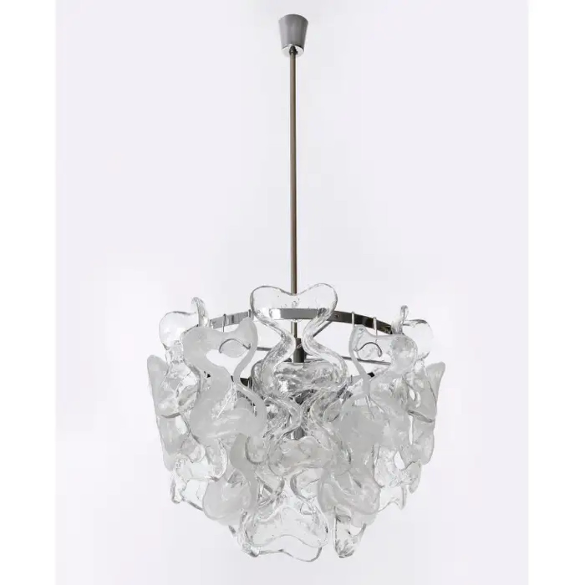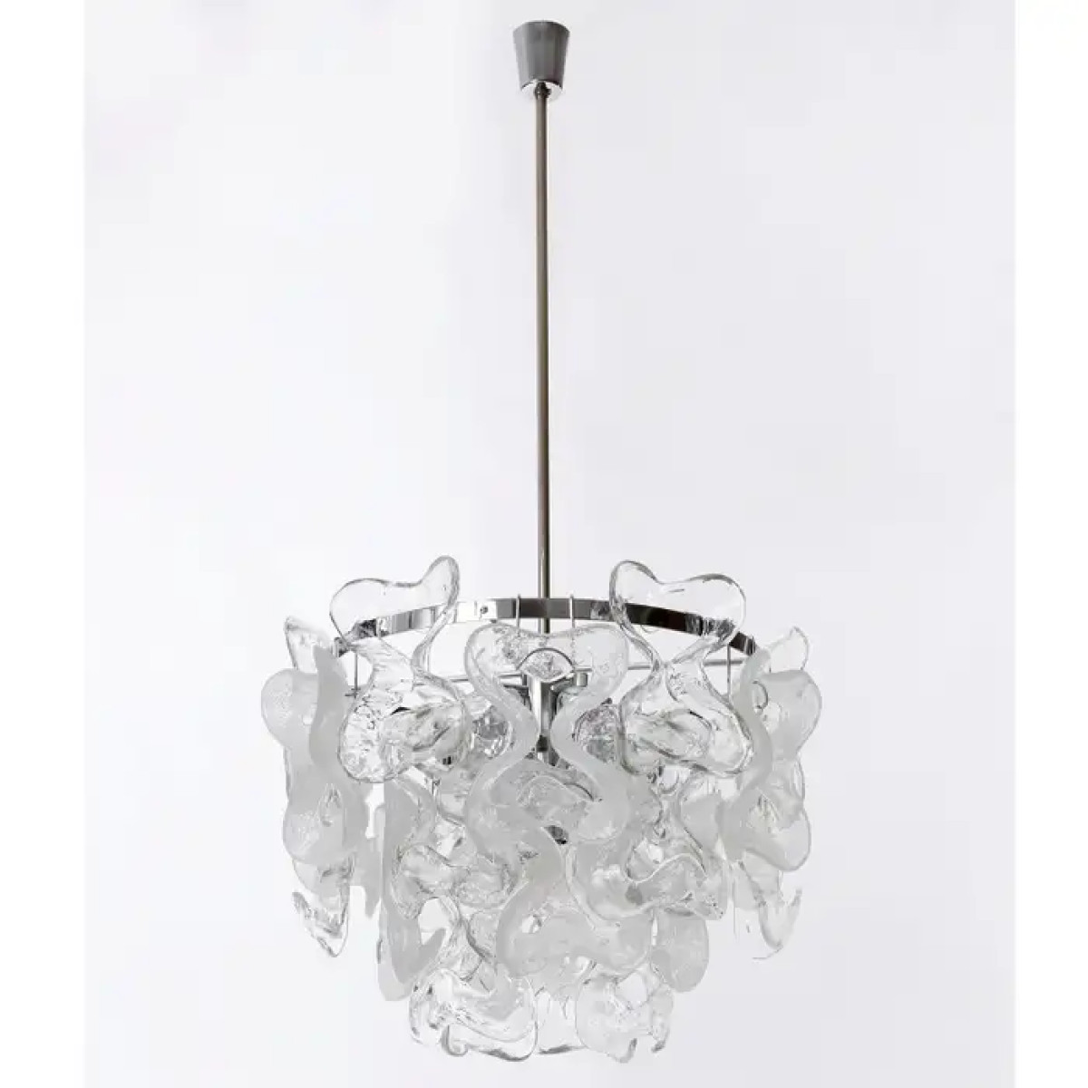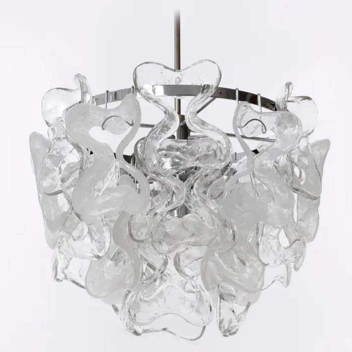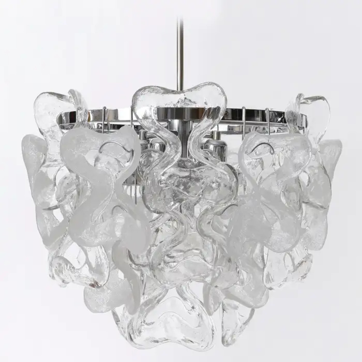 A large and fantastic Mid-Century modern light fixture model 'Catena manufatured in 1970s-1980s. It consists of a polished chrome frame with 30 organic and ribbon-shaped Murano glass pieces. 20 are made of clear crystal glass and 10 white foam bubble glass.