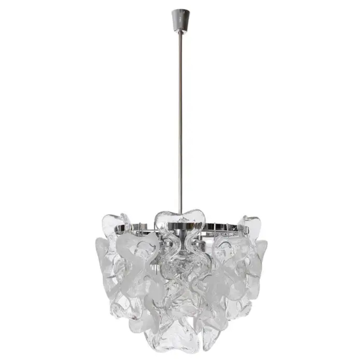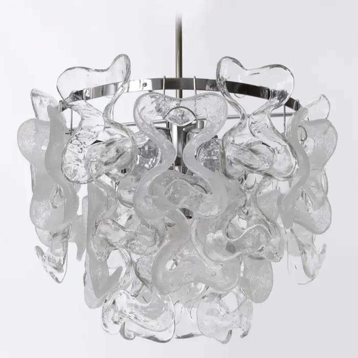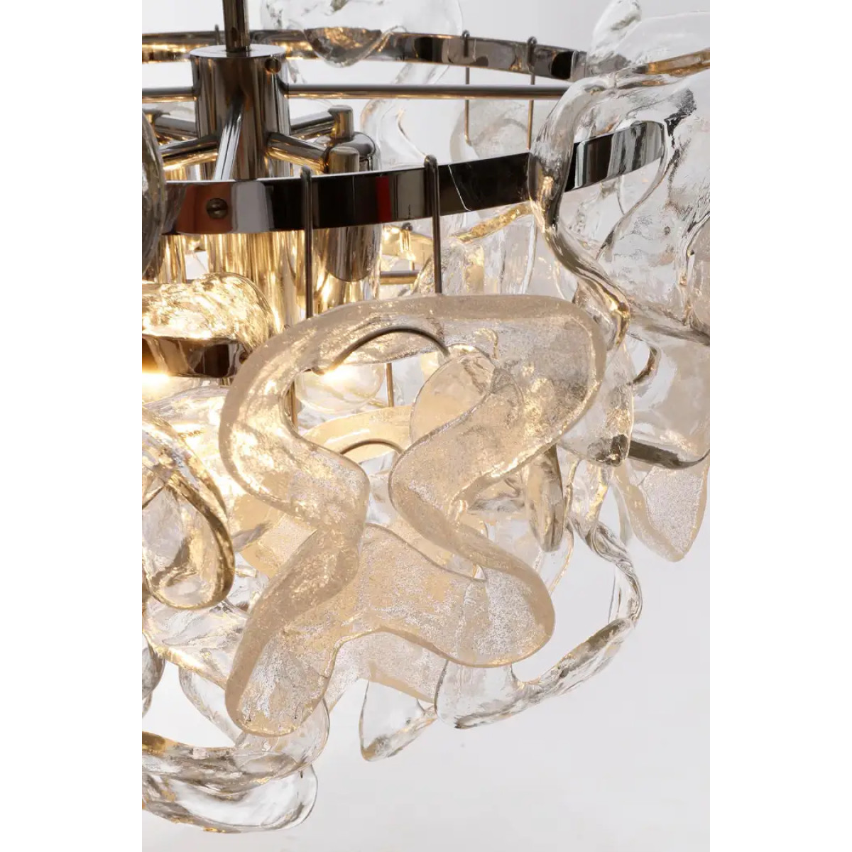 A large and fantastic Mid-Century modern light fixture model 'Catena manufatured in 1970s-1980s. It consists of a polished chrome frame with 30 organic and ribbon-shaped Murano glass pieces. 20 are made of clear crystal glass and 10 white foam bubble glass.