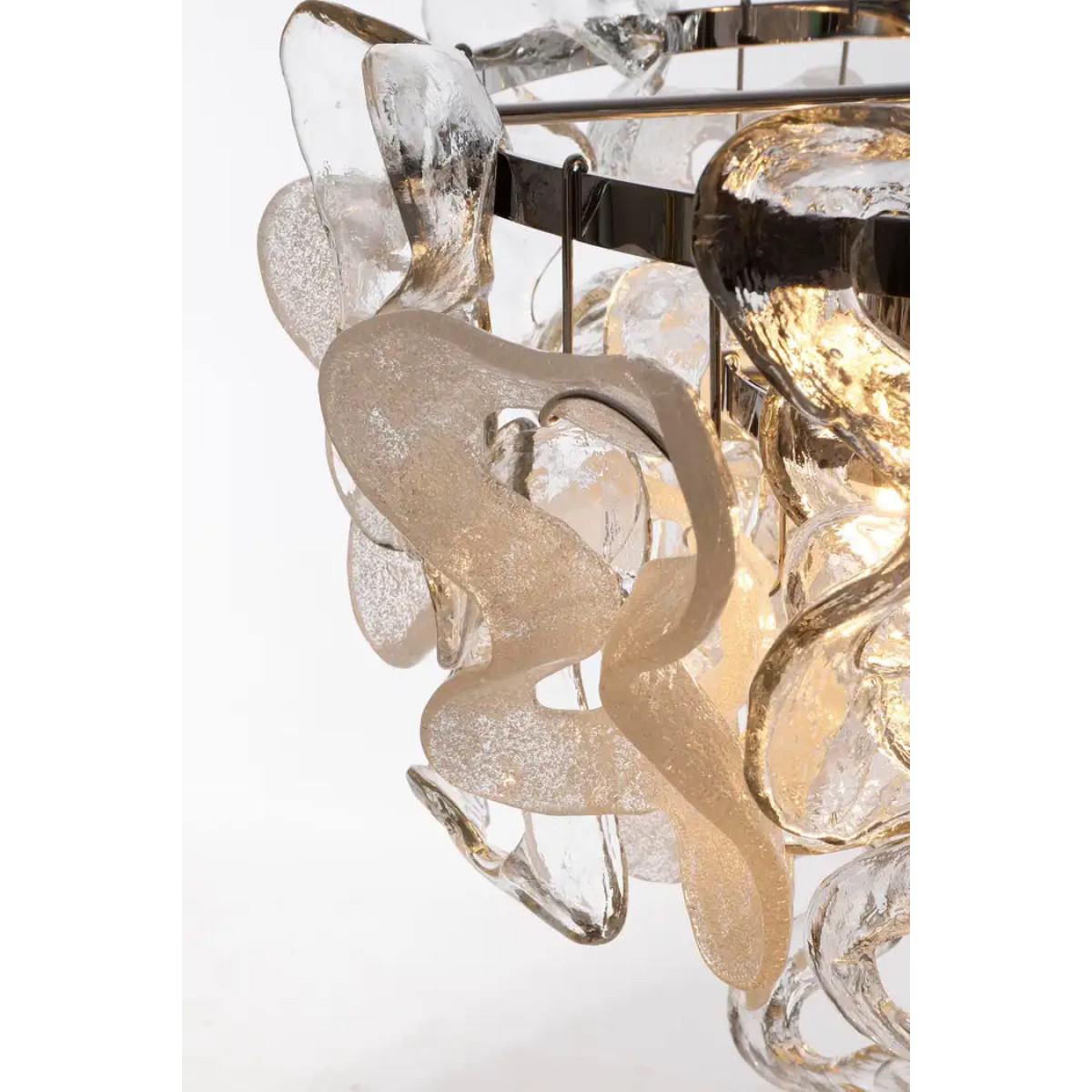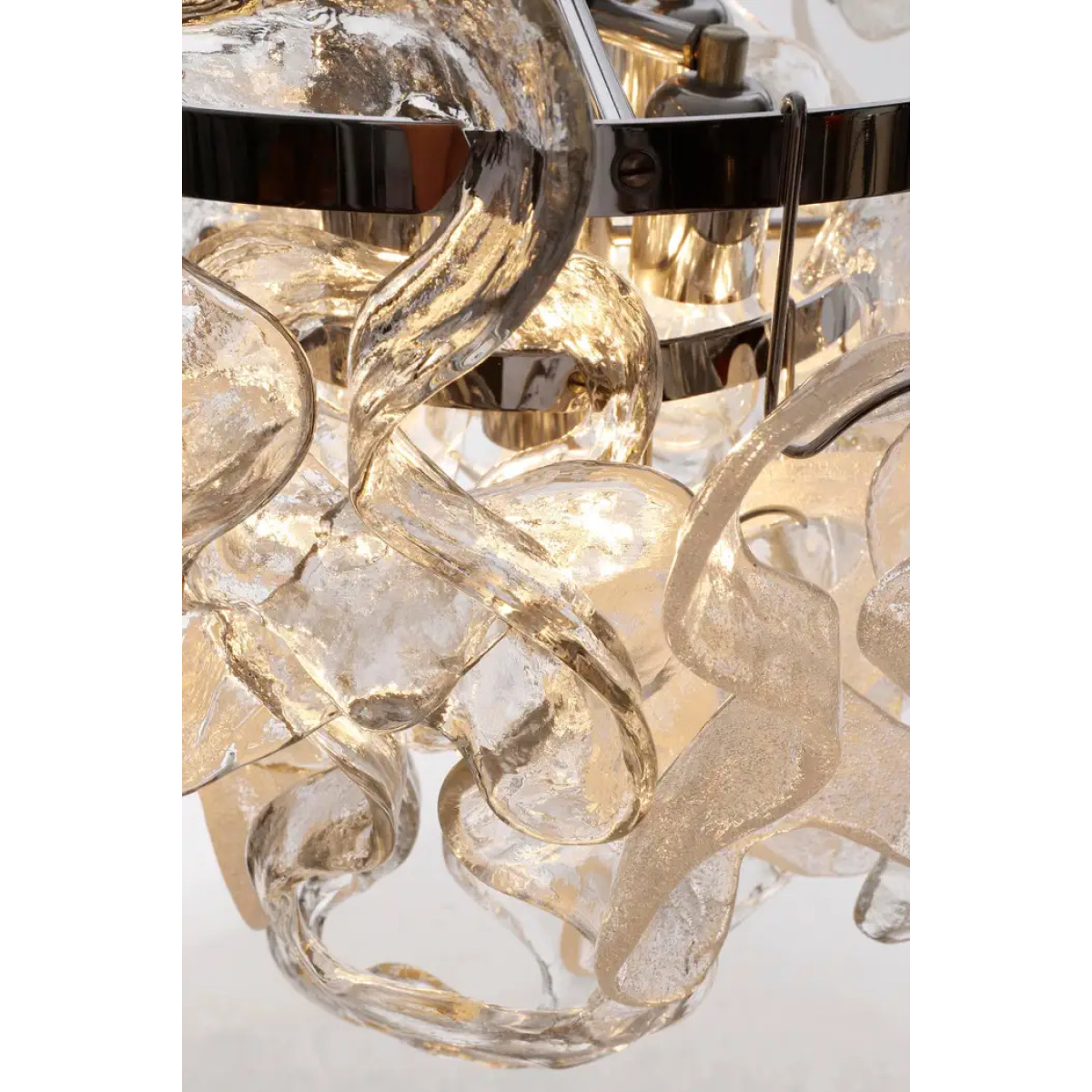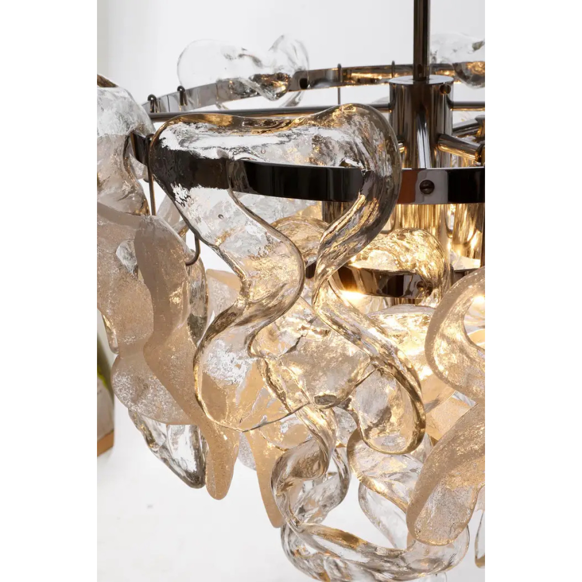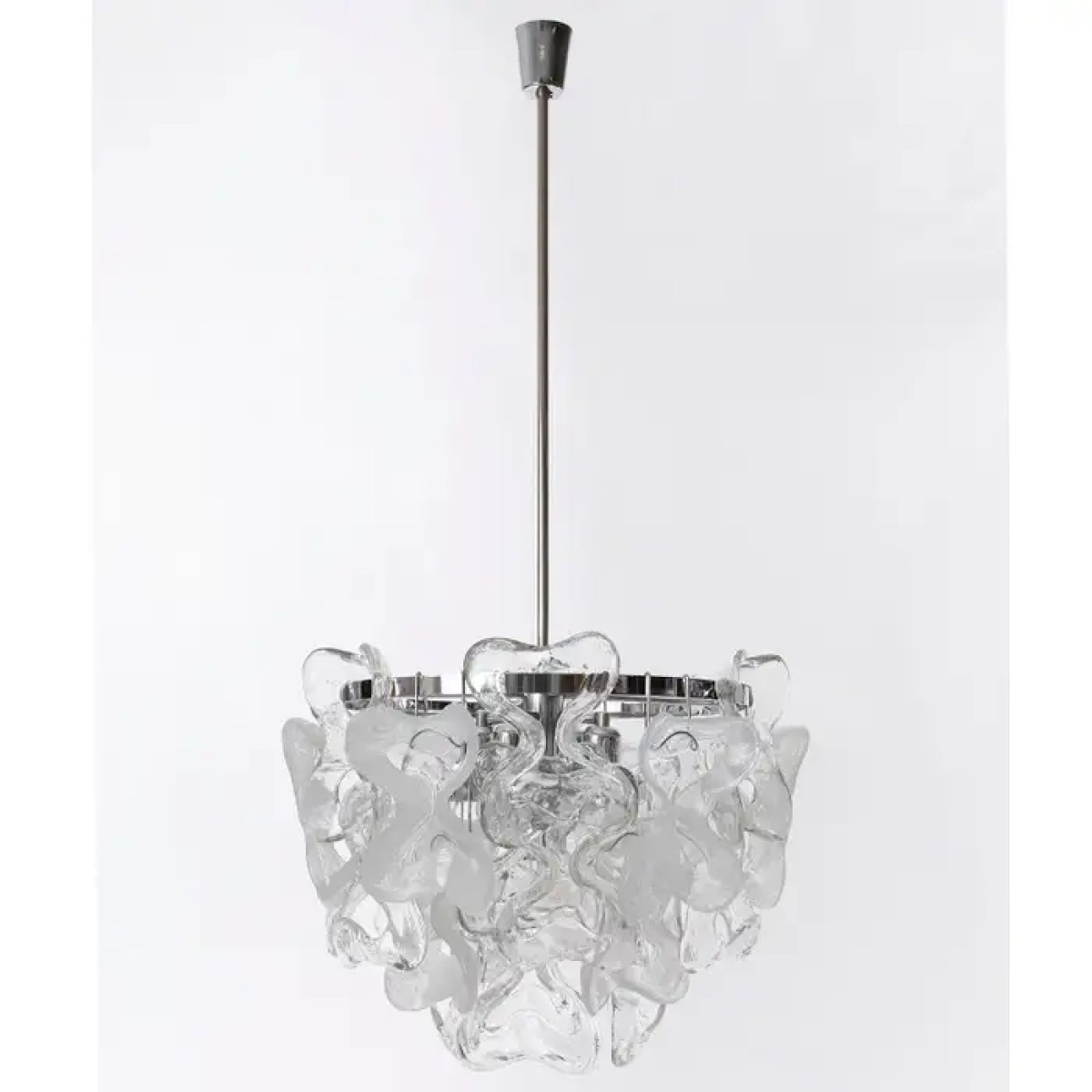 A large and fantastic Mid-Century modern light fixture model 'Catena manufatured in 1970s-1980s. It consists of a polished chrome frame with 30 organic and ribbon-shaped Murano glass pieces. 20 are made of clear crystal glass and 10 white foam bubble glass.