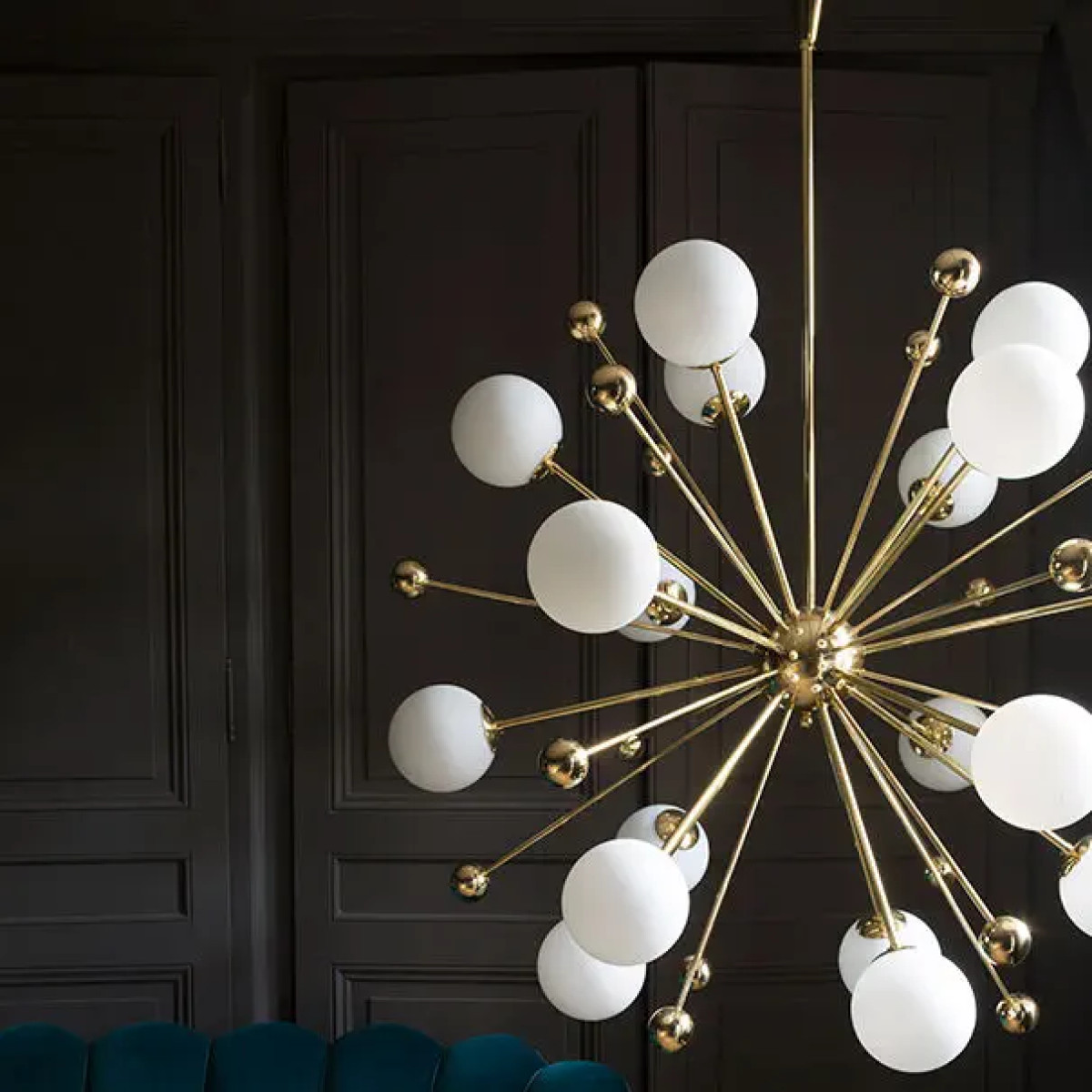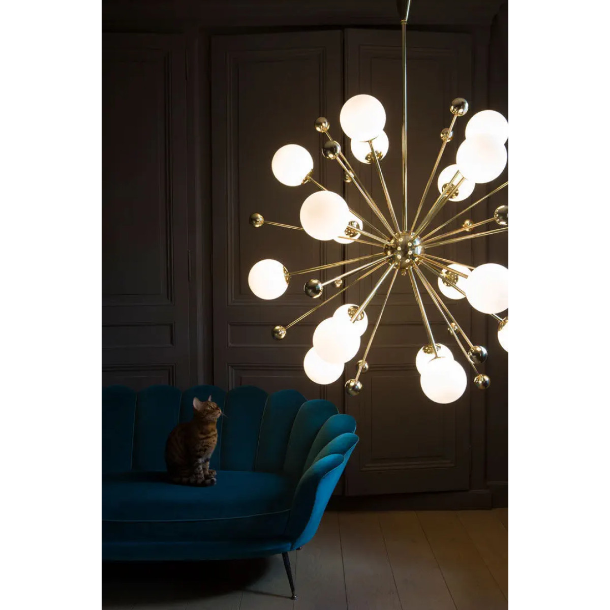 This theatrical lighting piece of imposing volume offers a floating deconstruction of the 20th century Sputnik space probe through the association of brass with hand blown glass in an explosion of excitement. The contrast between the air-light hand blown spheres and the density of the brass spheres challenges our perception of weight and weightlessness.